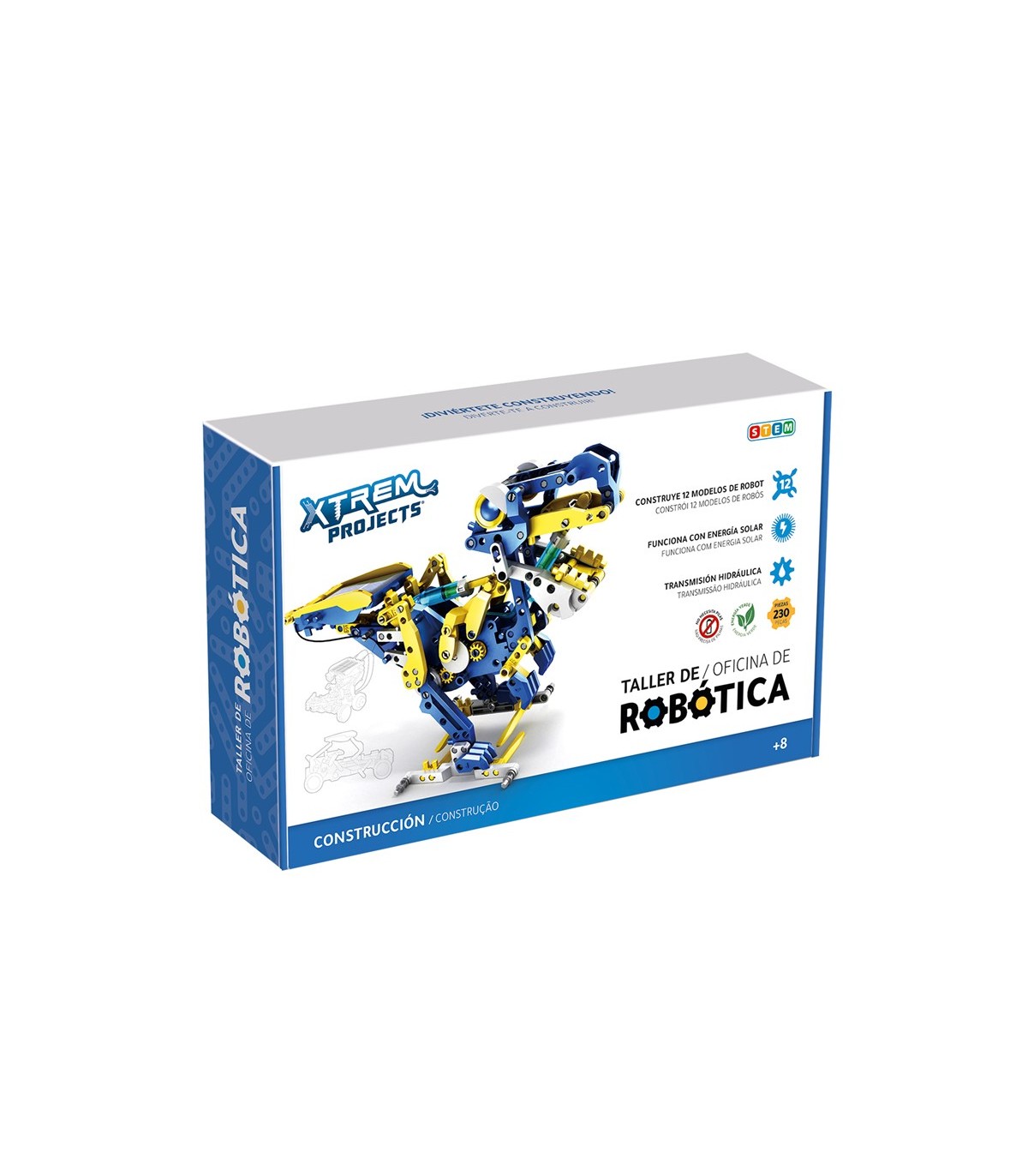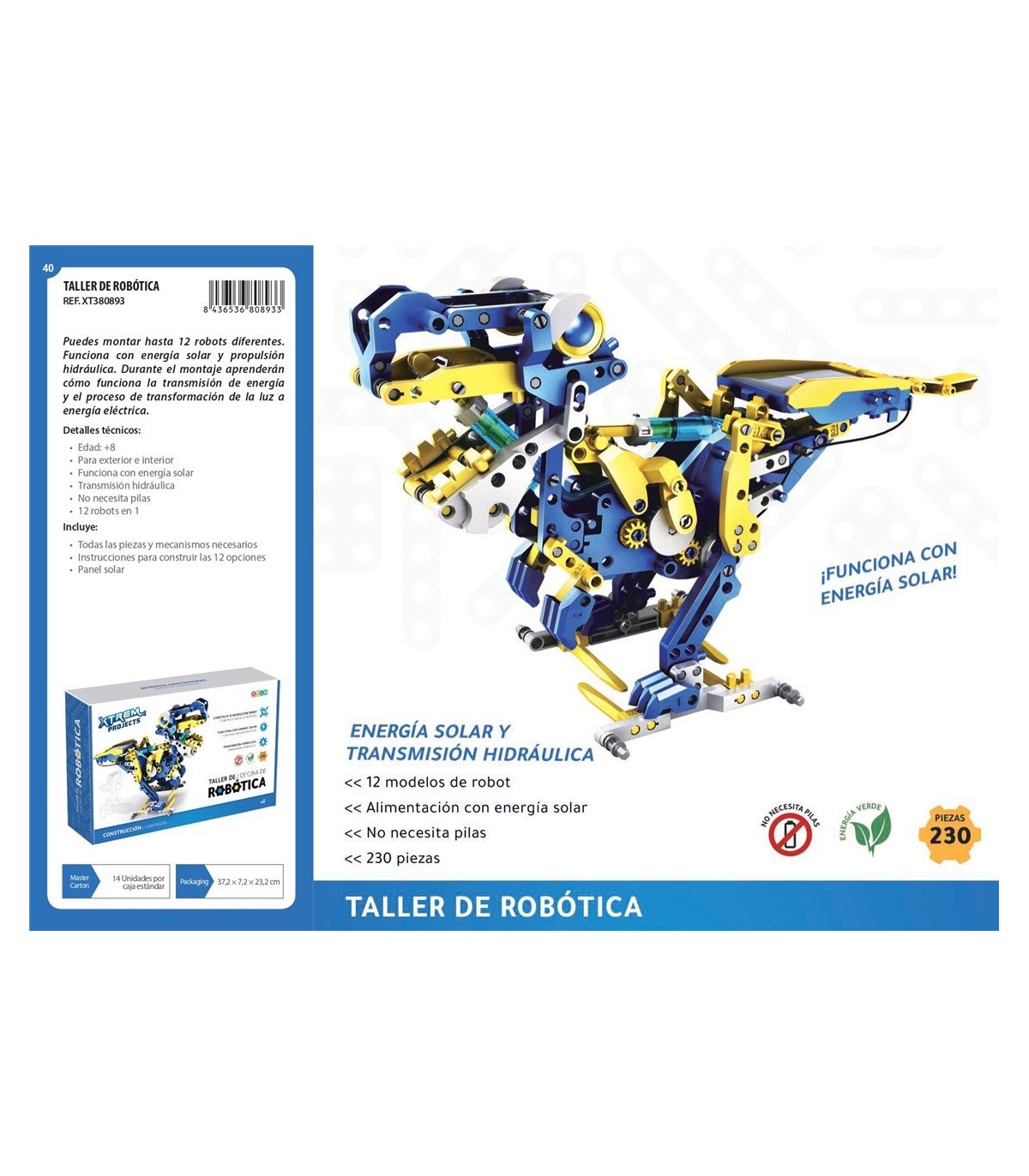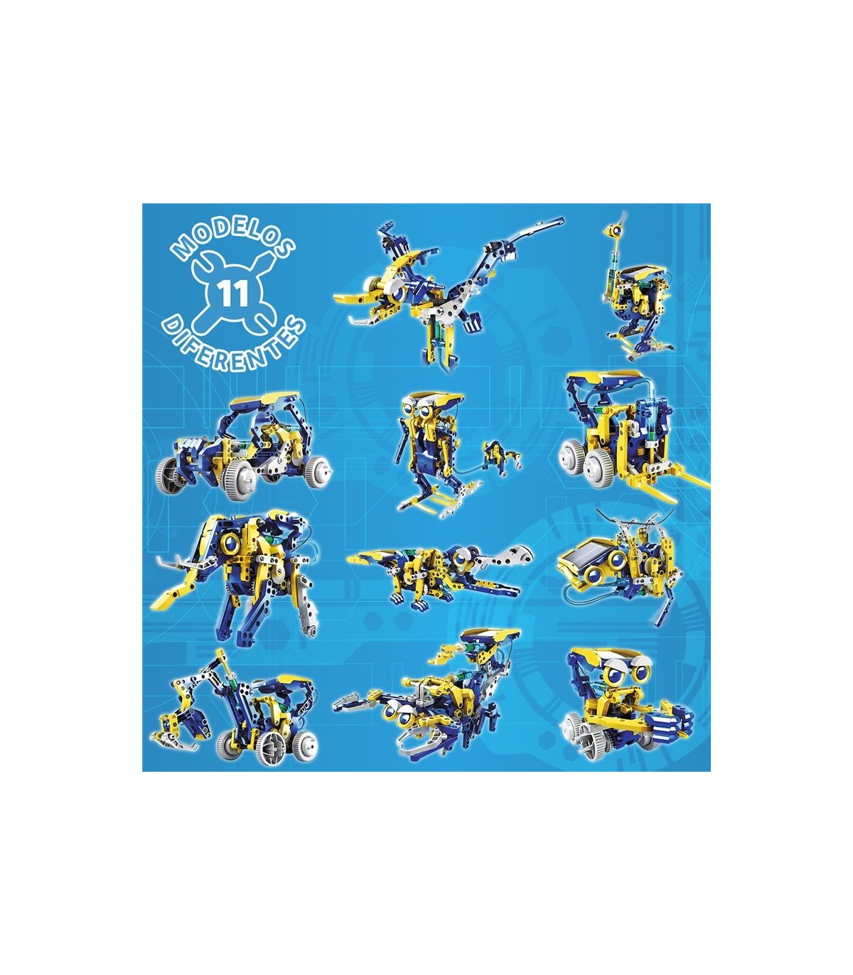 Puedes montar hasta 12 robots diferentes. Funciona con energía solar y propulsión hidráulica. Durante el montaje aprenderán cómo funciona la transmisión de energía y el proceso de transformación de la luz a energía eléctrica.