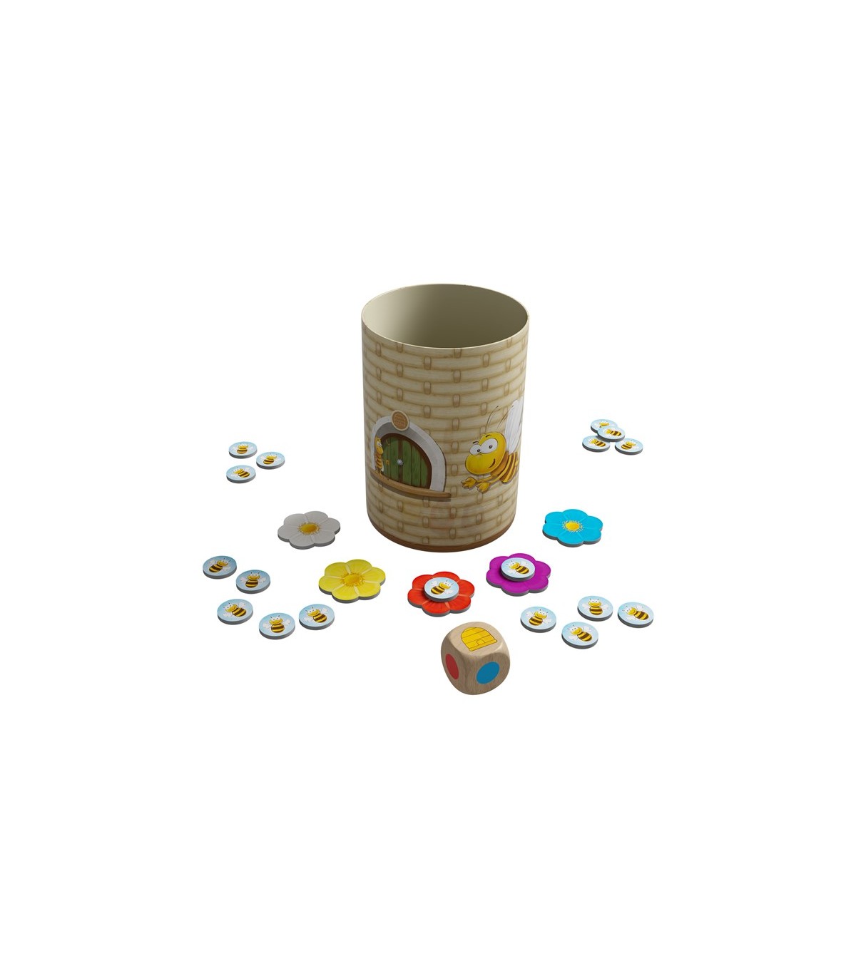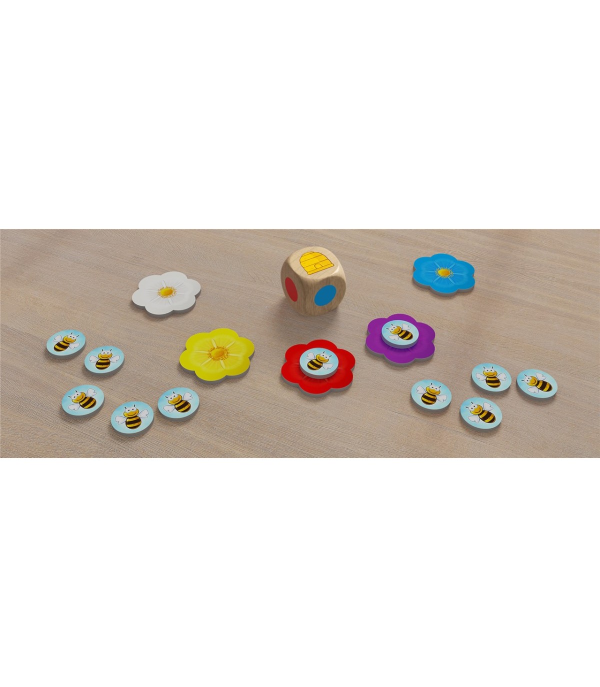 En este juego debemos lograr que todas nuestras abejas sean las primeras en volar hasta la colmena (el cubilete) o hasta las flores. Para ello, por turnos se lanza el dado de colores y en función del color resultante podremos desplazar una de nuestras abejas o deberemos dejarlas donde están.