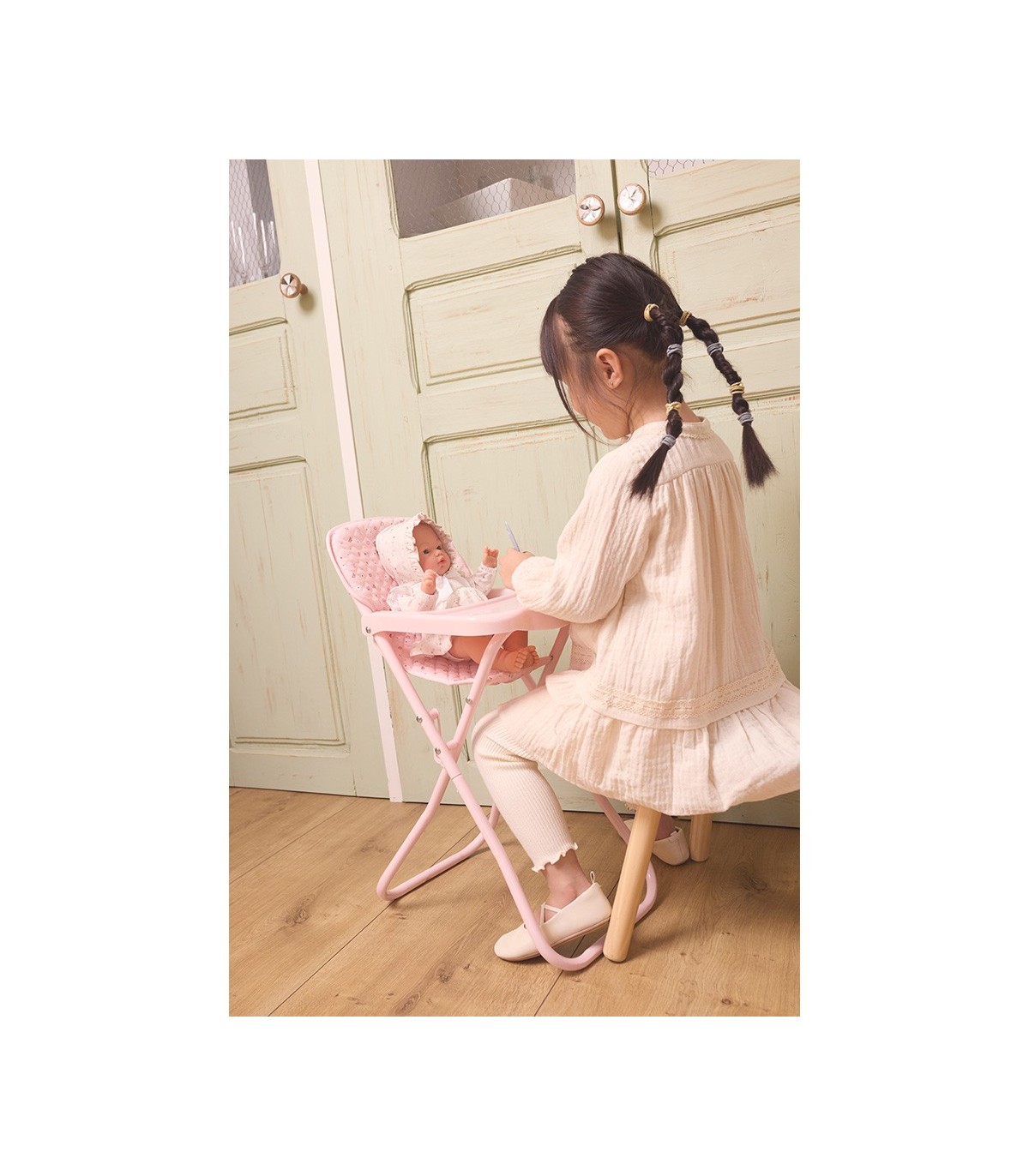 Haz que la hora dar de comer a tus muñecos sea aún más especial con esta preciosa trona plegable para muñecos de Monnëka, ideal para peques que disfrutan imitando las rutinas del día a día. Gracias a su diseño funcional esta trona es perfecta para alimentar a muñecos o peluches con total comodidad.