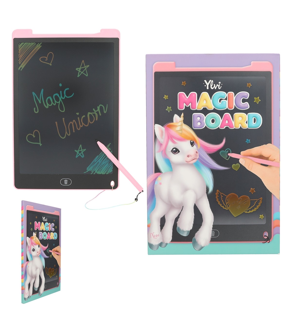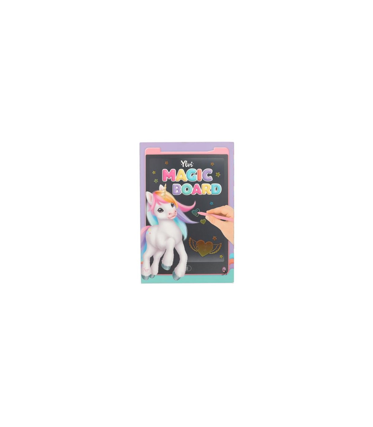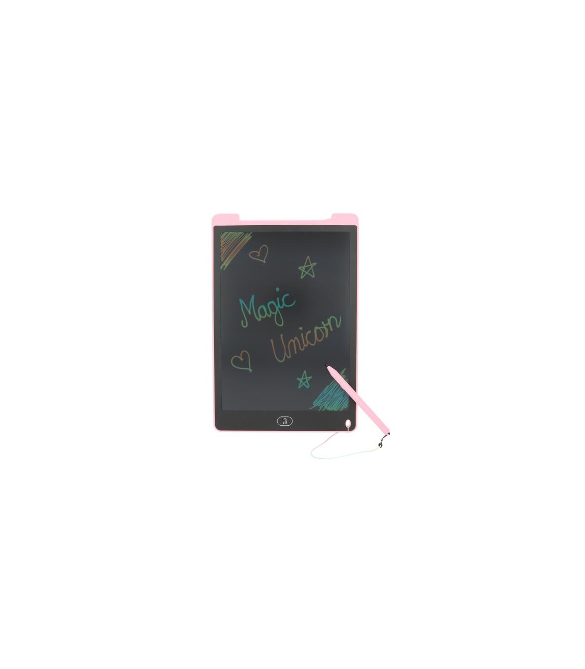 Para que la creatividad no decaiga. El lápiz que se sujeta en el lateral de esta pizarra de Ylvi con pantalla LCD permite escribir o dibujar en amarillo, naranja, verde y azul. Con tecla de borrado y botón de seguridad para impedir que se borre por error. La parte trasera de esta pizarra rosa (con pantalla de 12 pulgadas) está decorada con un precioso arcoíris grande, un unicornio y su mágico amigo peludito. Pilas incluidas.