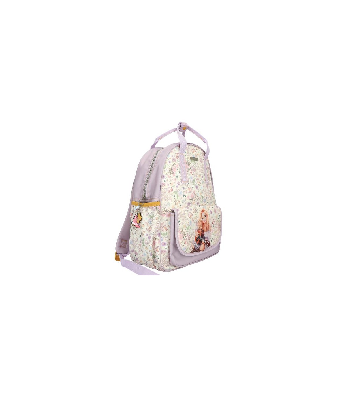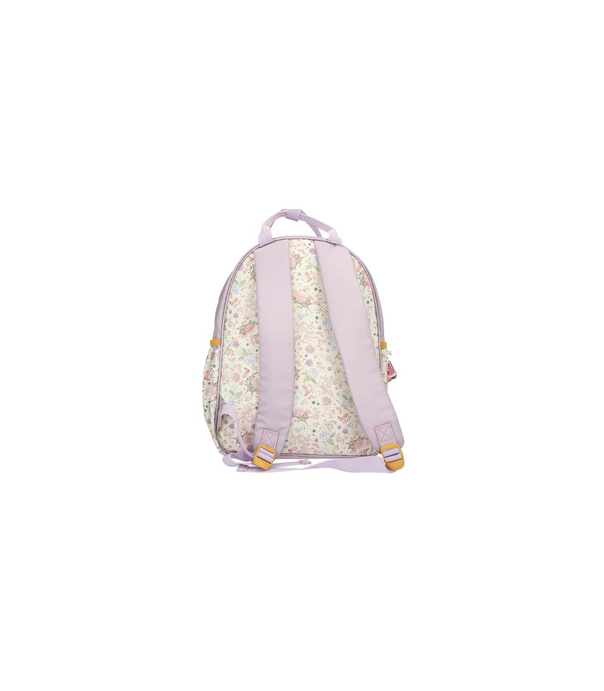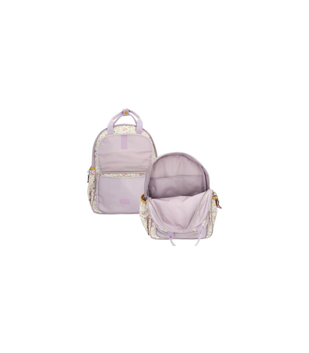 Con dos bolsillos laterales, tirantes acolchados ajustables, correa estabilizadora al pecho y asas.