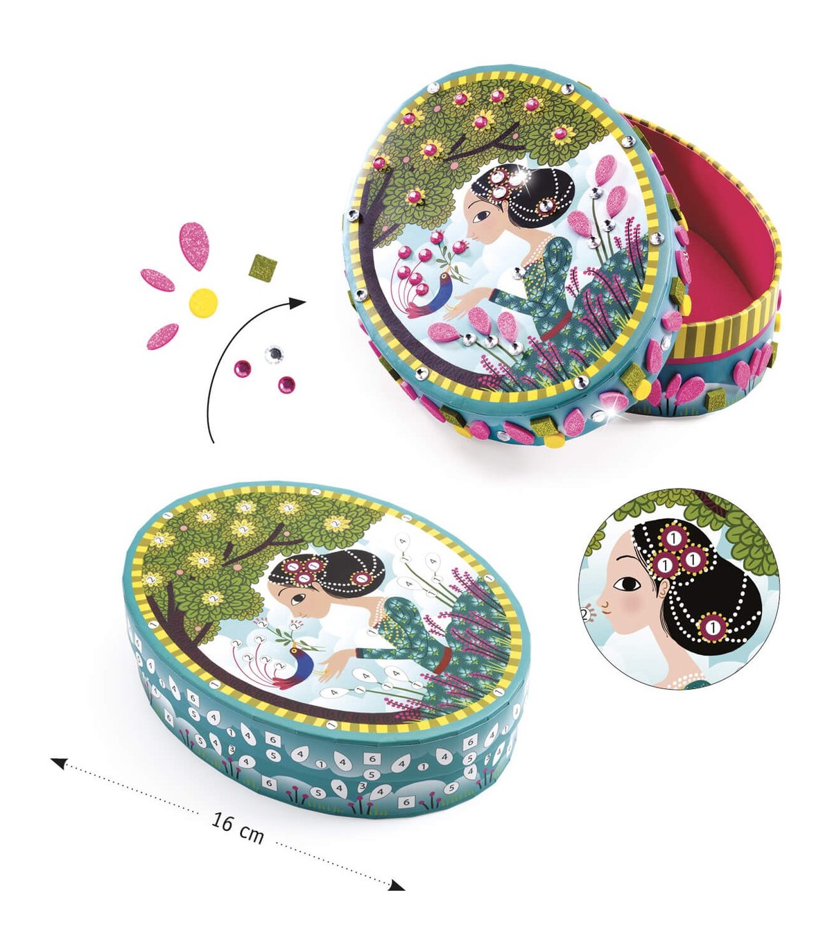 -¡Todos tenemos nuestros pequeños secretos! Este kit creativo propone decorar una caja secreta con pegatinas de mosaicos con purpurinas y pegatinas de «piedras preciosas». El niño ve los números en la caja y pega las pegatinas correspondientes. Una vez terminada, solo tiene que introducir sus pequeños secretos.