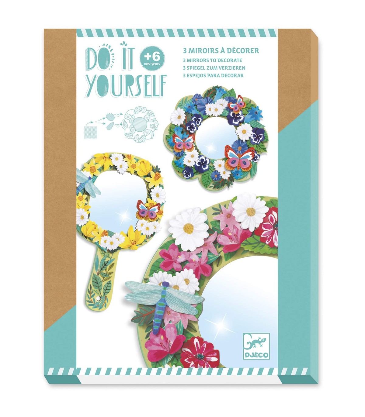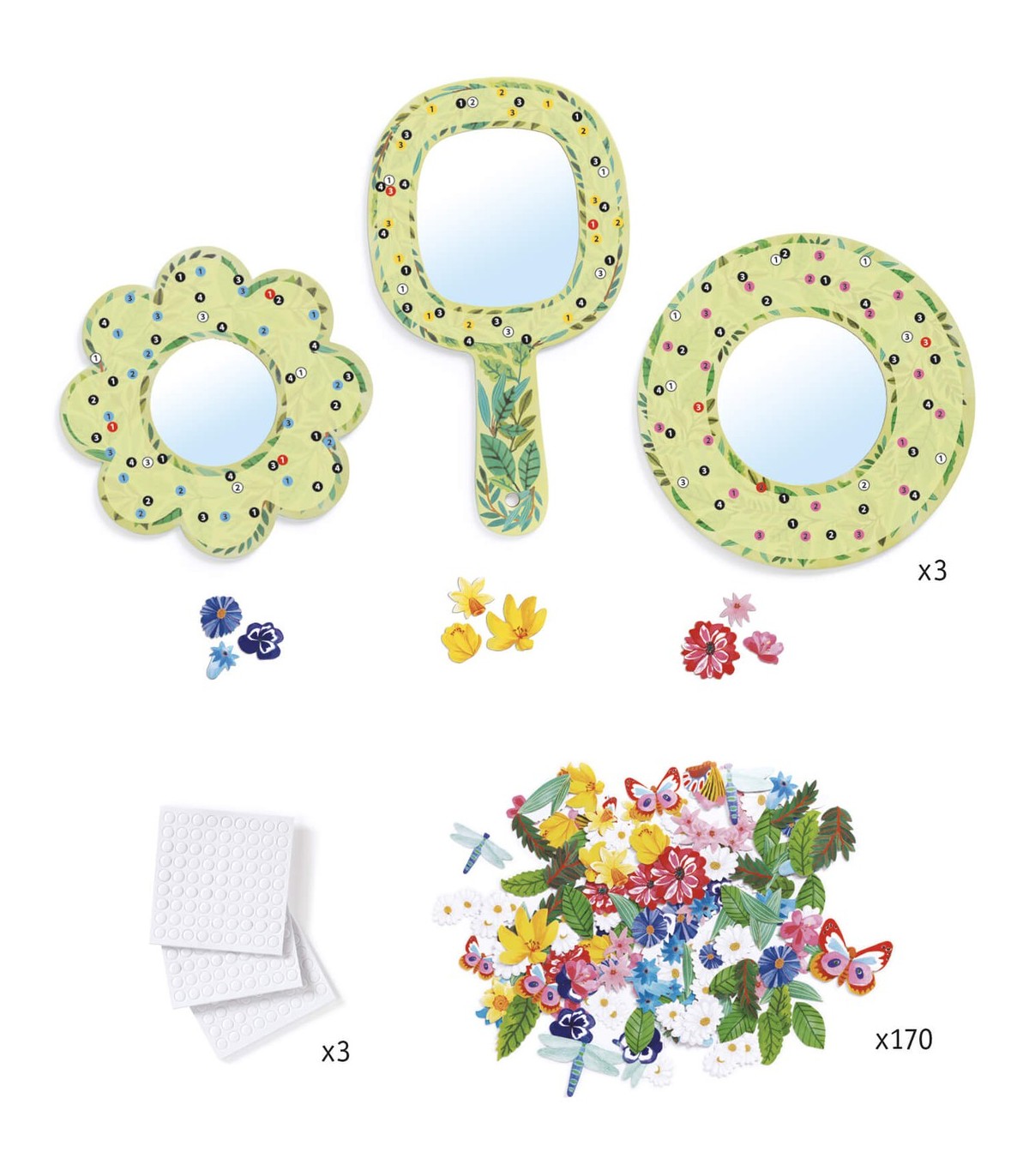 -Un kit creativo con 3 espejos a juego para decorar. Usando las pegatinas de espuma gruesa, el niño pega los diferentes adornos florales. Capa tras capa, los espejos adquieren volumen y se adornan como bonitas coronas de flores. Pueden usarse como objetos decorativos, bien colgados en una pared.