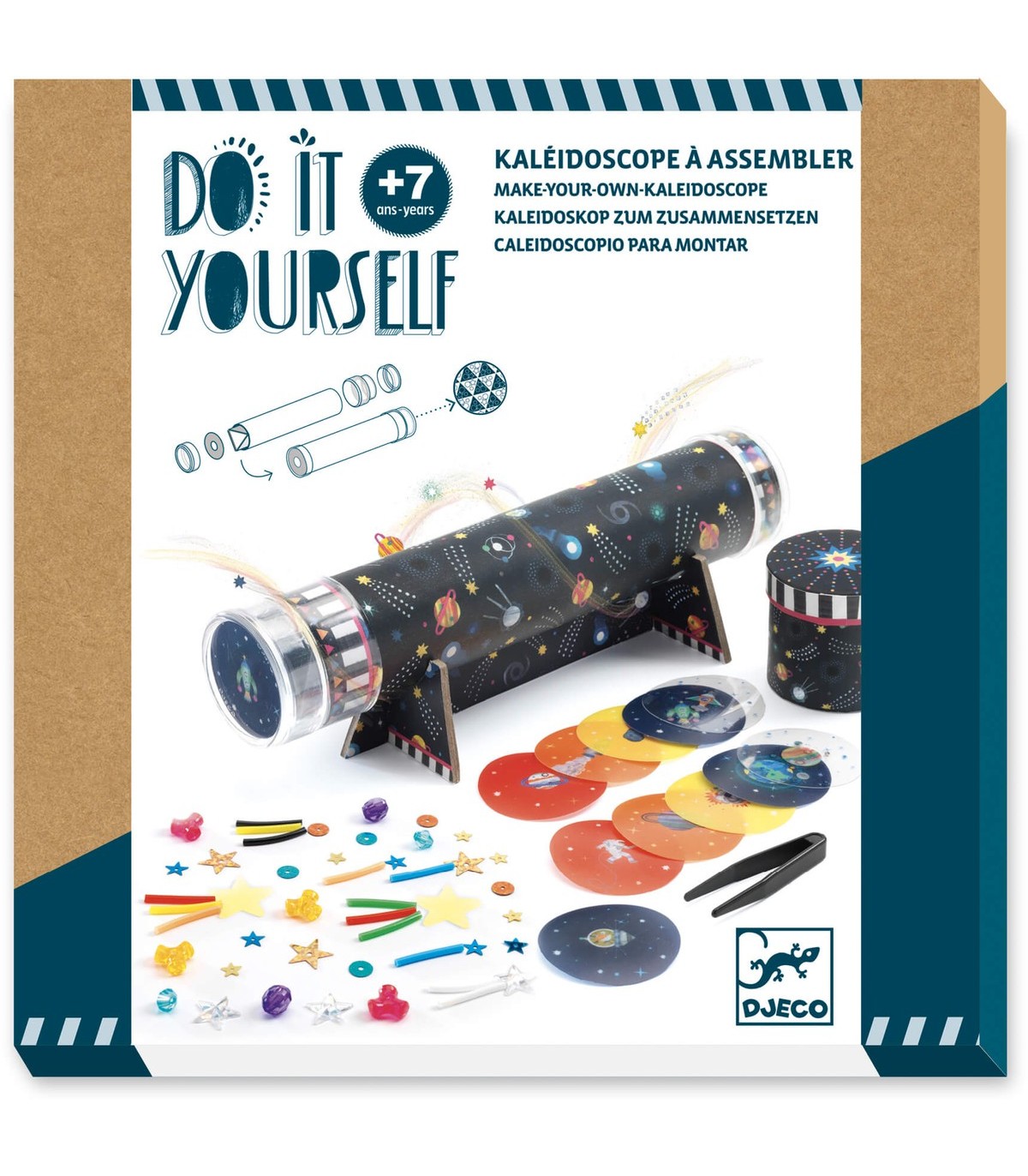 -Un completo kit creativo para crear un caleidoscopio sobre el tema del espacio. El niño sigue los pasos detallados en las instrucciones y monta las piezas según las instrucciones. Luego, dispone de más de 50 accesorios para experimentar con múltiples combinaciones de motivos (estrellas fosforescentes, discos ilustrados de naves espaciales, planetas, etc.), para una inmersión total en el tema.