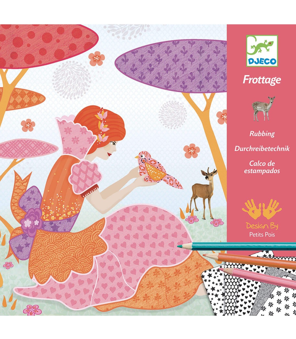 -El niño elige y coloca un tablero de patrones bajo las zonas blancas de la hoja y lo frota con los lápices de colores. ¡Los patrones aparecen y suena mágico!