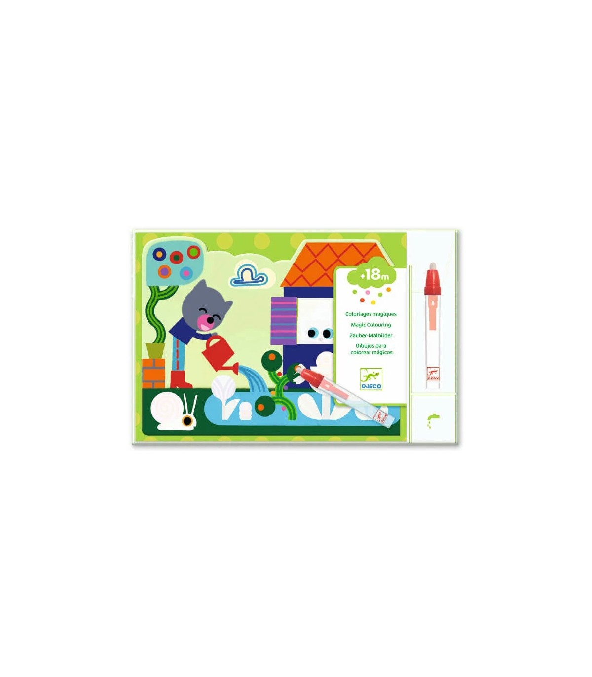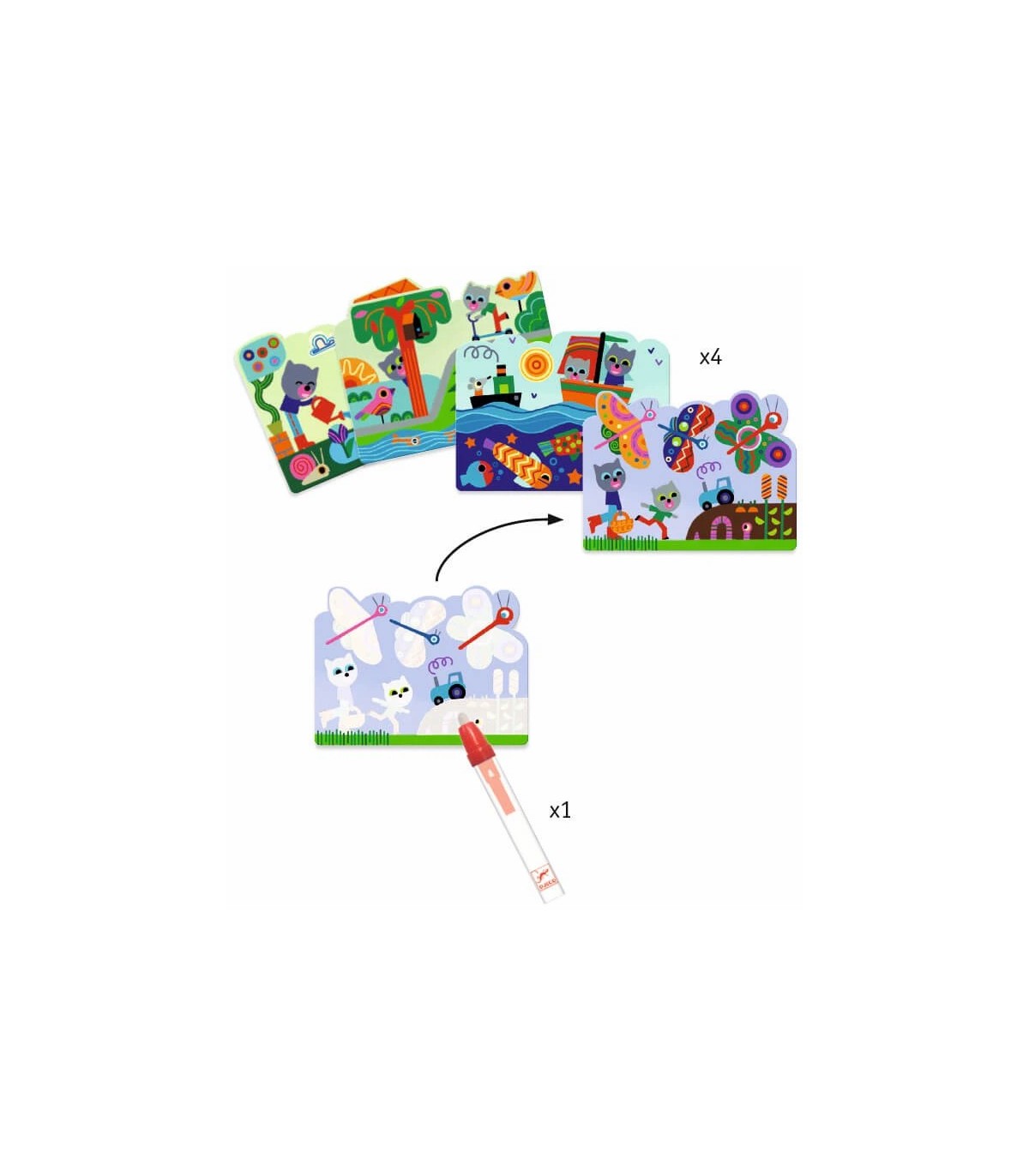 Un pack de acuarelas adecuado para niños a partir de 18 meses. El niño colorea las partes blancas con el lápiz de agua para descubrir lo que se esconde en el cielo. Es mágico: los dibujos aparecen y cambian de color. Las tablas se secan y el niño vuelve a empezar.