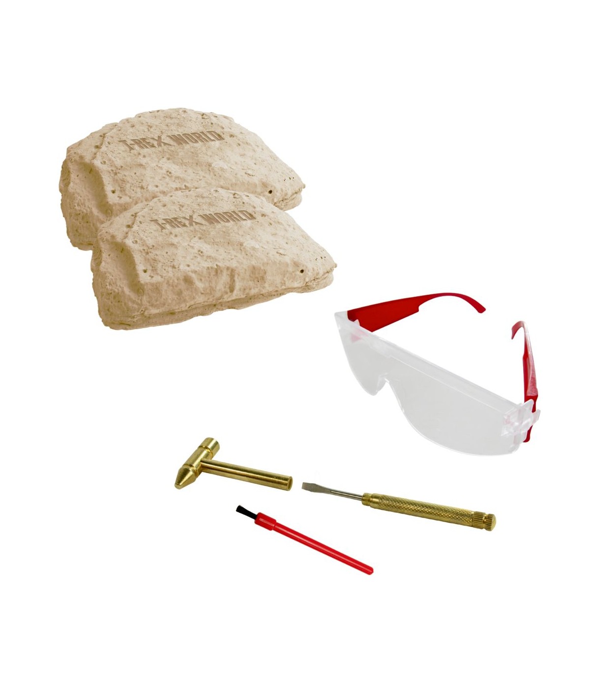 Gran juego de excavación para arqueólogos aficionados avanzados y fanáticos de los dinosaurios. Cuenta con un esqueleto de triceratops de 11 piezas en una roca, gafas, martillo de metal, espátula de metal, cepillo e instrucciones.