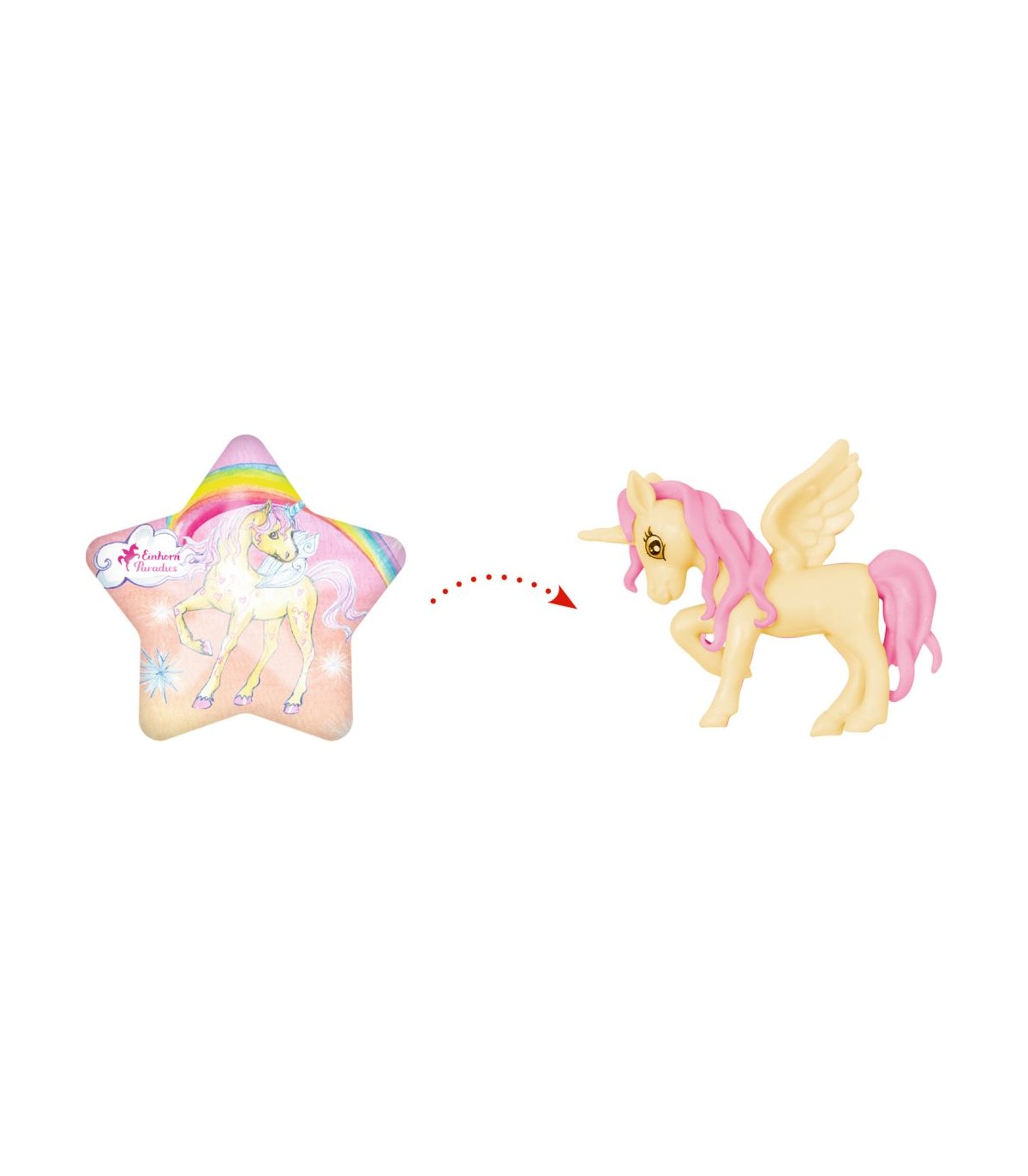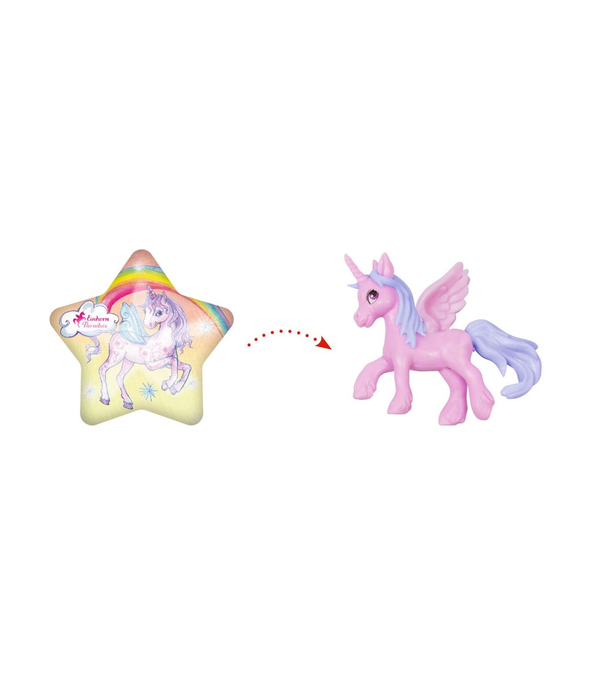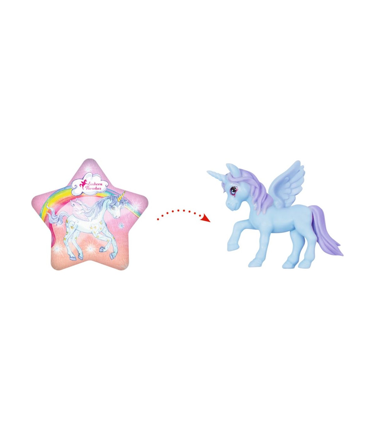 Un gran regalo sorpresa para todos los fans de los unicornios: si pones la estrella mágica en el agua, la mitad de la estrella se disuelve y el unicornio se libera en amarillo, rosa o azul. Estrella hecha de plástico y maicena. Unicornio de plástico.