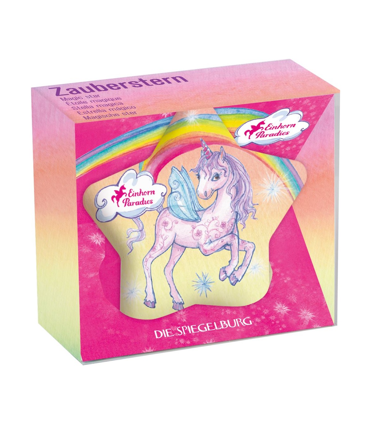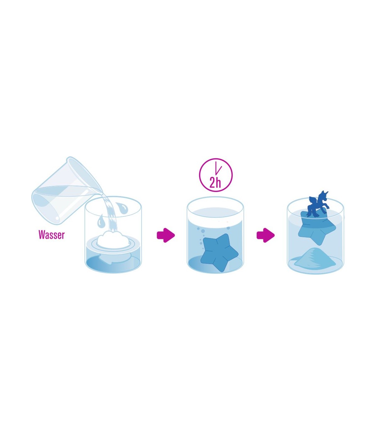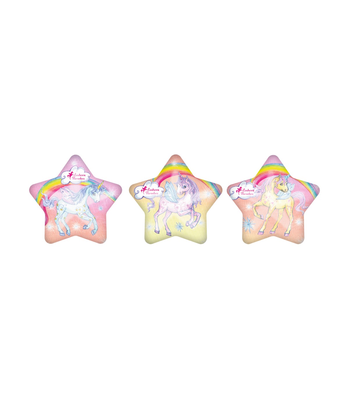 Un gran regalo sorpresa para todos los fans de los unicornios: si pones la estrella mágica en el agua, la mitad de la estrella se disuelve y el unicornio se libera en amarillo, rosa o azul. Estrella hecha de plástico y maicena. Unicornio de plástico.