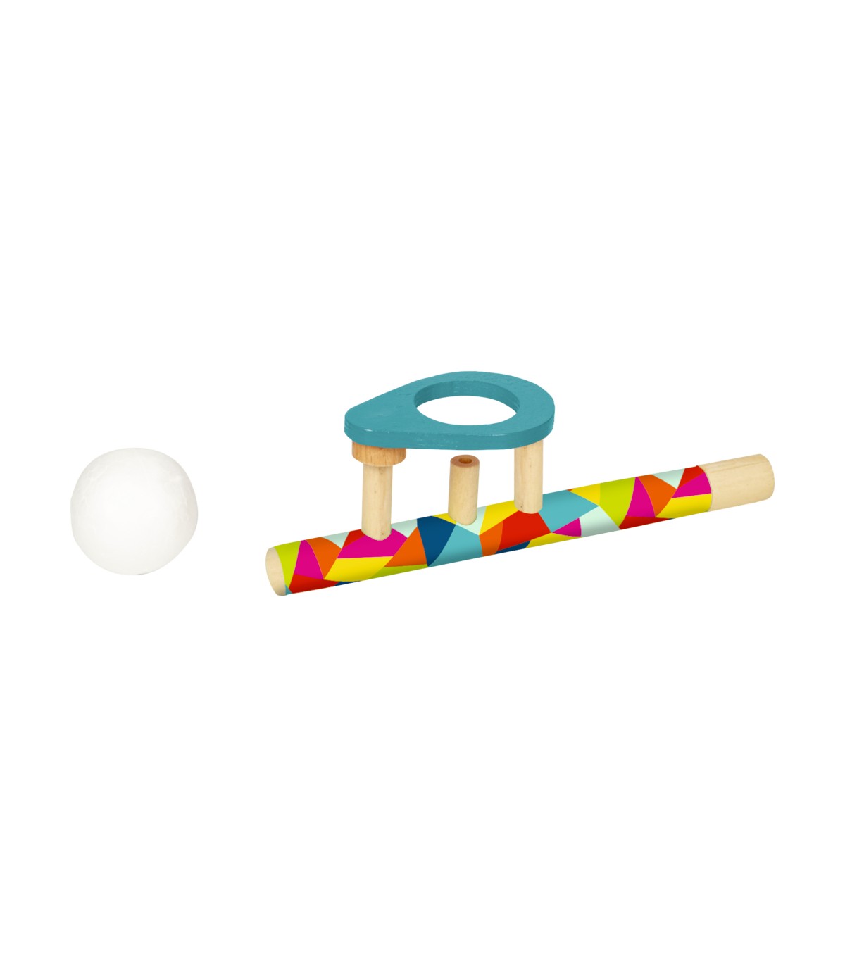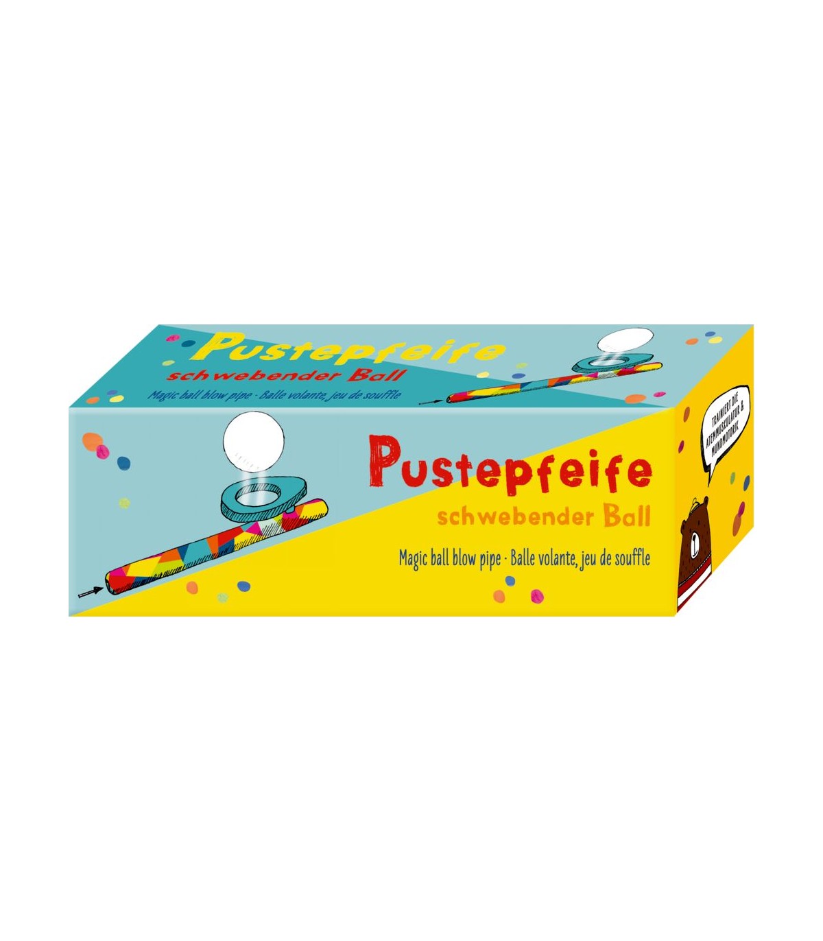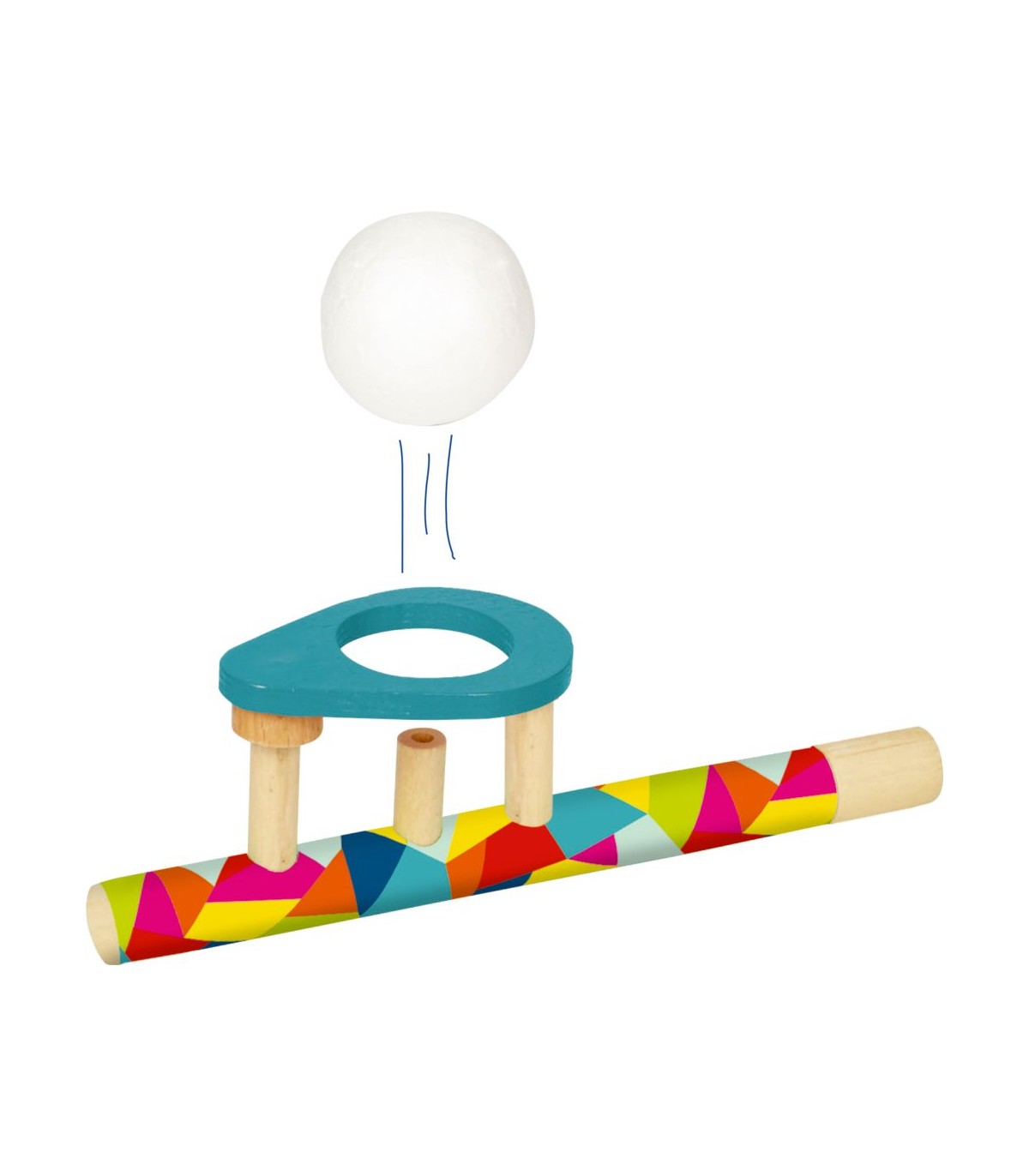 Un desafío divertido para todos: la pelota se mantiene en el aire al soplar de manera uniforme y hábilmente colocada de nuevo en la parte superior de madera. Silbato de madera, bolas de poliestireno.