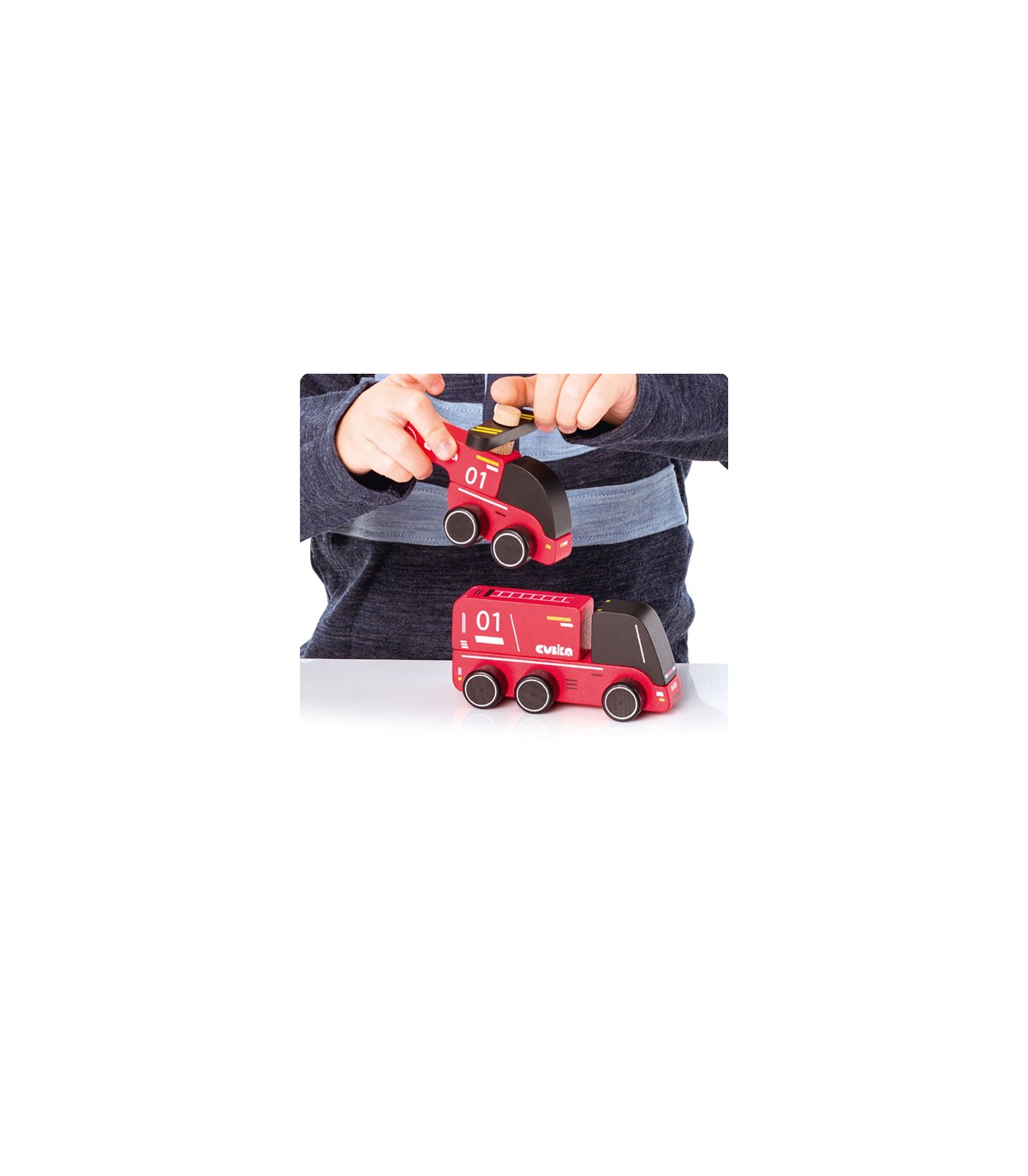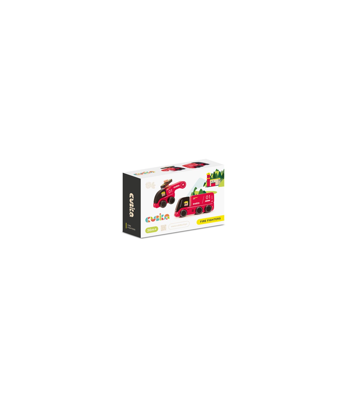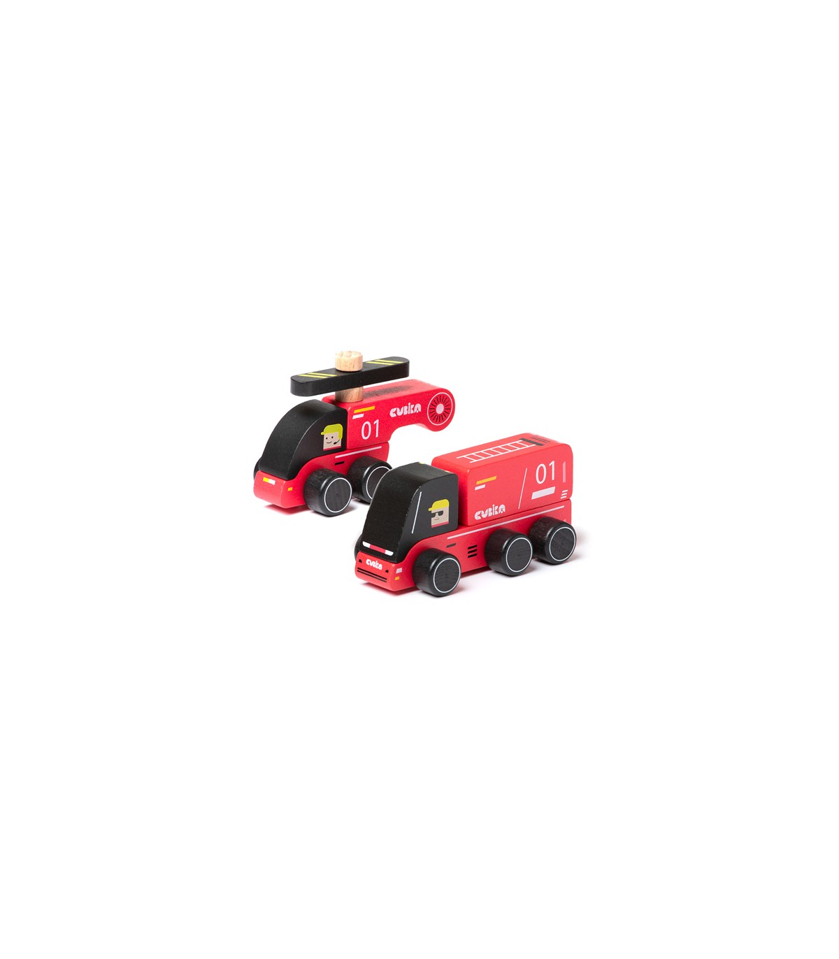 Set de vehículos de madera formado por un helicóptero y un camión de bomberos con las ruedas y las hélices móviles. Ambas piezas están hechas en un bonito color rojo e invitan a dejar volar la imaginación creando historias y recreando escenas de rescate. Además, fomentan la motricidad fina y la coordinación mano-ojo.