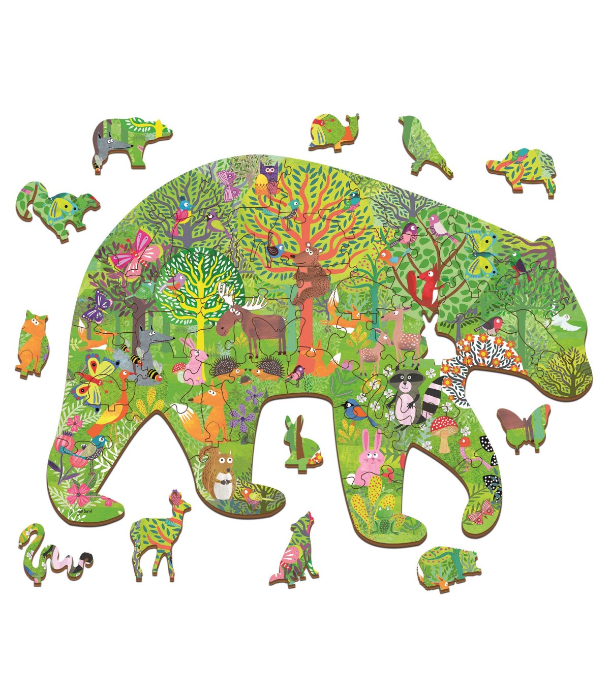 Un puzle de madera de forma especial en el que está representado un colorido paisaje. Entre las piezas que componen el puzle hay 12 animales perfilados que también se pueden colocar de pie sobre sus bases. El juego estimula la lógica, las habilidades visoespaciales y la motricidad fina.