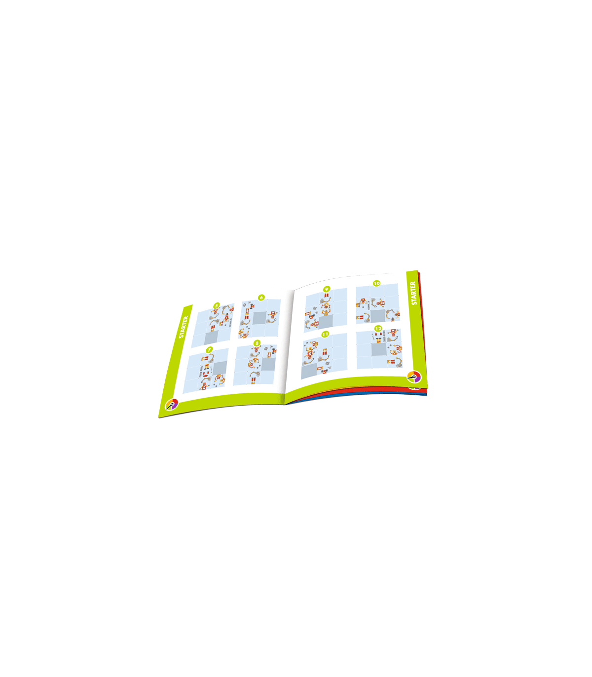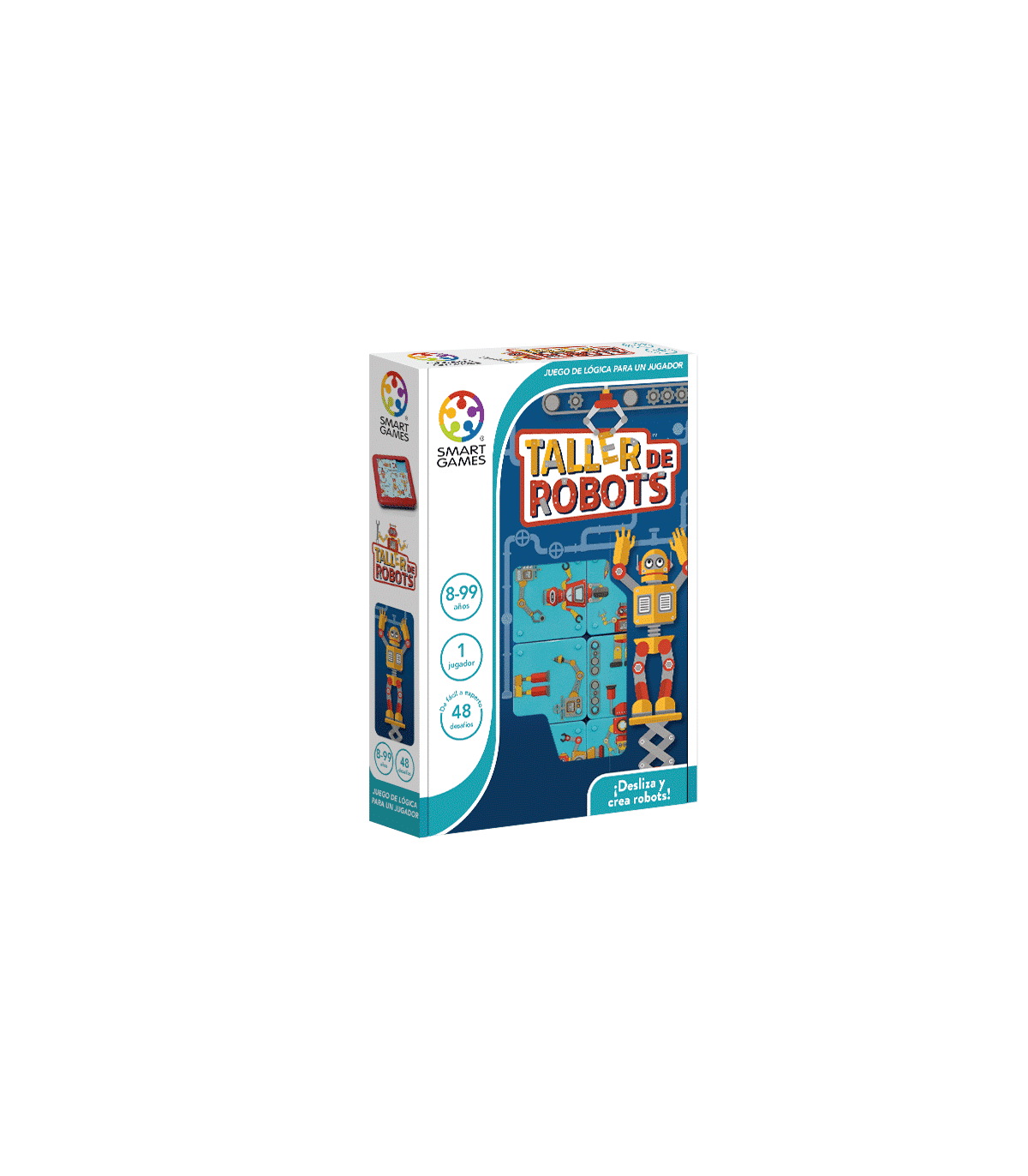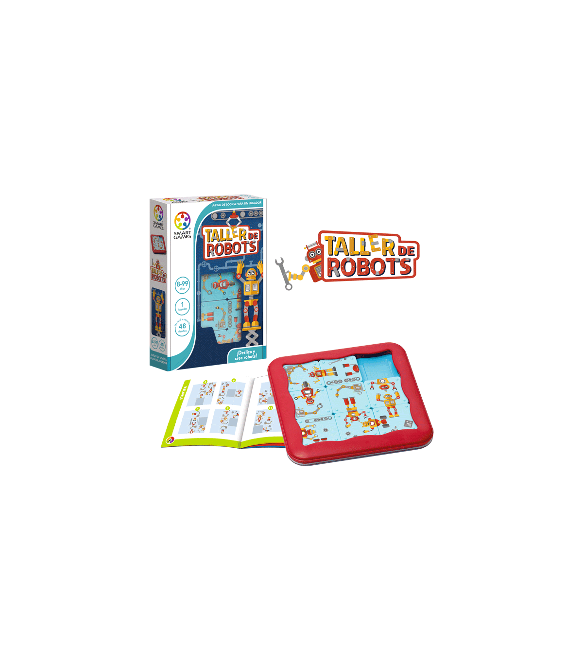 Taller de Robots es un divertido juego de ingenio para todas las edades con 48 retos. Pon a punto tus habilidades y crea los robots más geniales. Cada robot debe tener ruedas o patas en una pieza y un cuerpo con cabeza en una pieza adyacente. ¡Solo se pueden mover deslizándolas! Has encontrado la solución cuando todos los robots están ensamblados.