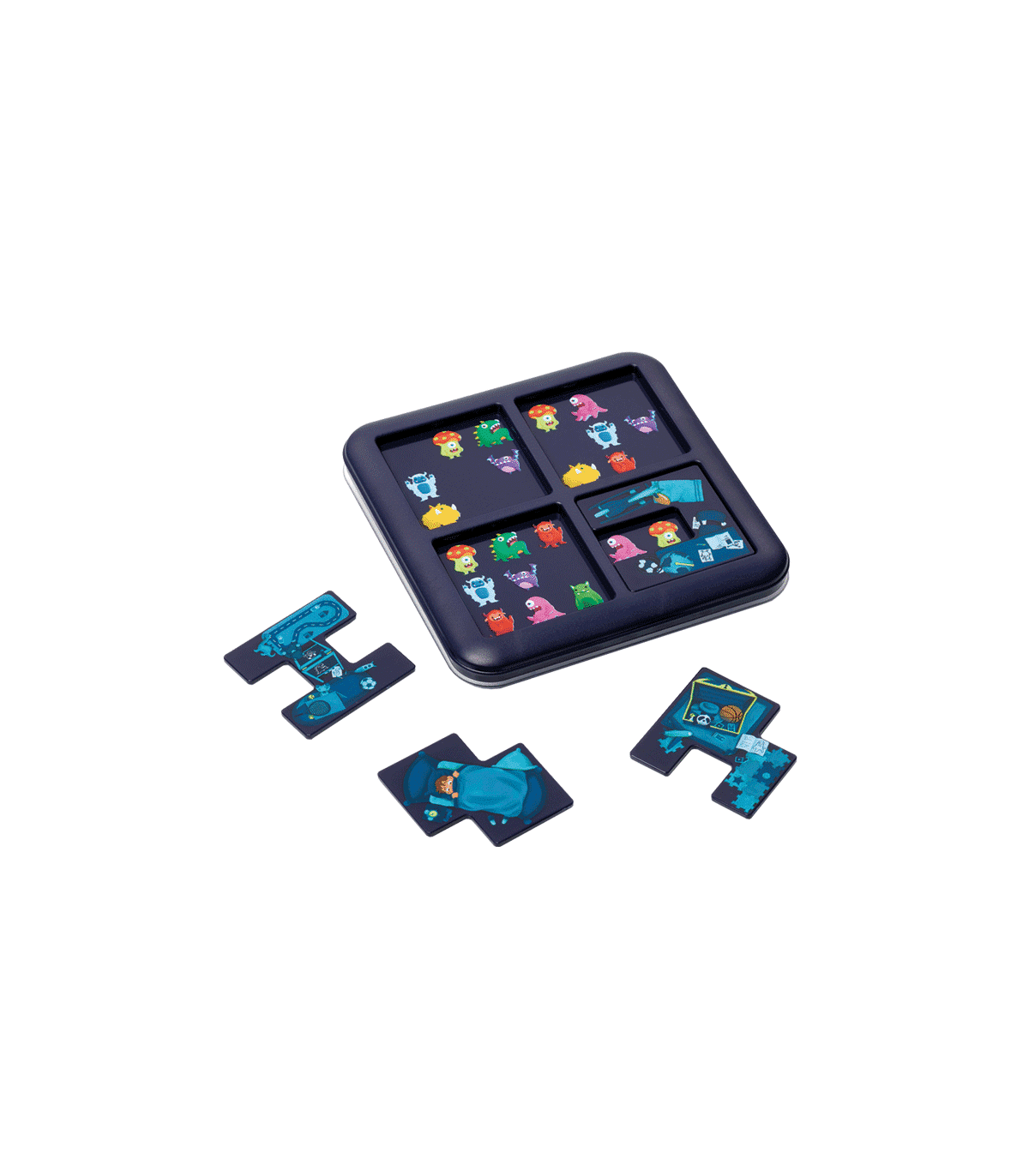 Coloca las cuatro piezas de puzle en el tablero de juego para esconder todos los monstruos excepto los que se muestran en el reto. 60 retos incluidos en un juego con tapa, perfecto para viajes.