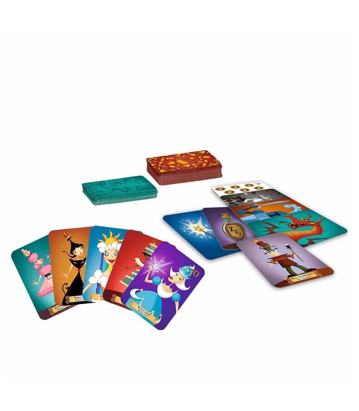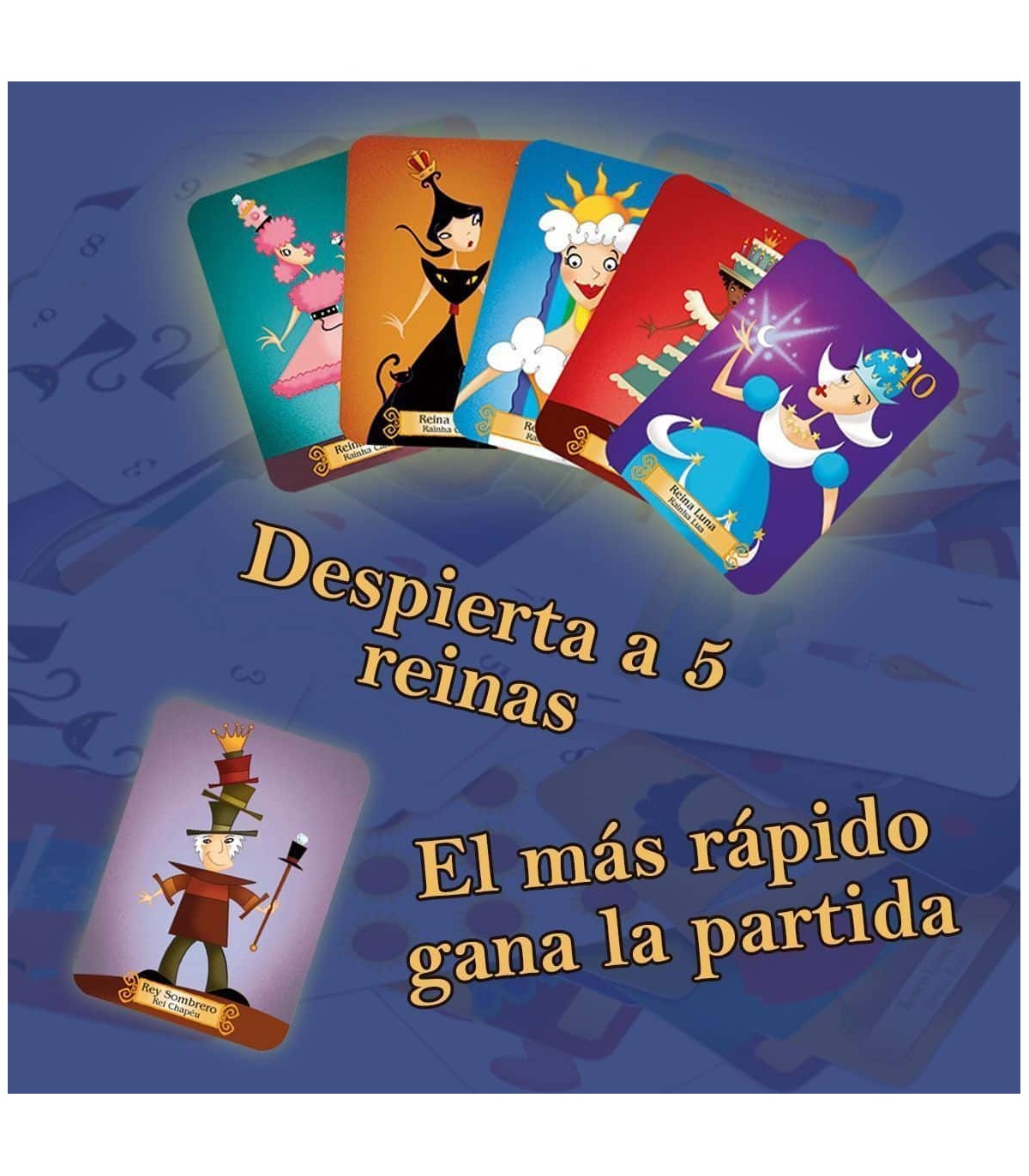 En Reinas Durmientes debes conseguir despertar a 5 reinas antes que nadie. En este divertido juego de cartas hay 7 tipos de cartas especiales de acción y 12 cartas de reinas. Cada carta especial tiene una función diferente y con ellas debes conseguir retrasar a tus oponentes del objetivo y ser el primero en lograrlo, ¿lo conseguirás?.