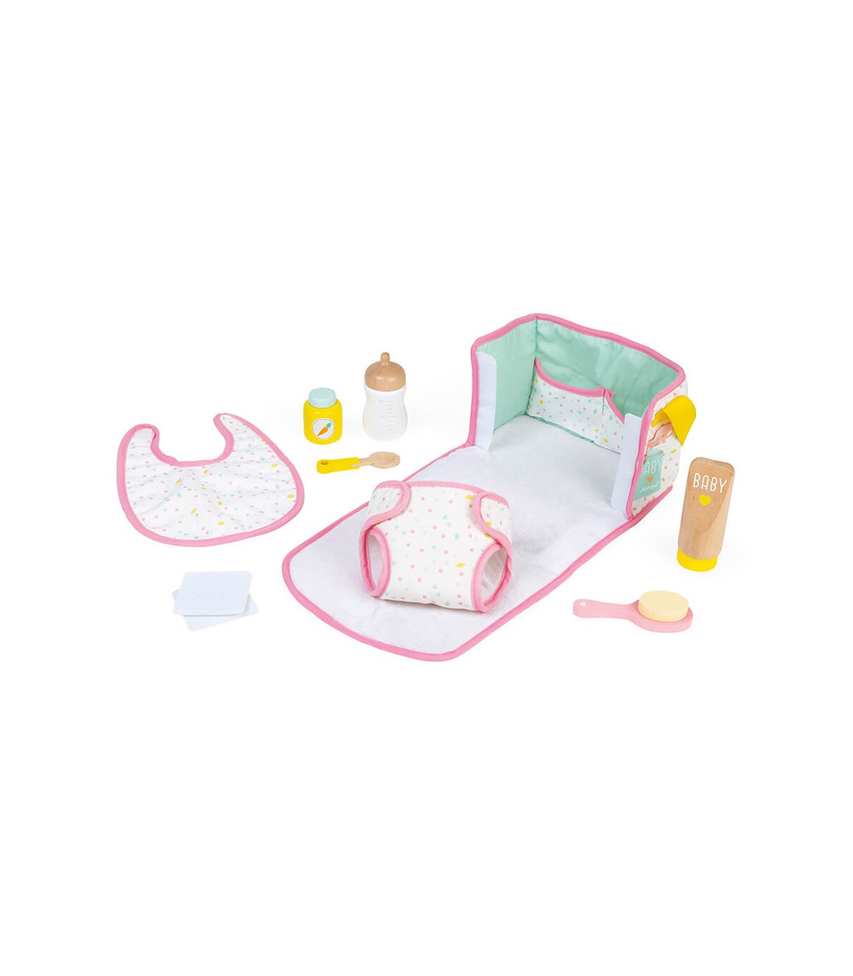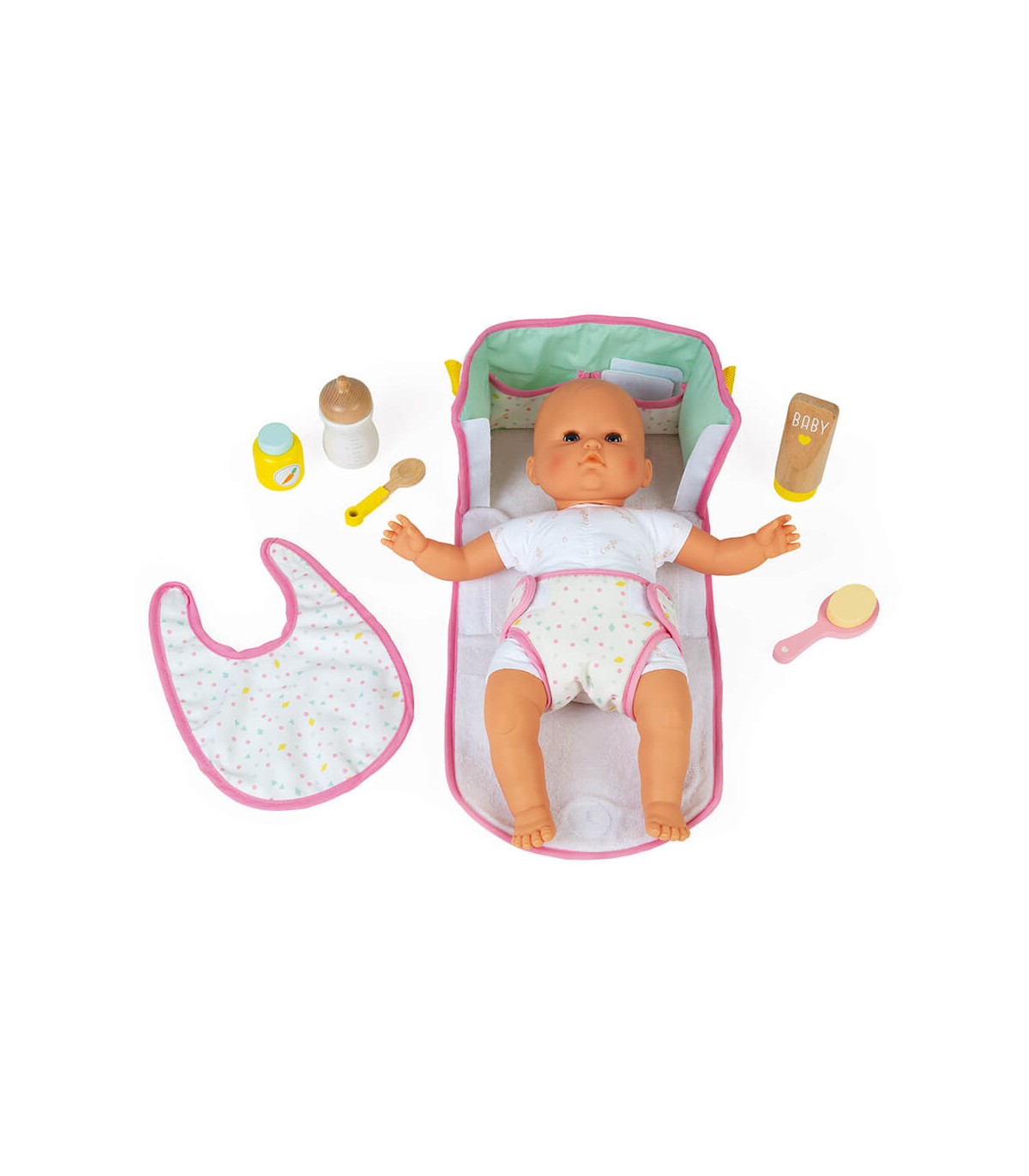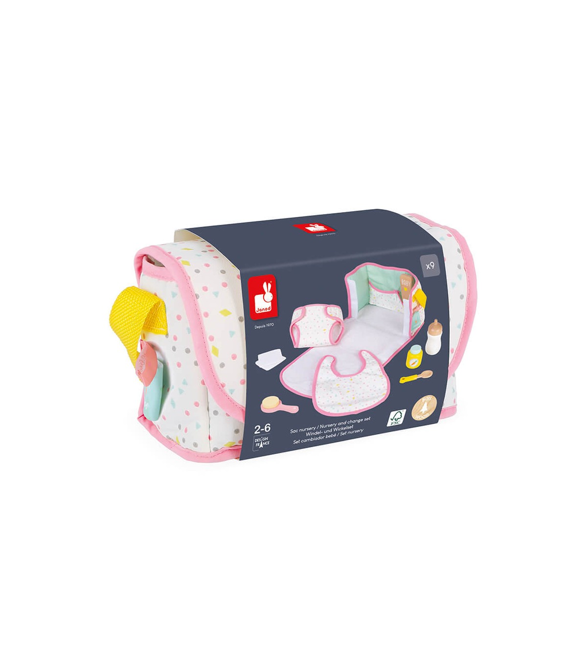 Dar de comer al bebé, acicalarlo o cambiarle el pañal: ¡tendrá un montón de tareas que hacer! El bolso tiene varios bolsillos por dentro y se despliega para convertirse en un cambiador en el que el niño podrá tumbar cómodamente a su bebé de juguete sobre la mullida tela de rizo. 8 accesorios incluidos. Este bolso cambiador de juguete blanco con un delicado estampado es perfecto para muñecos de 36 a 42 cm. Los accesorios son de madera con certificado FSC® (madera procedente de bosques gestionados de forma sostenible).