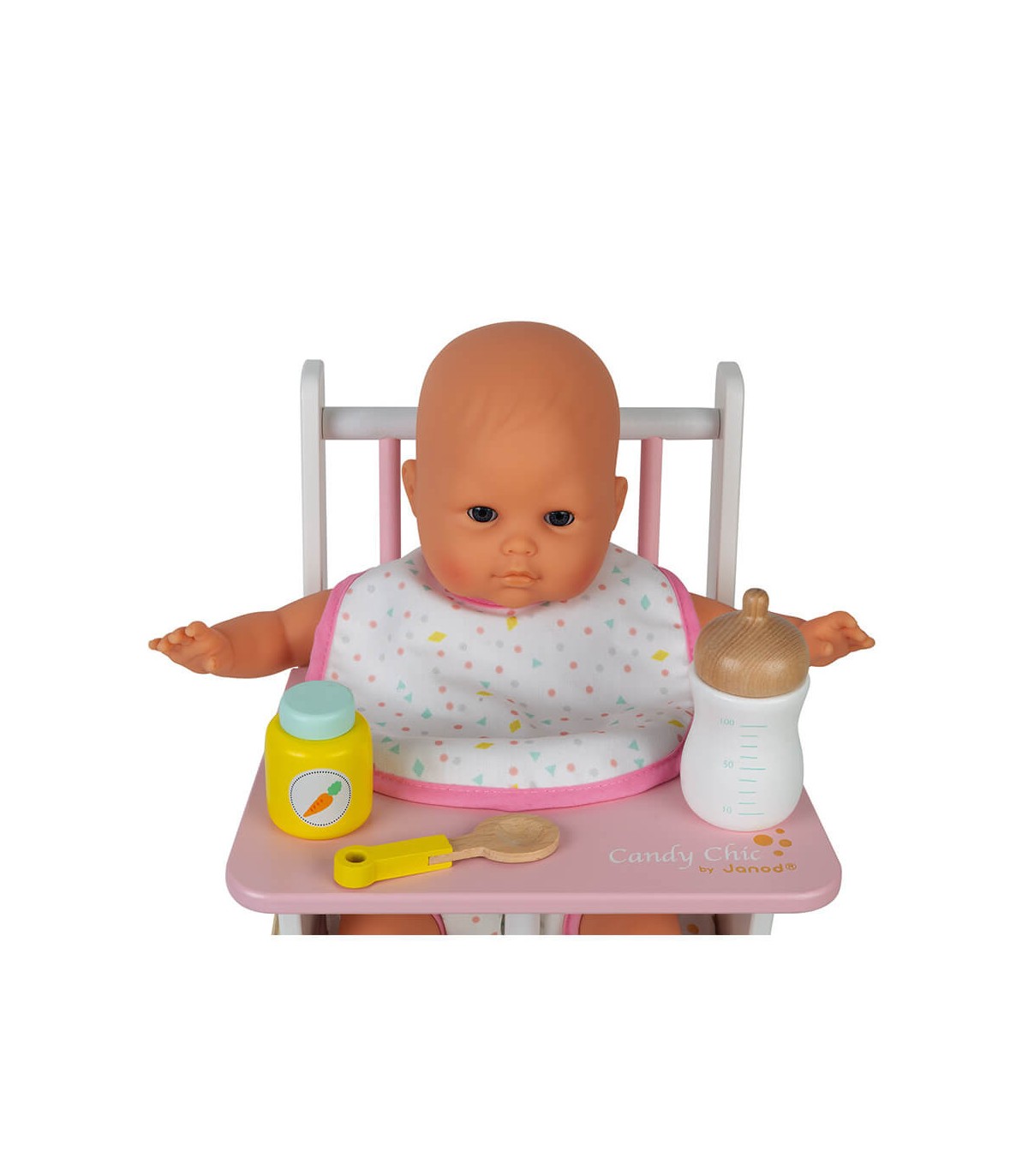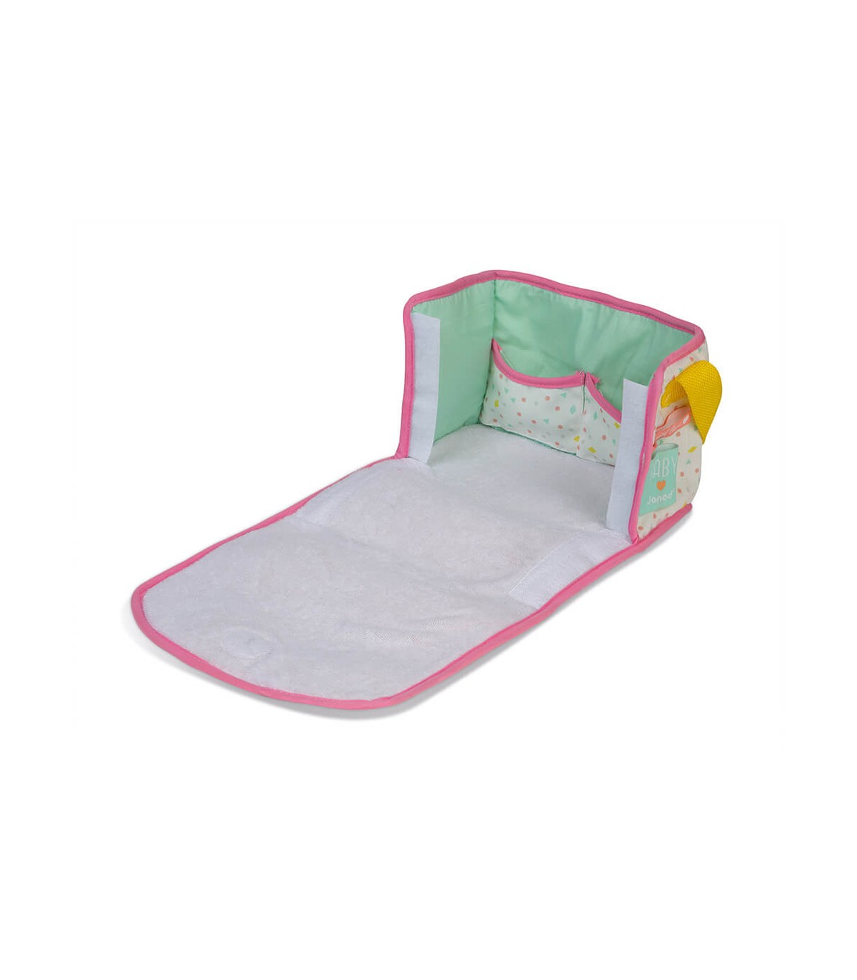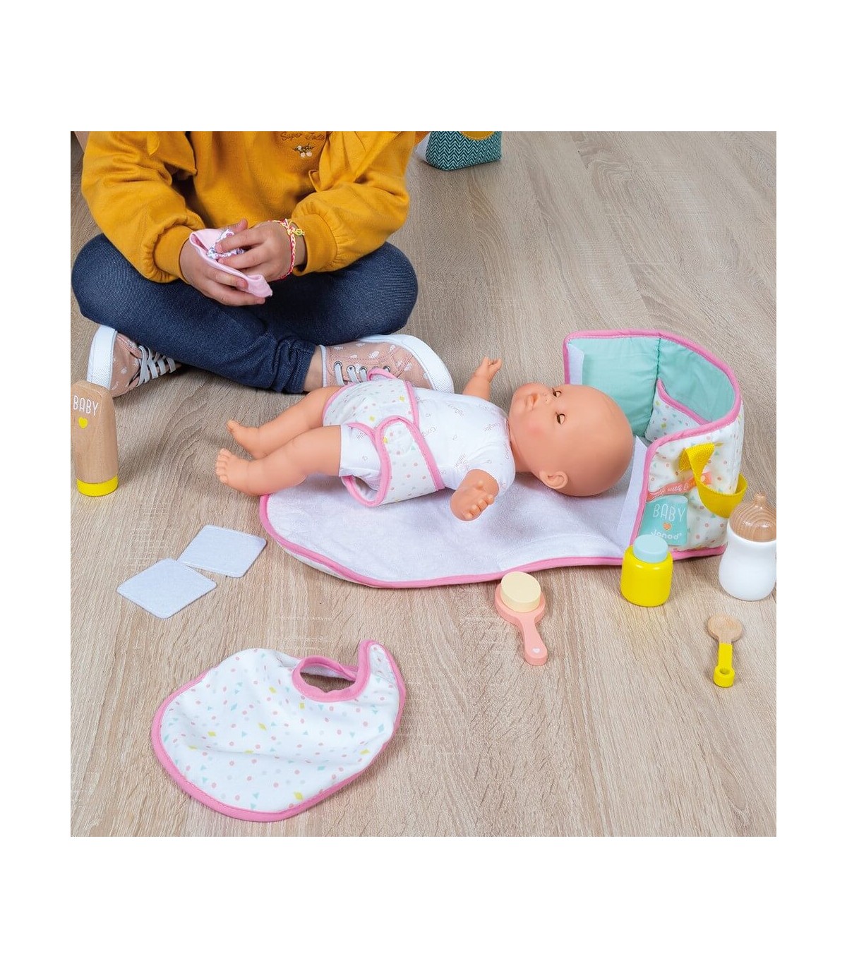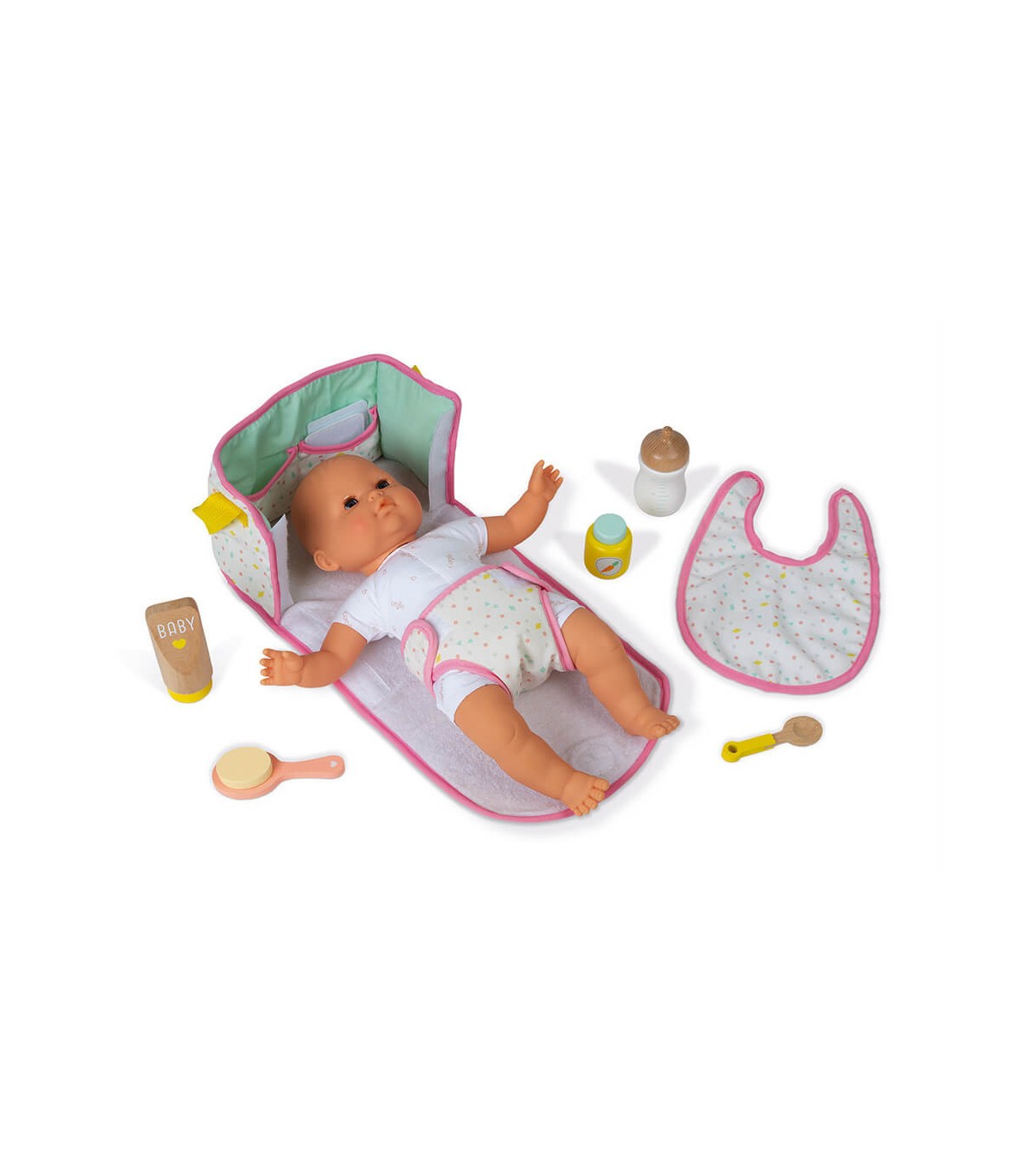 Dar de comer al bebé, acicalarlo o cambiarle el pañal: ¡tendrá un montón de tareas que hacer! El bolso tiene varios bolsillos por dentro y se despliega para convertirse en un cambiador en el que el niño podrá tumbar cómodamente a su bebé de juguete sobre la mullida tela de rizo. 8 accesorios incluidos. Este bolso cambiador de juguete blanco con un delicado estampado es perfecto para muñecos de 36 a 42 cm. Los accesorios son de madera con certificado FSC® (madera procedente de bosques gestionados de forma sostenible).