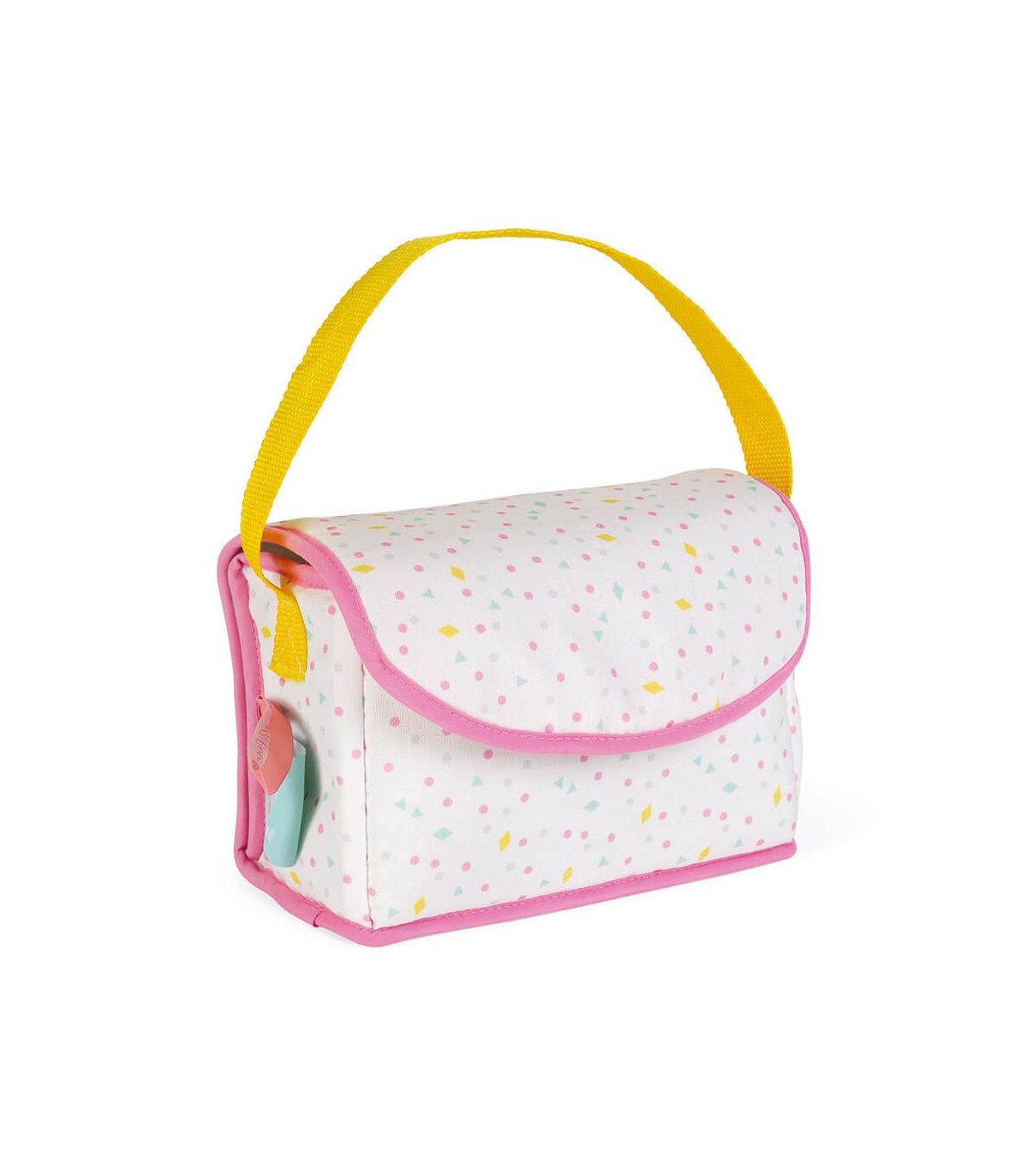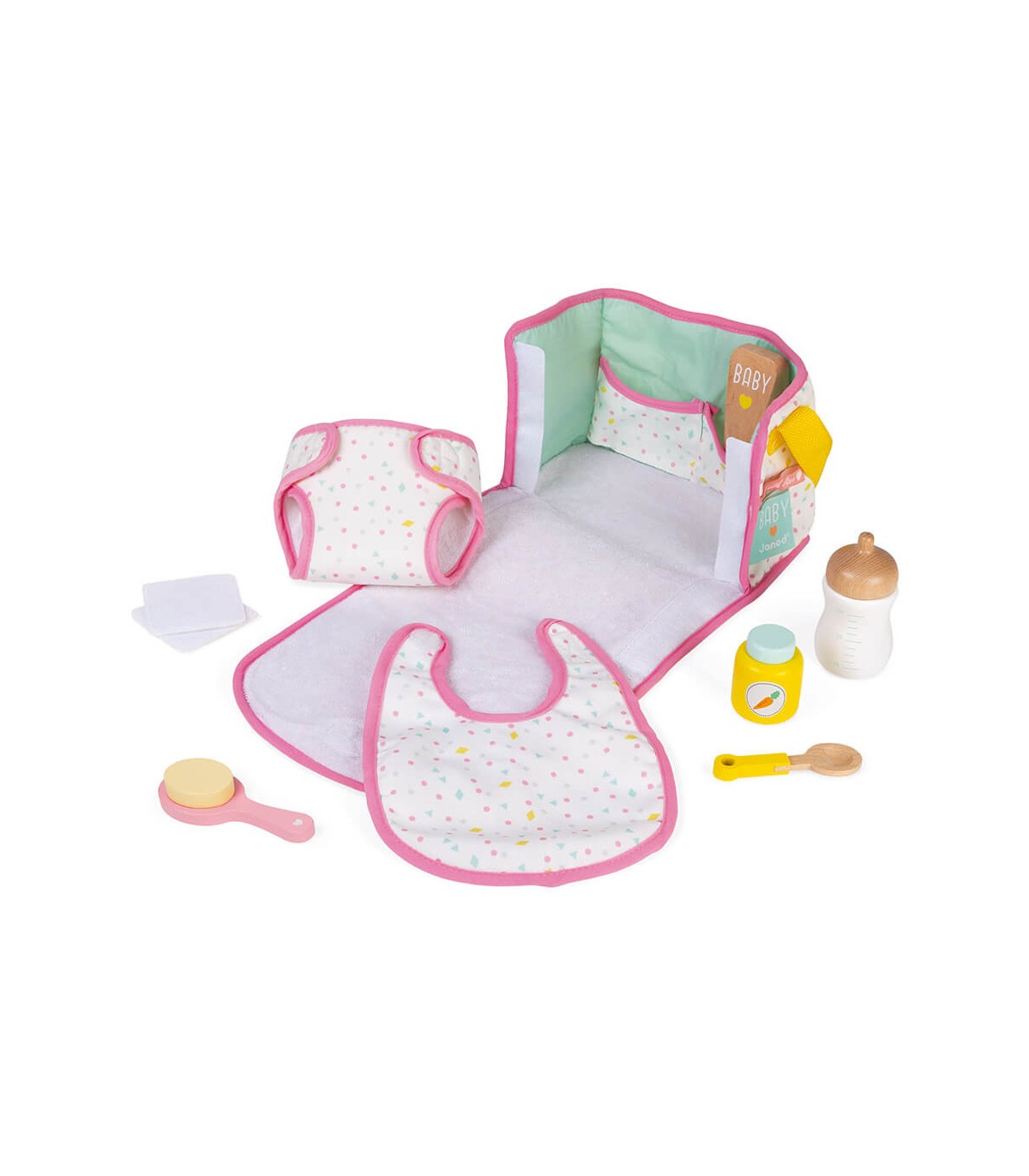 ¿Al peque le gusta hacer como mamá y papá mimando y cuidando de su bebé pacientemente? Pues regálale este bonito bolso cambiador. Este juguete con un montón de accesorios está recomendado para niños a partir de 2 años y tiene todo lo necesario para ocuparse del bebé: 1 babero, 1 pañal, 1 cuchara, 1 cepillo, 1 potito, 1 tubo de crema, 1 biberón y 2 algodones.