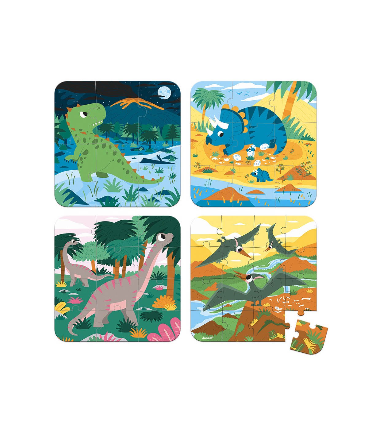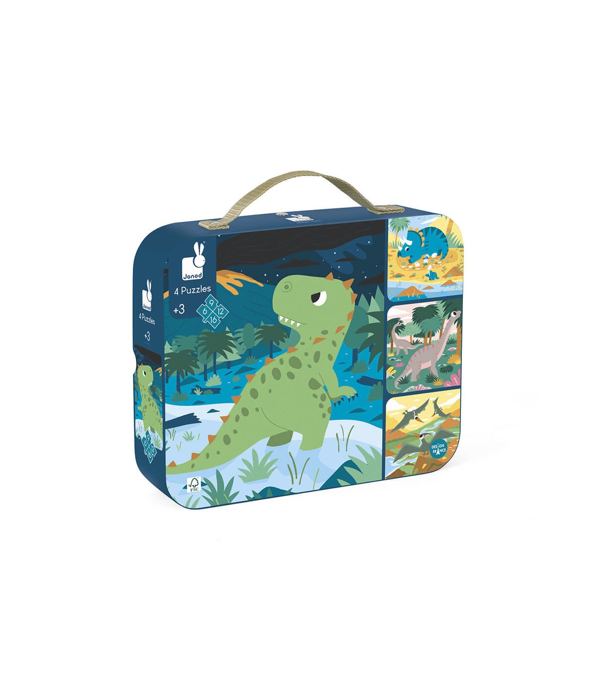 4 puzles evolutivos de cartón de 6, 9, 12 y 16 piezas con la temática de los dinosaurios. Se venden en una bonita caja de regalo. Puzle: 20 x 20 cm.