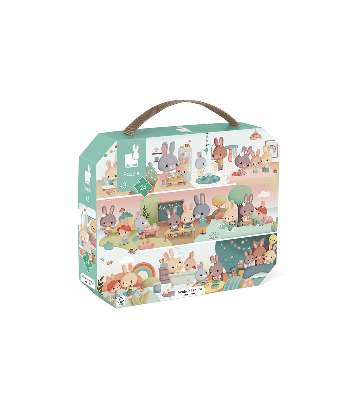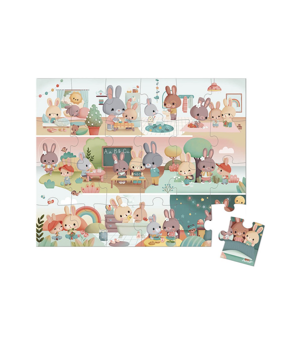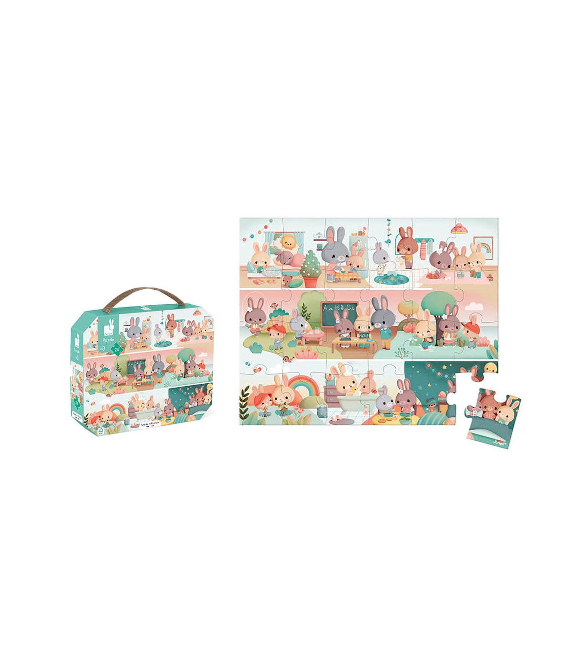 Este fantástico puzle, que representa una jornada desde la mañana hasta la noche, es perfecto para acompañar al niño en su día a día. Gracias a esta familia de conejitos, el pequeño se situará en el tiempo: levantarse, desayunar, lavarse, ir al colegio… Un puzle de cartón de iniciación de 24 piezas ideal para ayudar al niño a desarrollarse y orientarse en el tiempo.