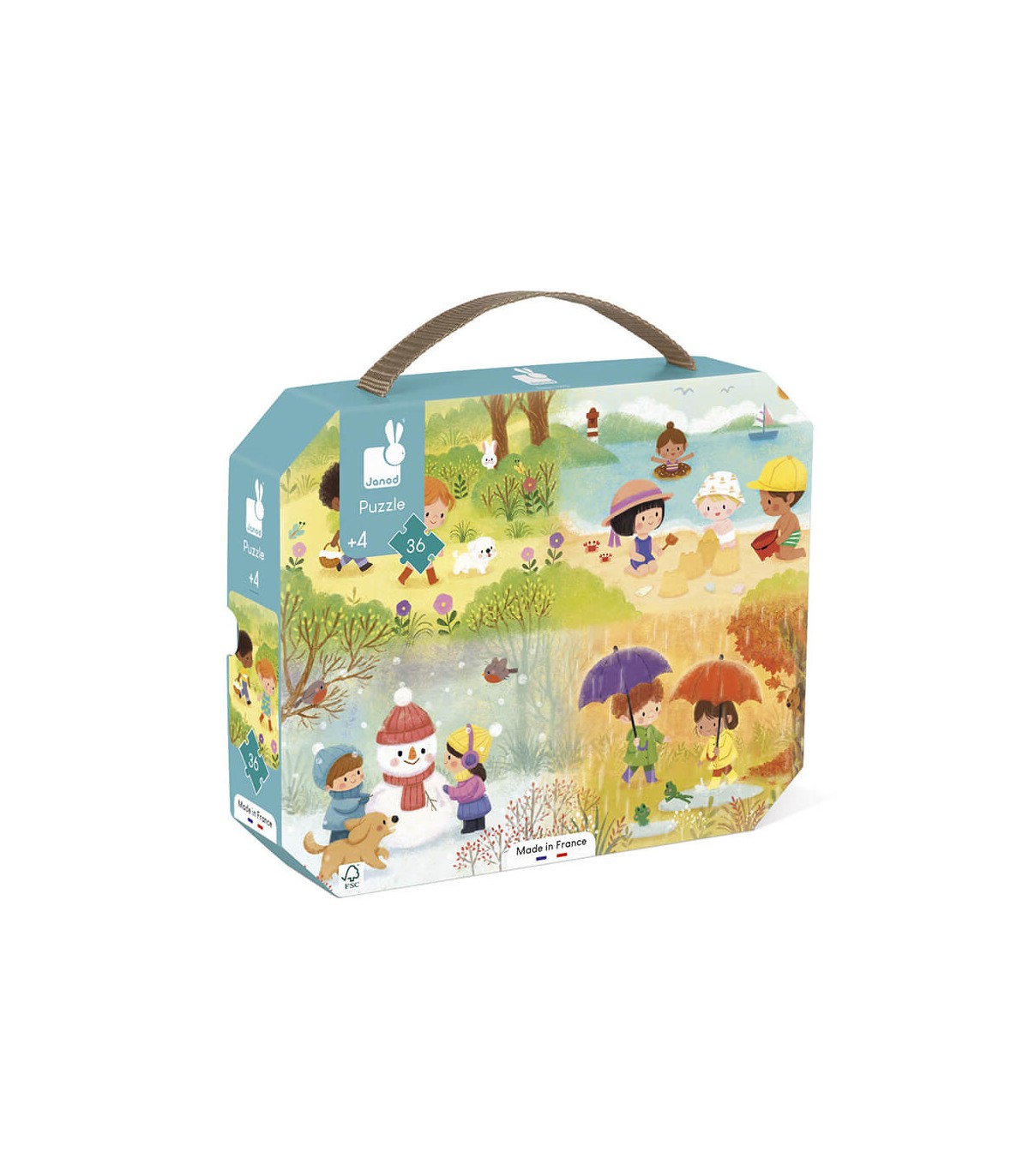 ¡Primavera, verano, otoño e invierno! ¡A descubrir las cuatro estaciones con este magnífico puzle de cartón de 36 piezas con un montón de detalles! El niño ejercitará la memoria y la destreza con este bonito puzle de cartón de 36 piezas. Este puzle se transporta fácilmente gracias a su bonito maletín y a su asa de tela.