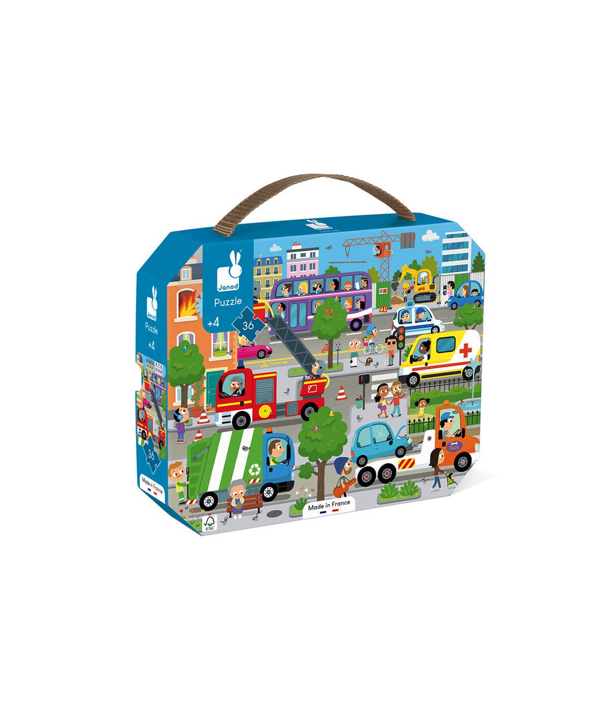 Con este puzle de cartón, su hijo(a) descubrirá la ciudad y su ambiente, a la vez que desarrolla su destreza y su concentración. Este puzle se transporta fácilmente gracias a su bonito maletín y a su asa de tela. Contiene un póster que sirve como modelo. Número de piezas: 36 Fabricado en Francia. Cartón con certificación FSC y tintas vegetales.