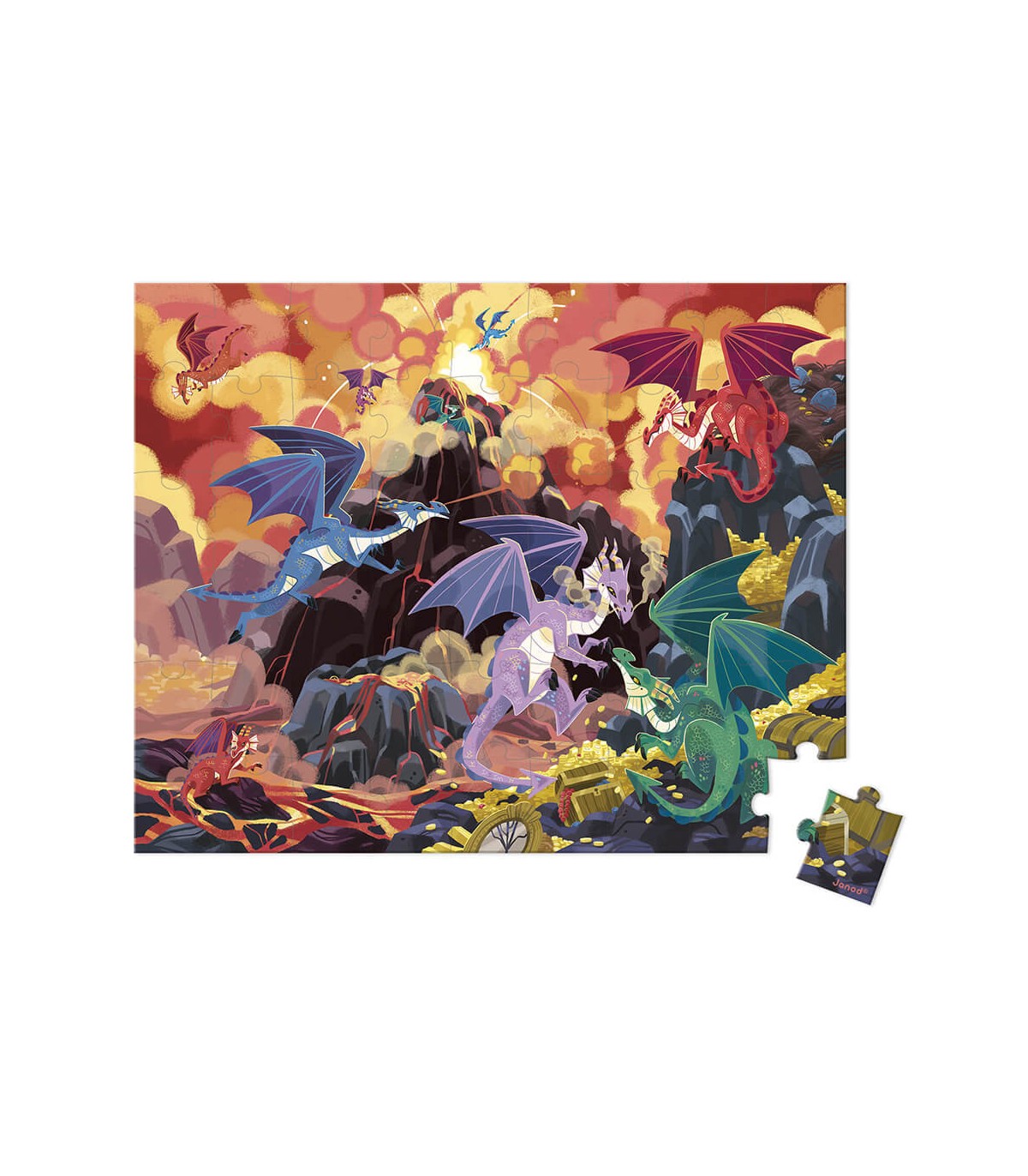 El cielo se oscurece, el volcán despierta y las escamas de los dragones brillan mientras ellos se desperezan al despertar. ¿Quién será el rey? Este magnífico puzle de cartón de 36 piezas con un montón de detalles llevará al niño a un imaginario mundo mágico. El niño ejercitará la memoria y la destreza con este bonito puzle de cartón de 36 piezas.