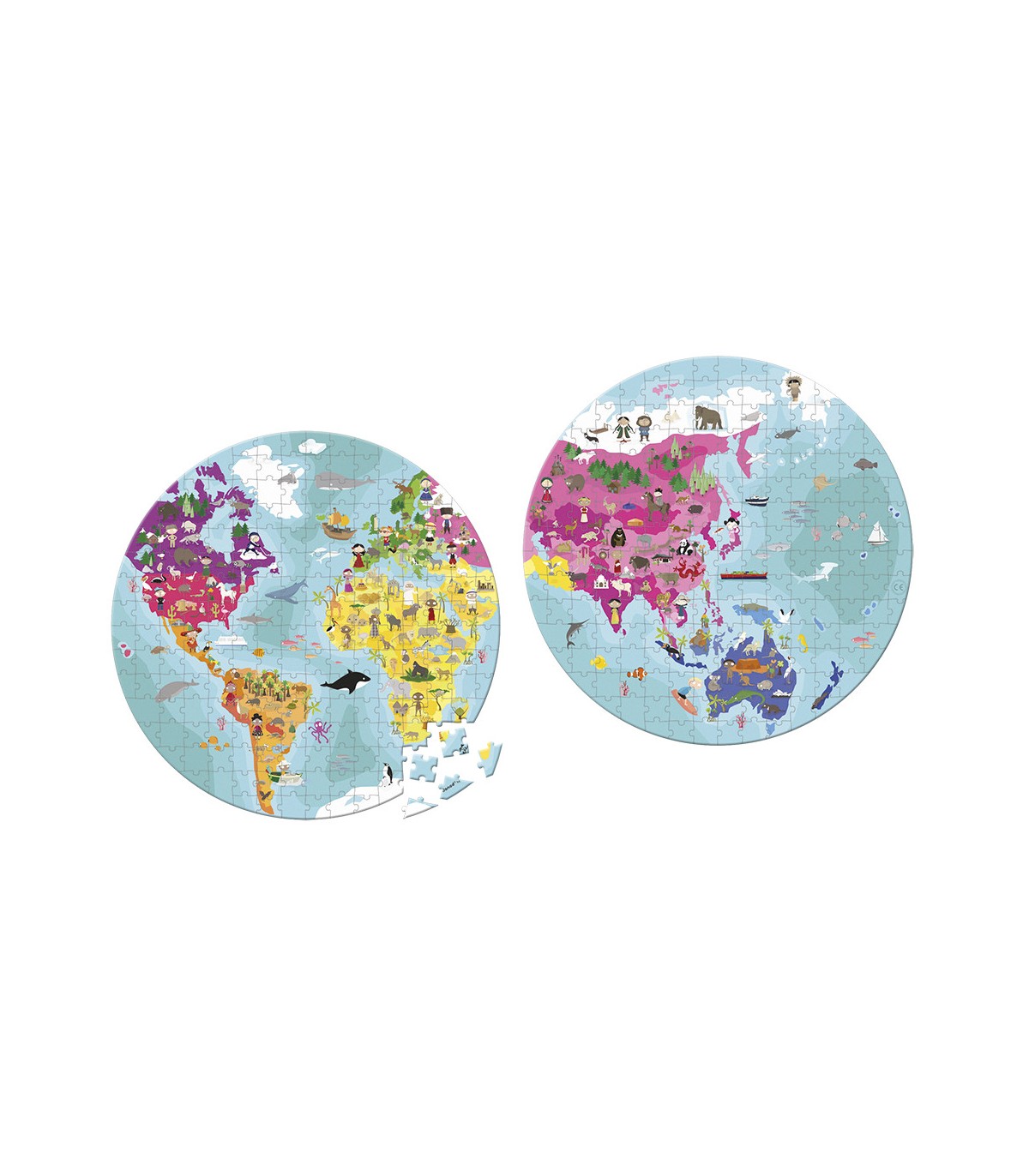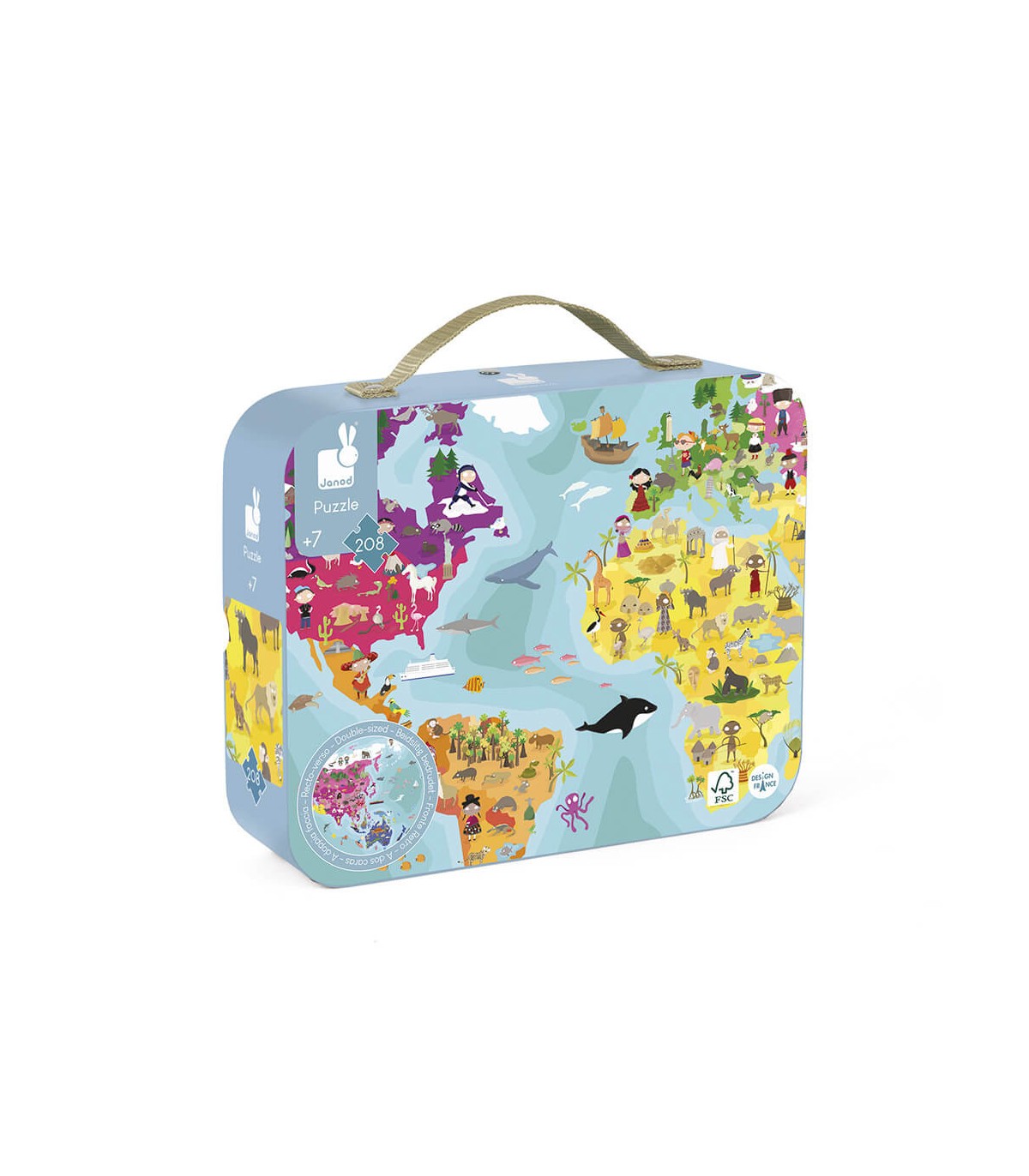 Puzle con piezas de cartón ilustradas a dos caras sobre el tópico planeta Tierra. Ideal para aprender geografía y descubrir la cultura de los diferentes países. Ilustrado con las personas y los animales típicos de cada uno de los continentes. Número de piezas: 208. Materiales utilizados: cartón. Tipo de caja: fácil de transportar gracias a su asa de tela.
