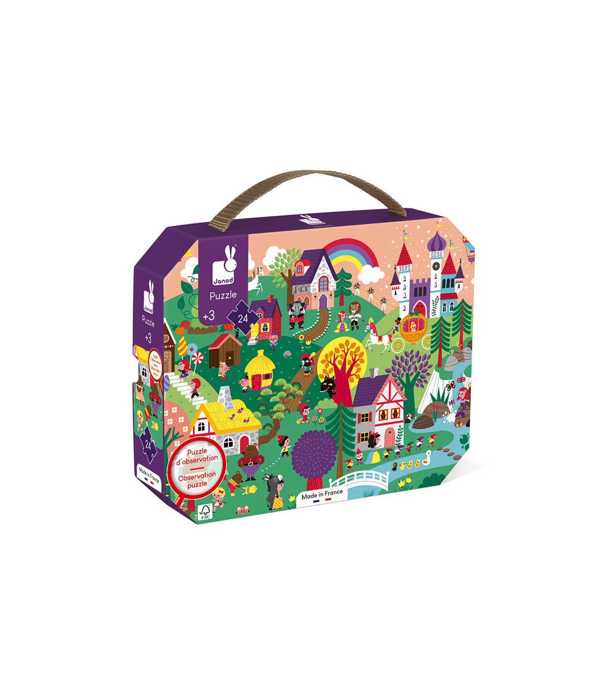 He aquí un bonito puzle de cartón de 24 piezas lujosamente ilustrado sobre el tema de los cuentos. El tamaño de las piezas está adaptado a las manos más pequeñas para facilitar el montaje del puzle. ¡Una vez que hayas terminado el puzle, diviértete buscando las 29 ilustraciones ocultas! Este práctico puzle se guarda en el interior del bonito maletín con asa para un transporte fácil y para no perder nunca las piezas. Fabricado en Francia. Cartón con certificación FSC y tintas vegetales.