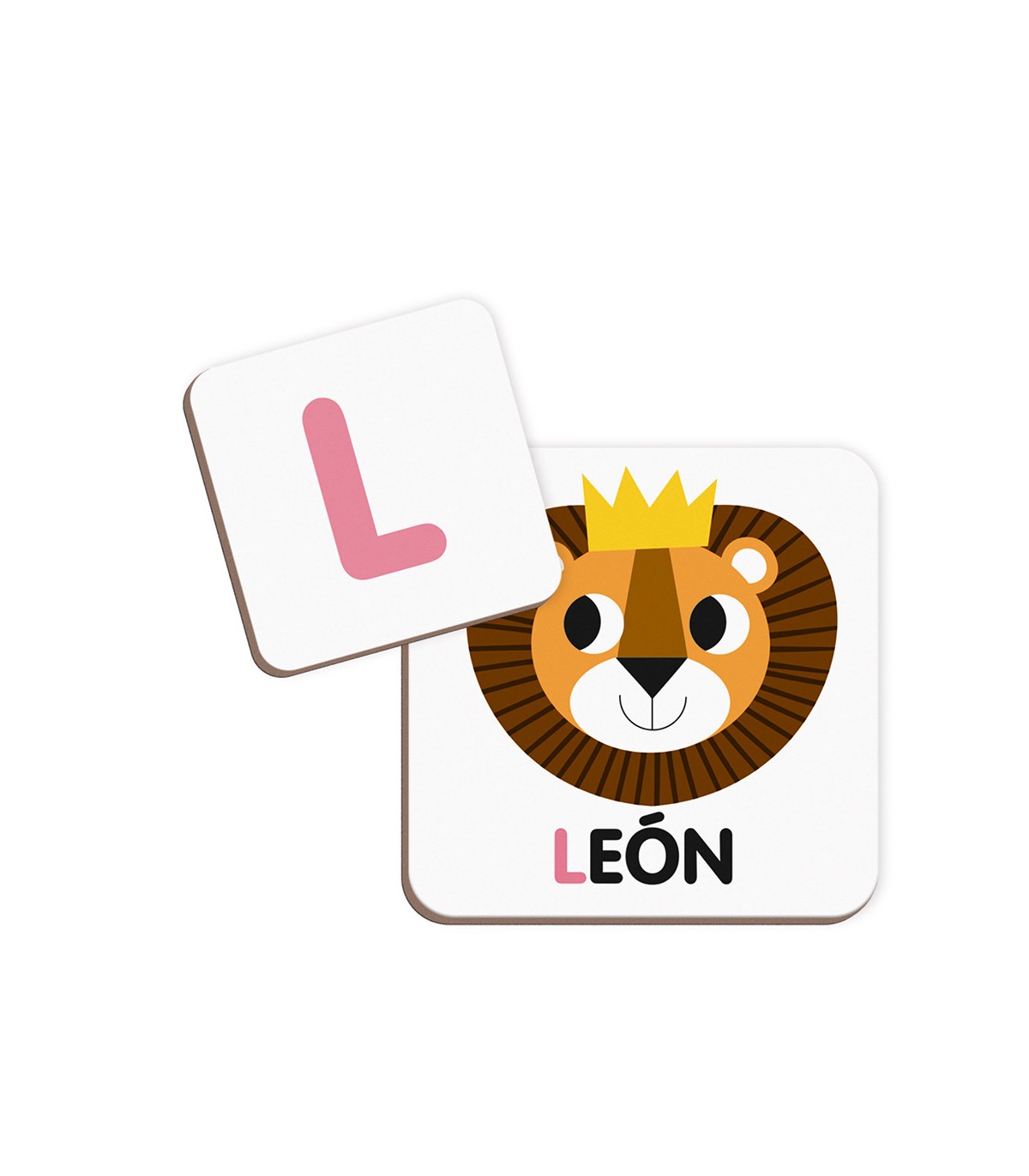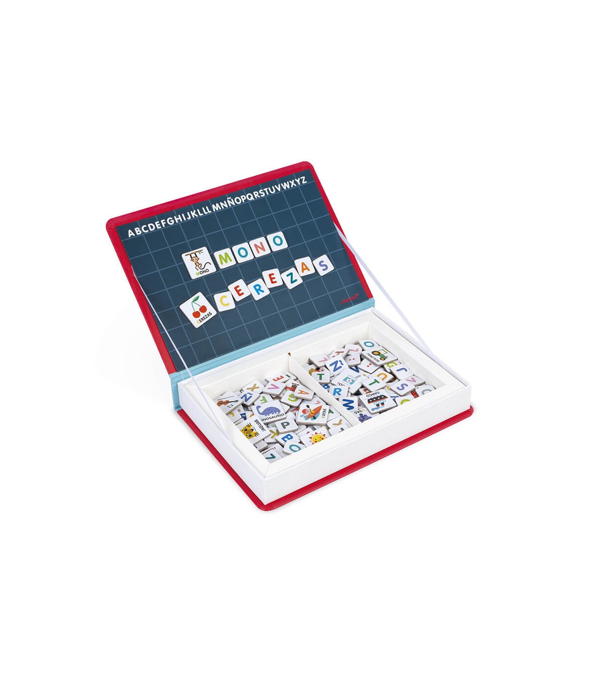 Juego educativo magnético de cartón para aprender el alfabeto en español. Compuesto por 28 imanes con ilustraciones y 116 imanes con letras. Una vez se ha abierto el libro, el objetivo del juego es escribir correctamente en la escena la palabra que indica cada imán con ilustración.