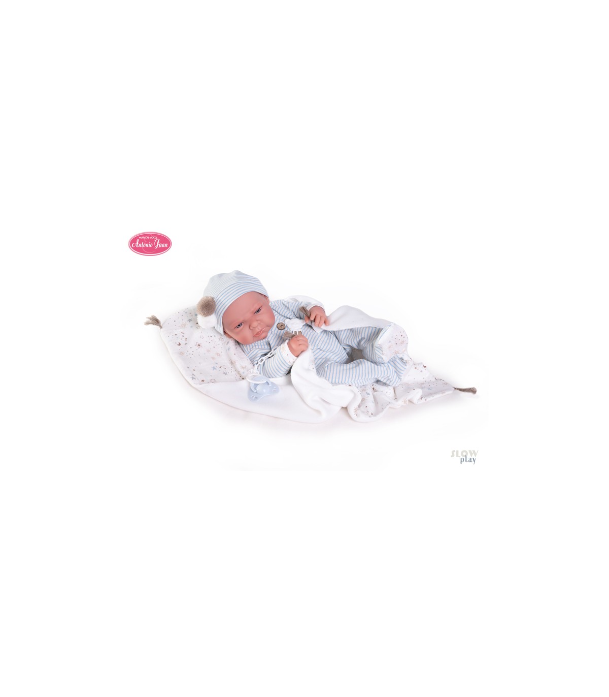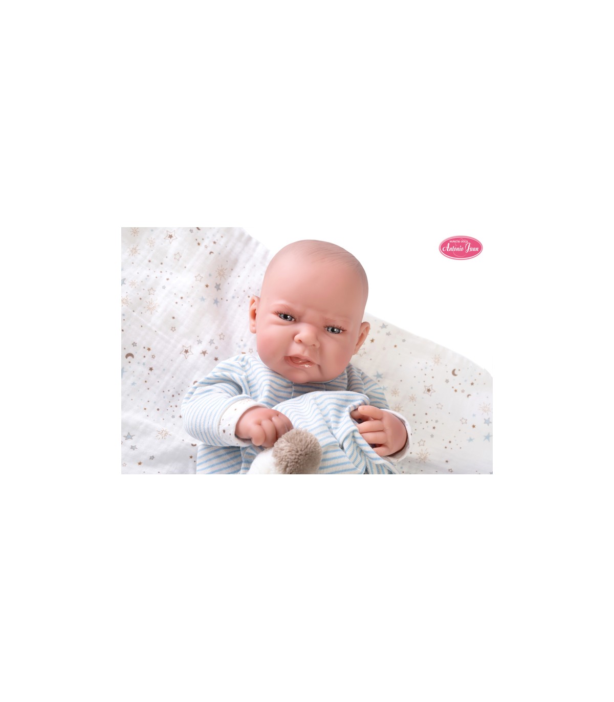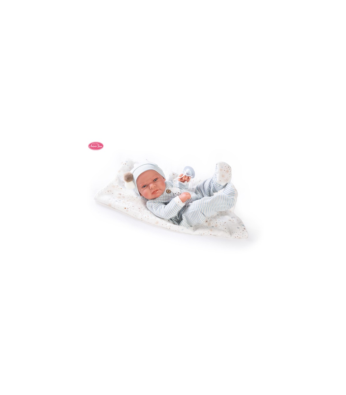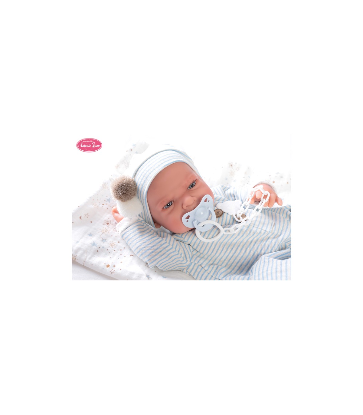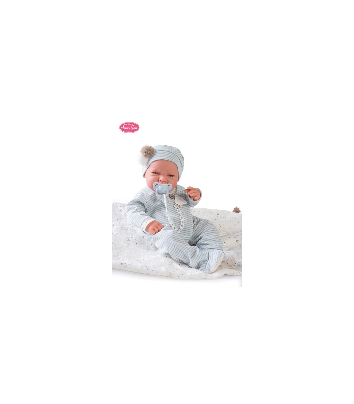 Lea está preparado con su pijama con rayas azules y su gorrito a juego para irse a la cama a descansar. Arrullalo en su dulce mantita de estrellas azules y verás como pronto se relaja. Su cuerpo es de suave vinilo sexuado. Mide 42 cm y le encanta acurrucarse en su mantita en tus brazos. ¿Hay algo más adorable que un bebé? Los Recién Nacidos son la esencia de Muñecas Antonio Juan.