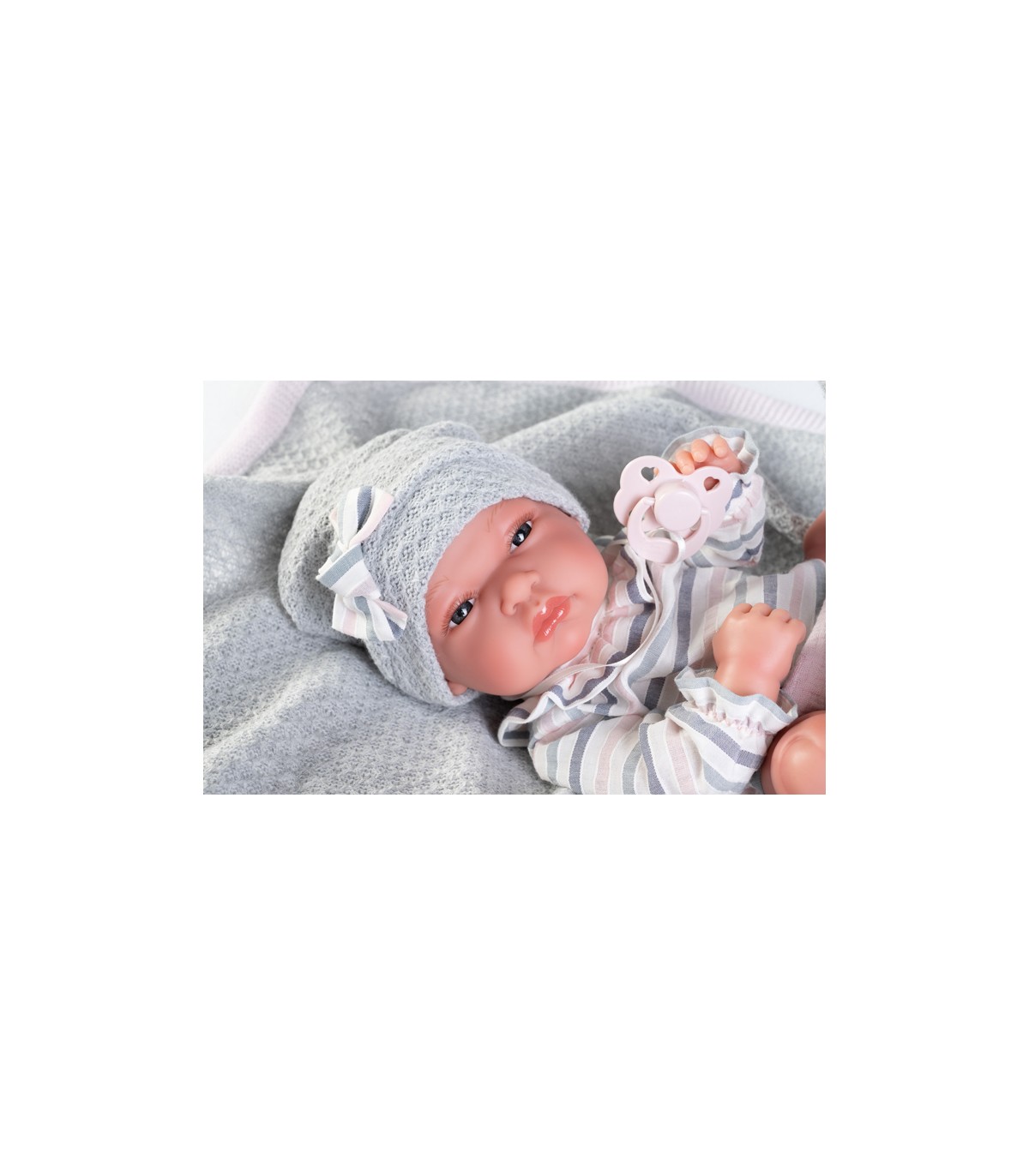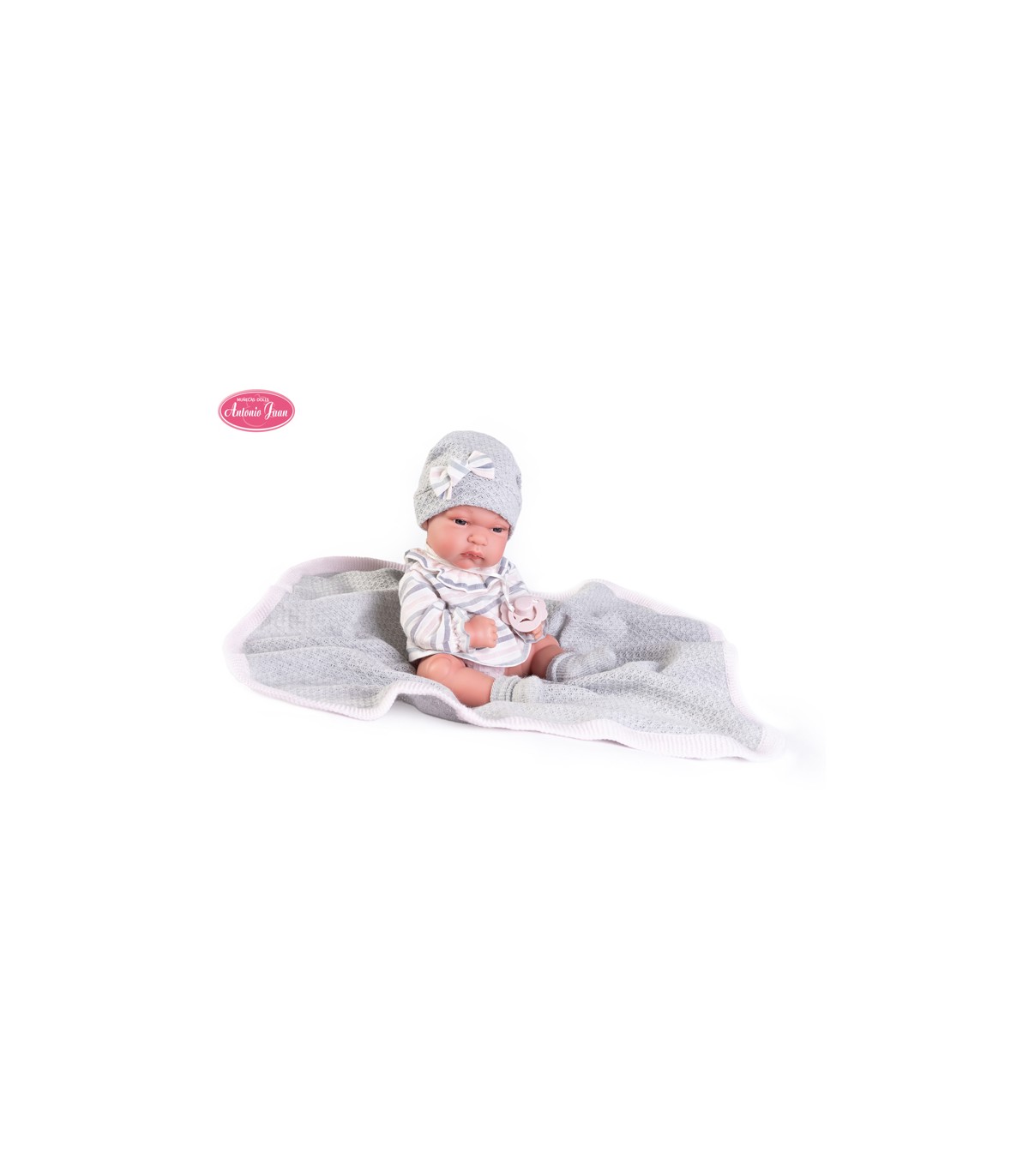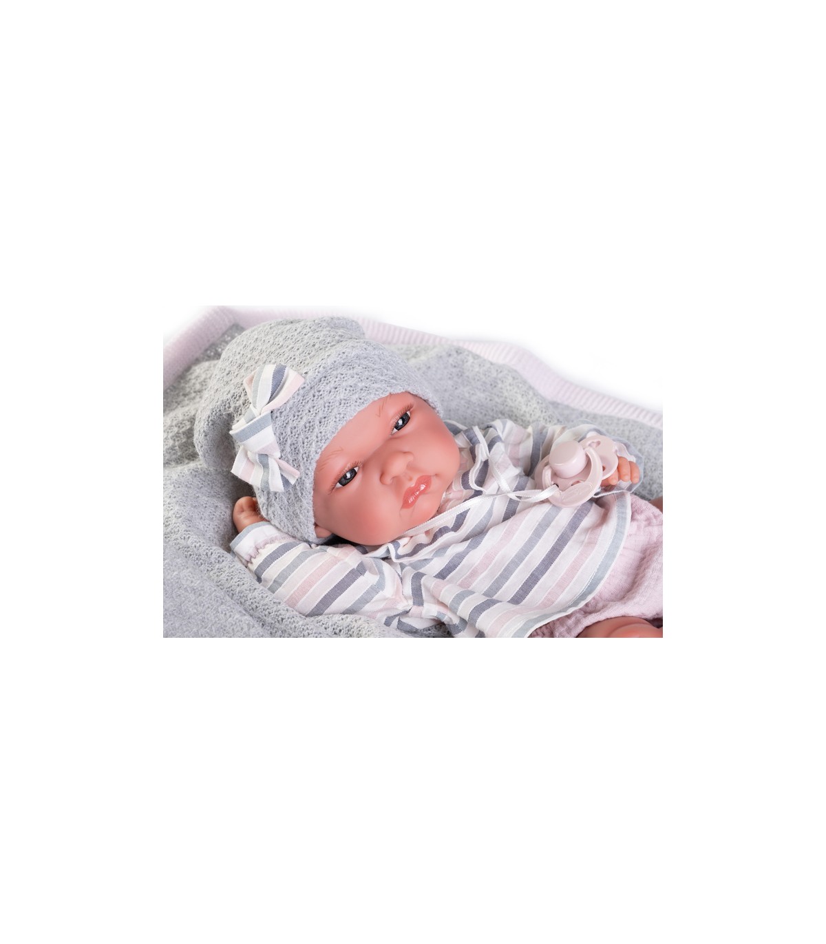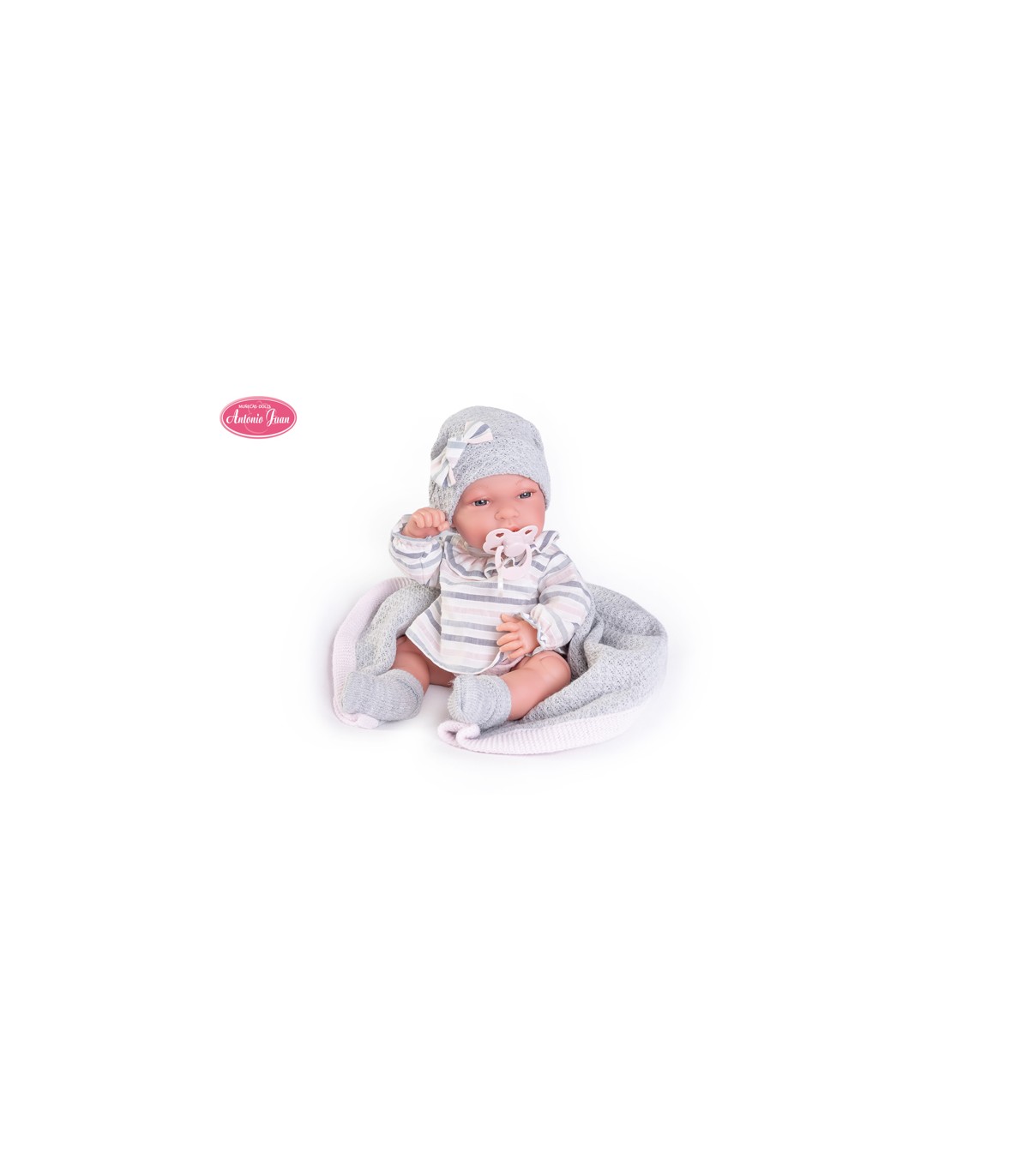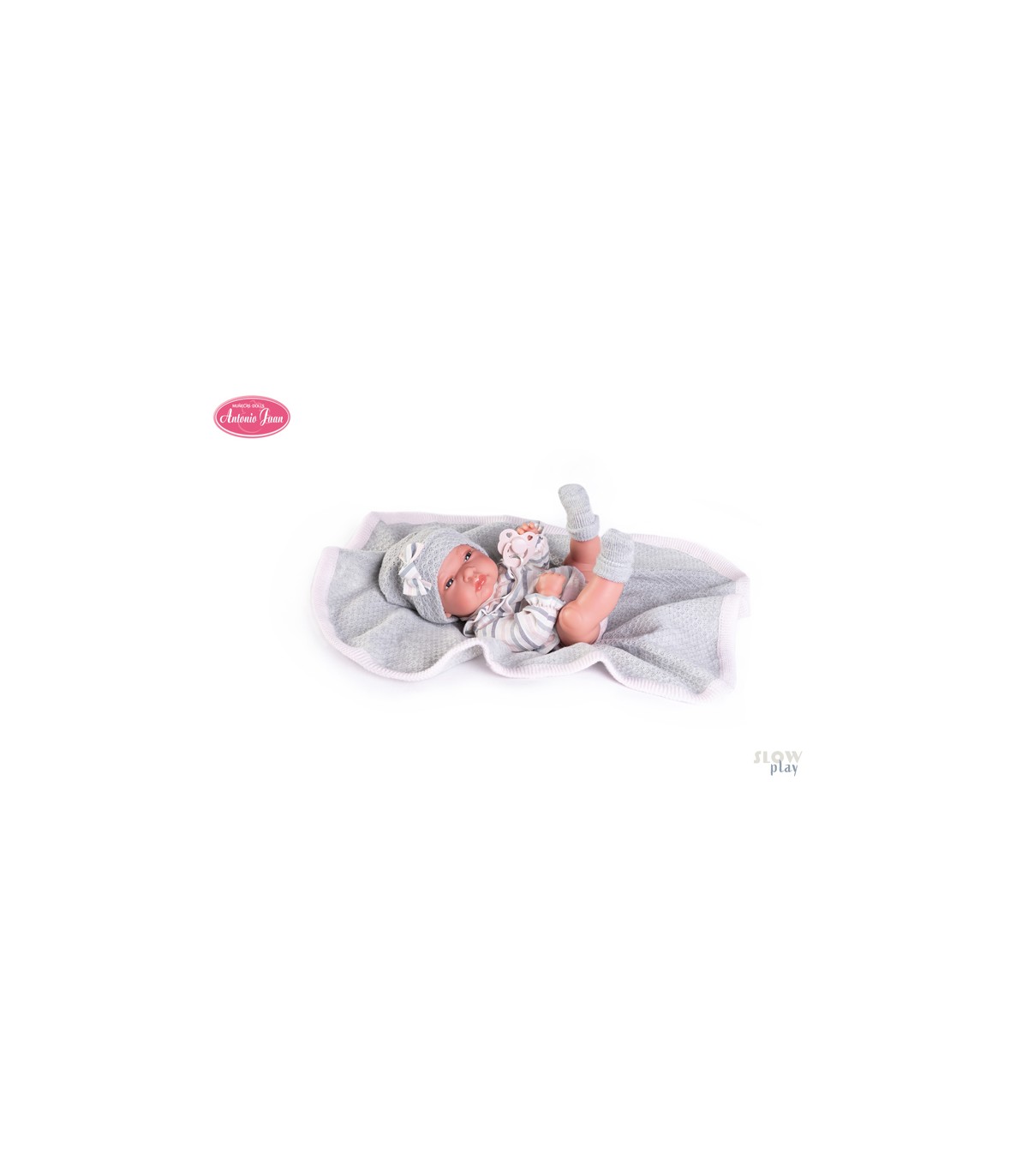 Blandito y de tacto especial, con cuerpo de tela y extremidades de suave vinilo, es un pequeño bebé fácil de manejar en el juego. Si le aprietas su barriguita balbucea para que disfrutes escuchando sus primeros sonidos y ampliar las posibilidades de juego. Baby Toneta palabritas lleva un bonito conjunto de pantalón y camiseta rosa a juego de su gorrito. Con su suave arrullo la podrás acunar y abrazar. No te olvides de ponerle el chupete para que se duerma y se relaje. Mide 33 cm. y pesa 505 gr. Baby Toneta, de Muñecas Antonio Juan está esperando poder jugar contigo.
