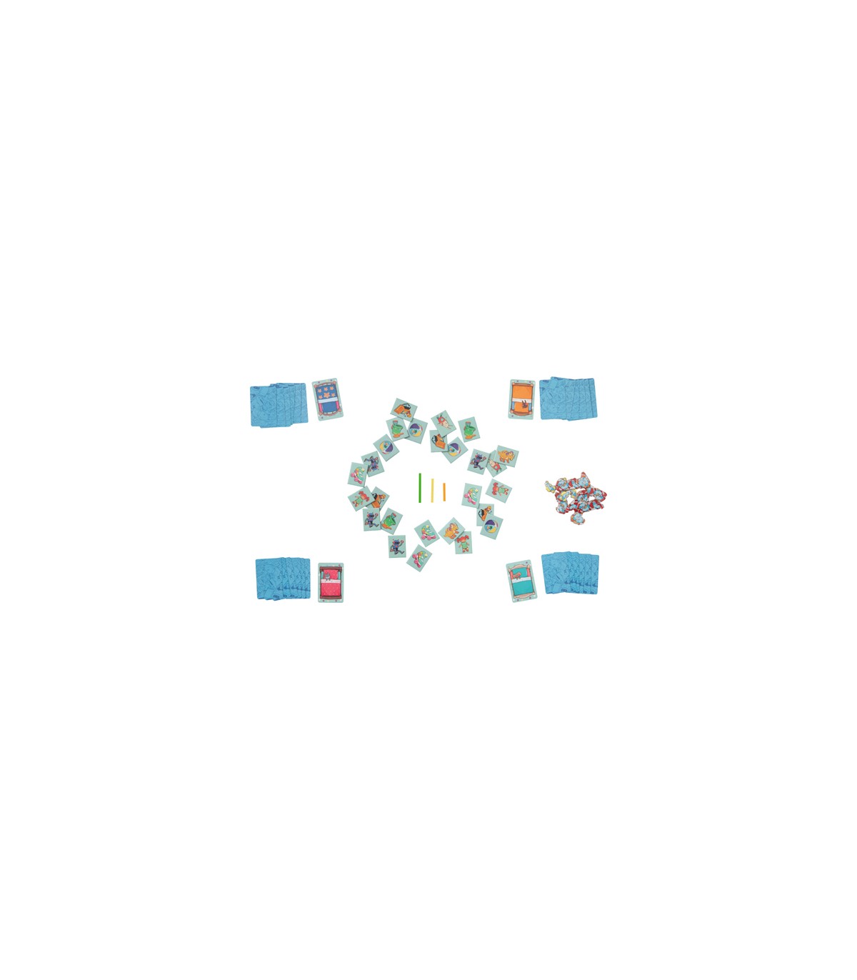¿Caos en la habitación? Para estos pícaros expertos del orden esto no es ningún problema. Cuando se oiga bien fuerte la señal de "¡a ordenaaar!" nos ponemos en marcha. Los niños/as deben llenar sus cajas de juguetes lo más rápidamente posible con las fichas de juguetes correspondientes. Si no han sido lo suficientemente rápidos, deben coger su ficha de caos y esconderla debajo de la cama. Gana quien tenga menos caos debajo de la cama.