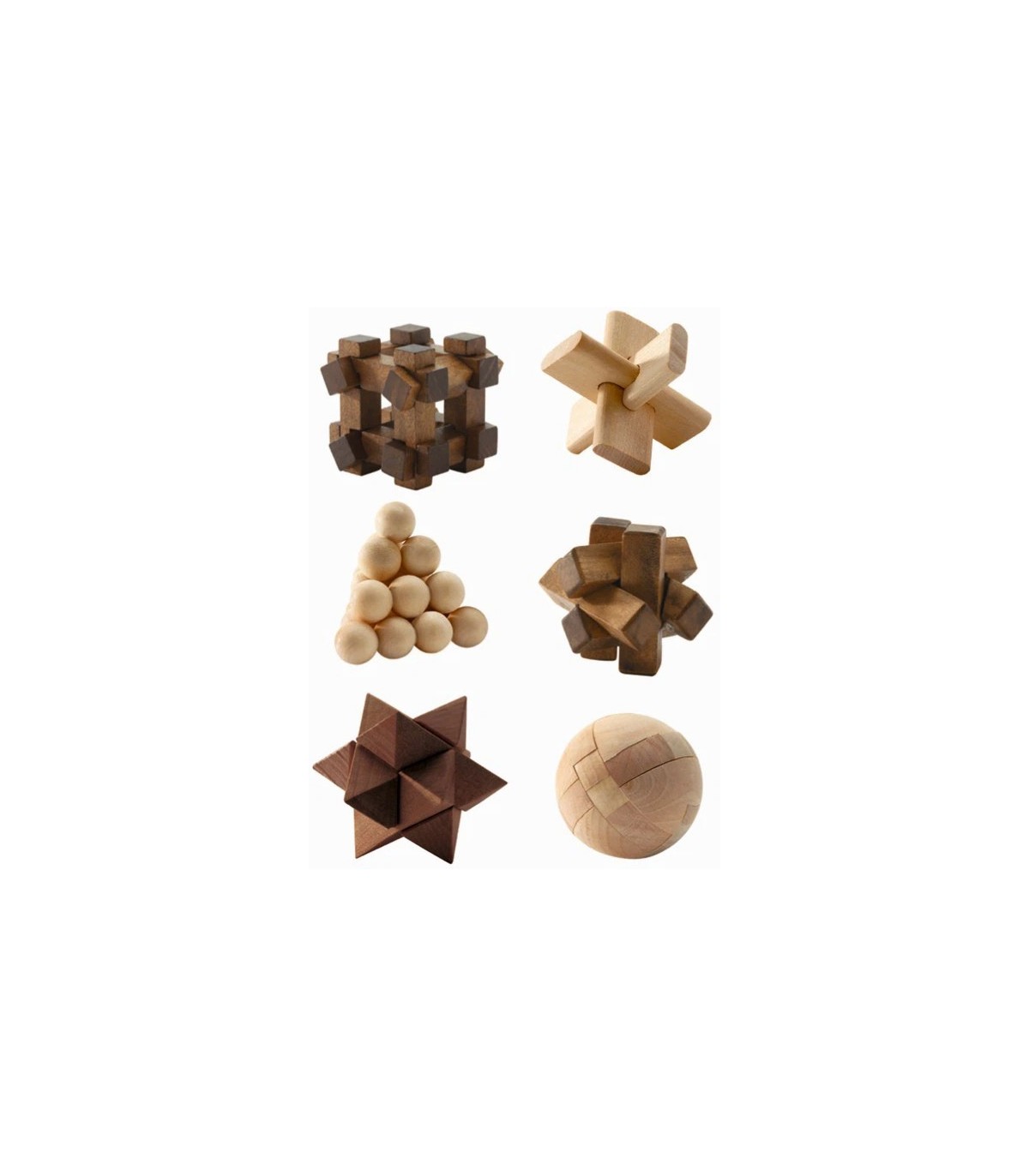Un juego de paciencia con 6 bonitos rompecabezas de madera para poner a prueba a sus neuronas. ¡Habrá que usar la lógica para conseguirlo! Un juego de rompecabezas para jugar individualmente. Desarrolla la paciencia y la reflexión. Soluciones incluidas.