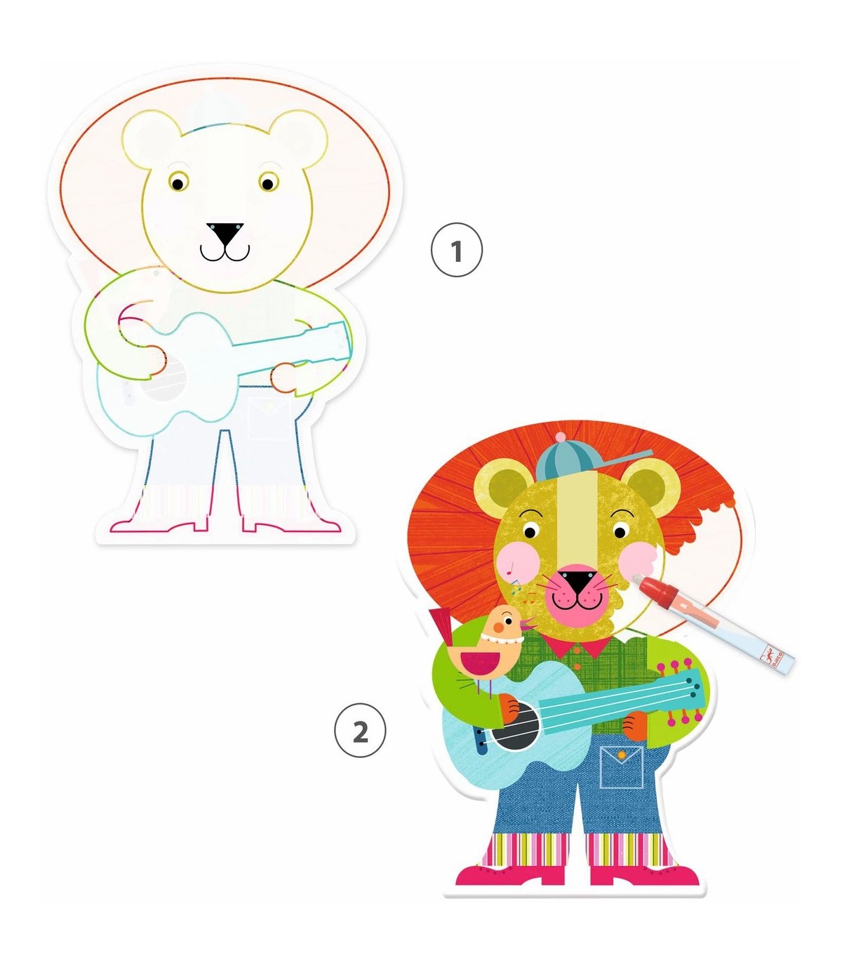 Una carpeta de coloreado al agua adaptada para los niños, a partir de los 18 meses. El niño colorea los animales con el rotulador al agua para descubrir lo que se esconde. ¡Pura magia!: ¡los motivos aparecen y cambian de color! ¡Cuando las láminas se secan, el niño vuelve a empezar! Una primera actividad de coloreado, a partir de los 18 meses.