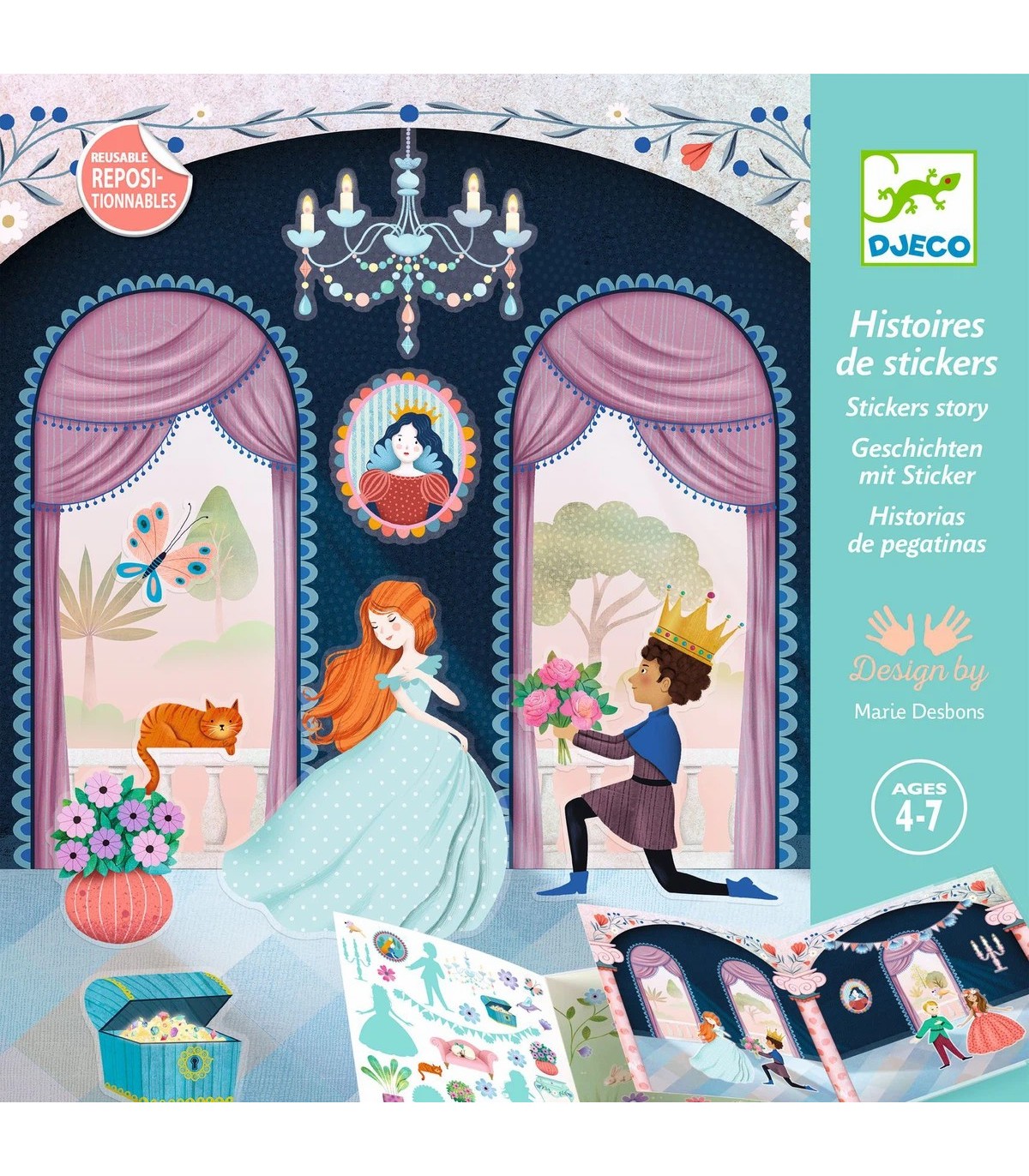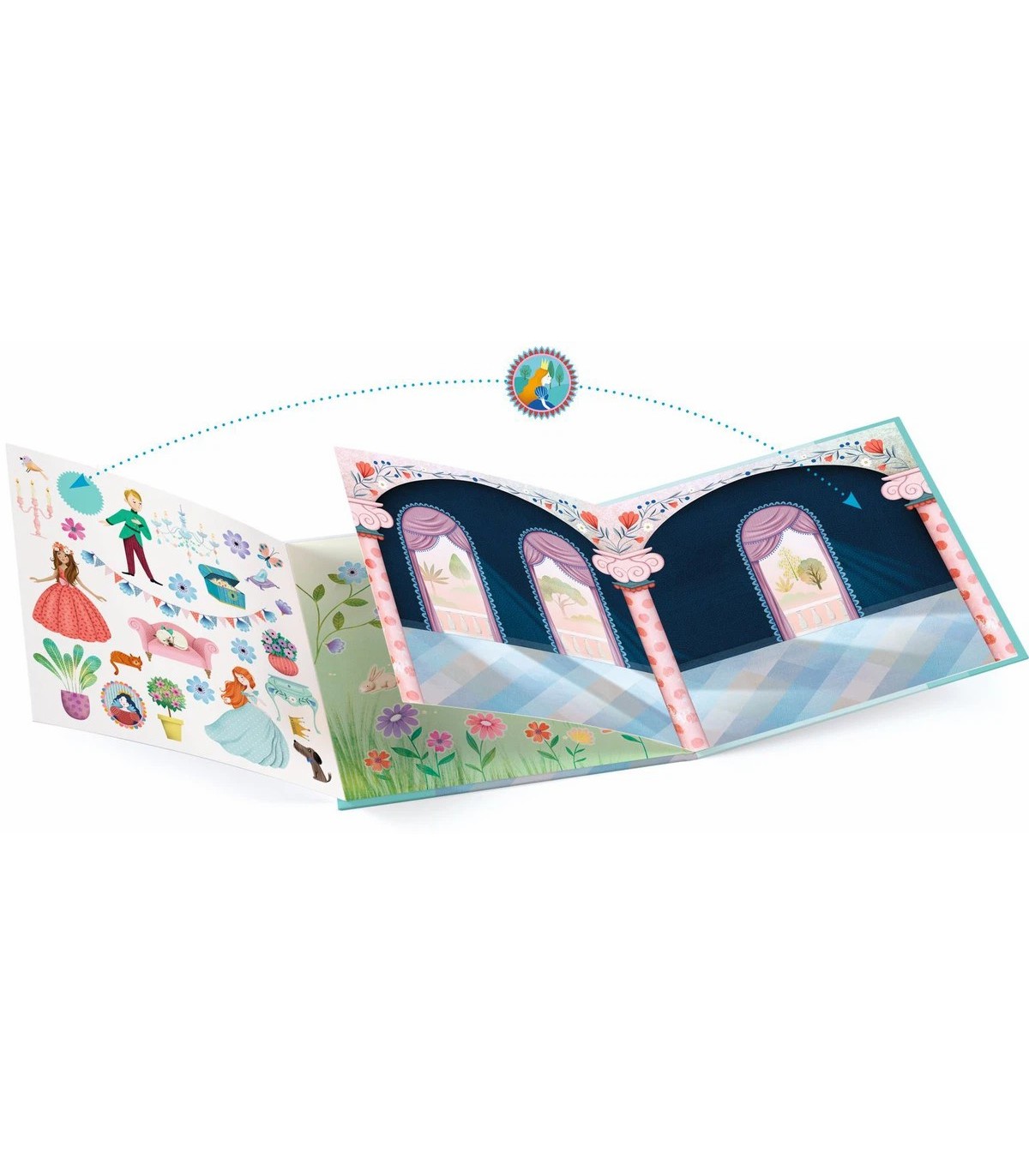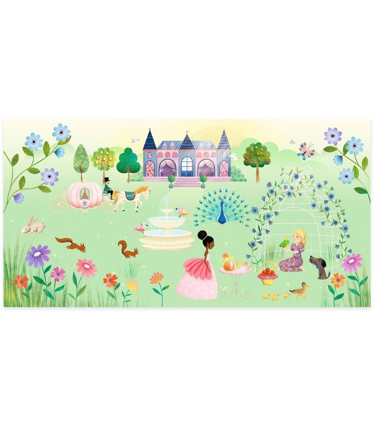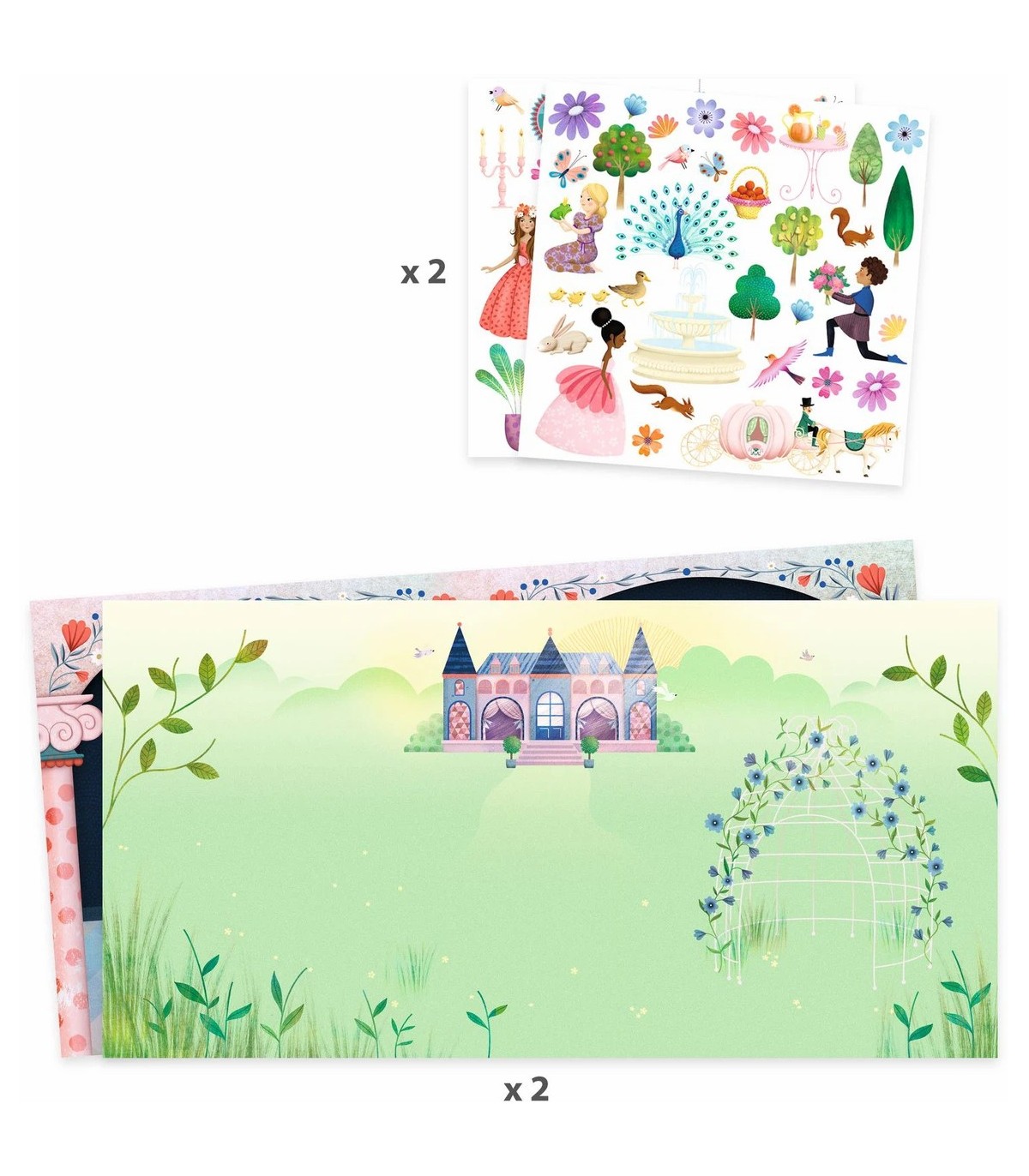 Dentro de este estuche rígido, el niño encontrará 2 grandes decorados que podrá animar con un montón de pegatinas: ¡primero los jardines del castillo y, luego, el salón de baile! Y, como son reutilizables, podrá inventarse todas las historias que quiera. Una actividad limpia y un práctico formato de estuche para llevar.
