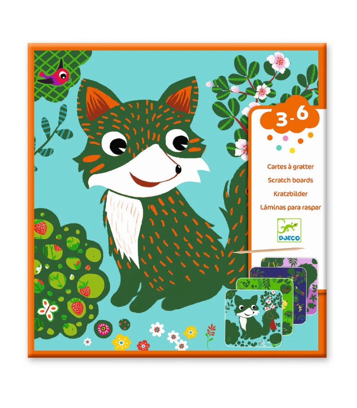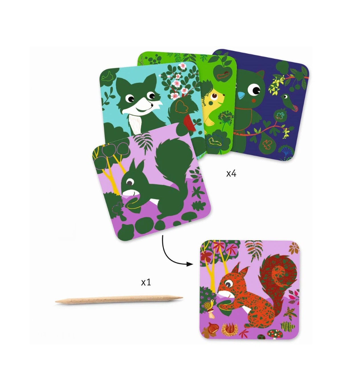 4 tableros para rascar con un palo de punta redonda, adecuado para los niños pequeños. Con el palo de madera y el folleto explicativo, el niño rasca la superficie de la tarjeta para hacer dibujos o descubrir sorpresas, ¡qué placer! Y aunque, llevado por su impulso, quiera rayarlo todo, el resultado también será bonito.