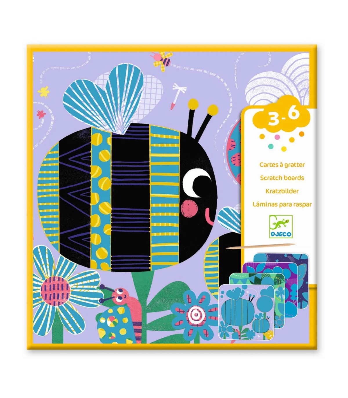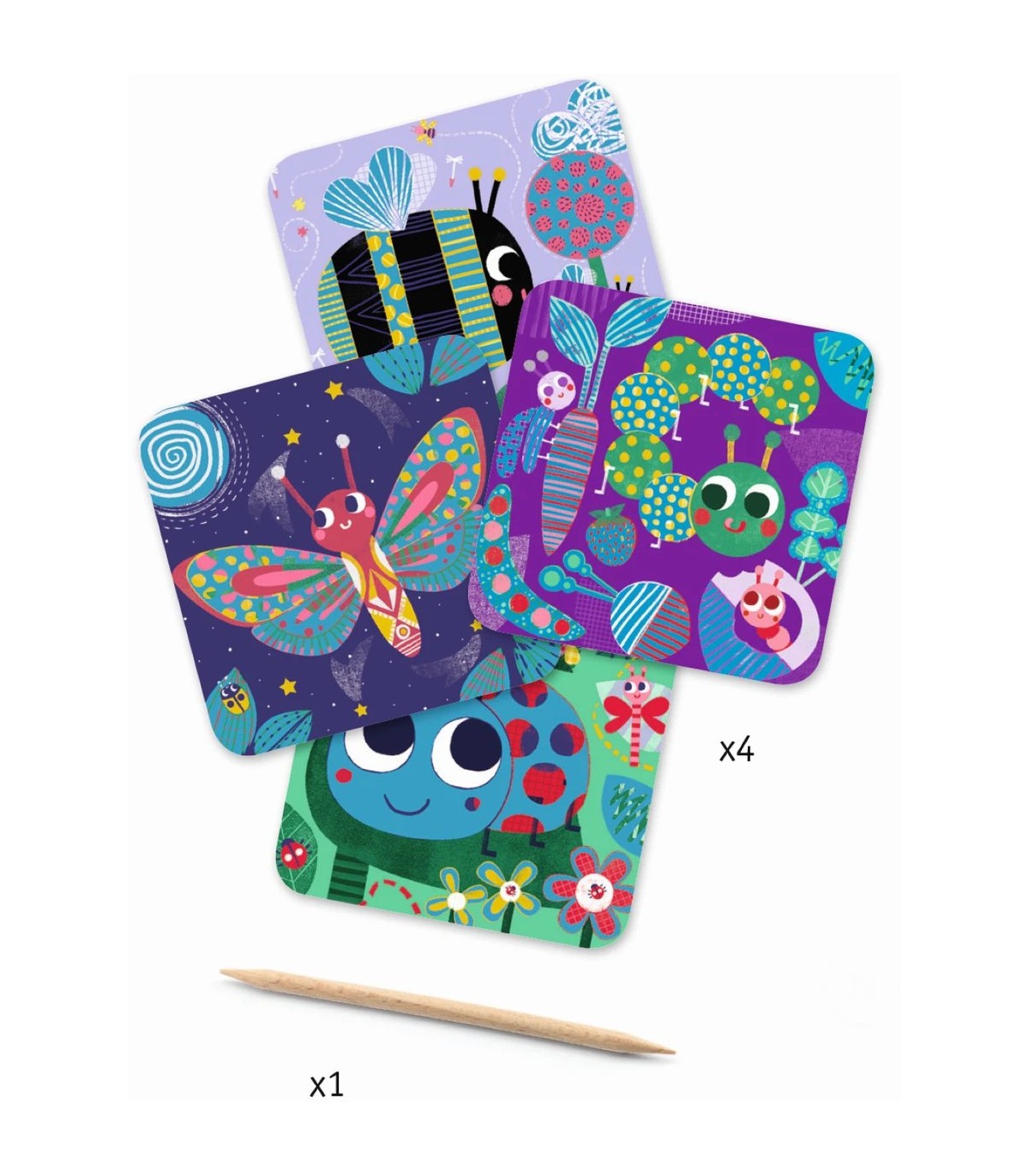 4 tableros para rascar con un palo de punta redondeada, adecuados para los niños pequeños. Con el palo de madera y el folleto explicativo, el niño rasca la superficie de la tarjeta para hacer dibujos o descubrir sorpresas, ¡qué placer! Y aunque, llevado por su impulso, quiera rayarlo todo, el resultado también será bonito.