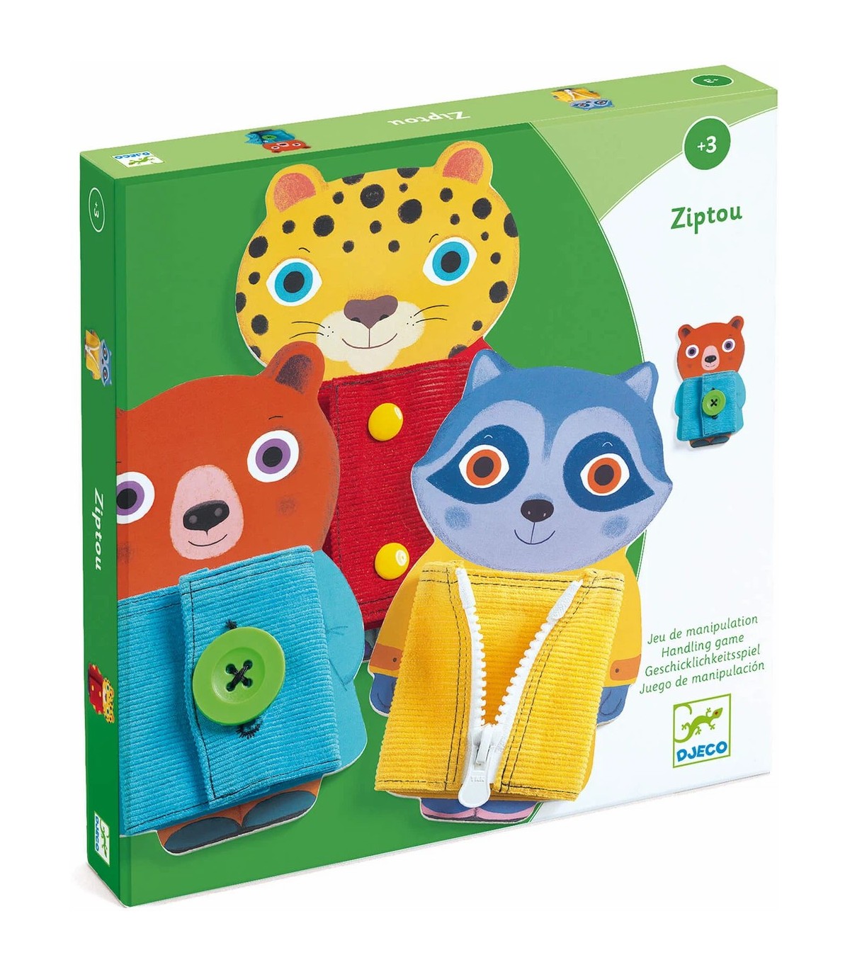 Un juego de destreza manual con tres bonitos animalitos de madera. El niño practica con cada uno de ellos a abrochar y desabrochar sus prendas de tela. A partir de los 3 años, Ziptou respalda los primeros aprendizajes. Tres planchas con forma de animales: un leopardo, un oso y un mapache. Tres sistemas de cierre: botones a presión, botones para abotonar y cremallera. ¡Las prendas de los animales son muy suaves!