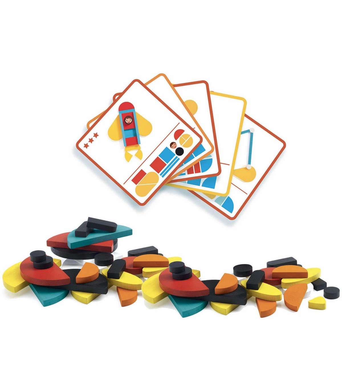 Un juego de construcción de madera para crear vehículos coloridos. El niño utiliza las piezas de madera colocándolas una al lado de otra o una encima de otra para reproducir los vehículos que aparecen en las tarjetas modelo.
