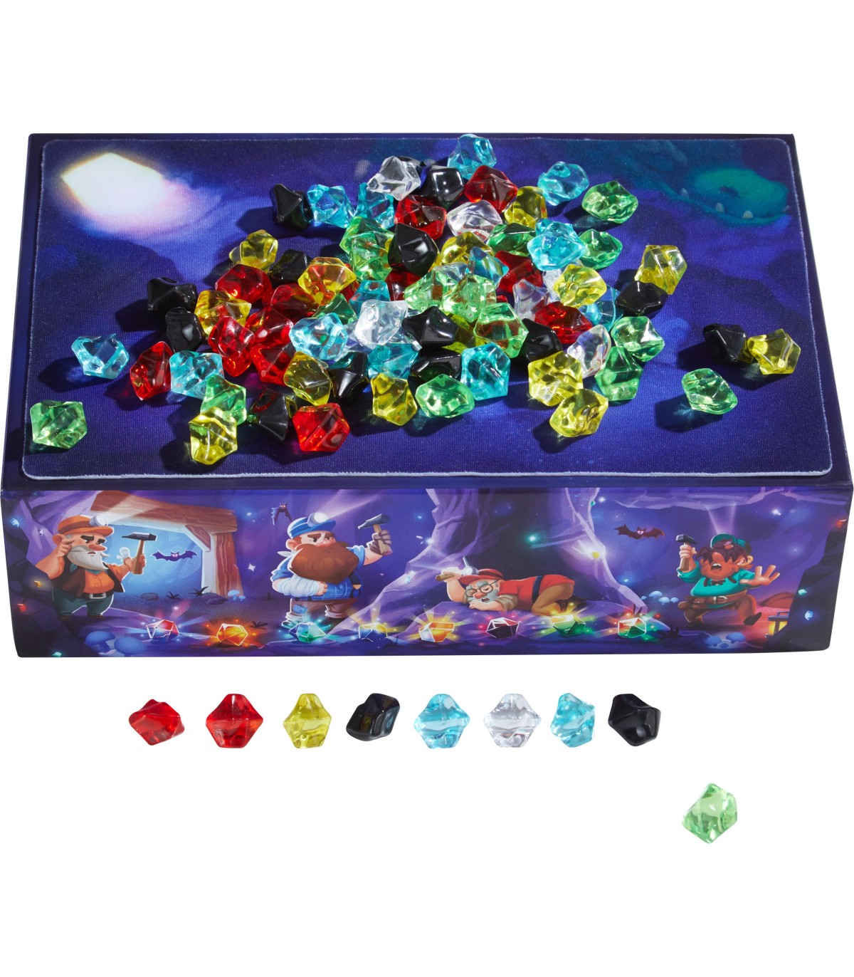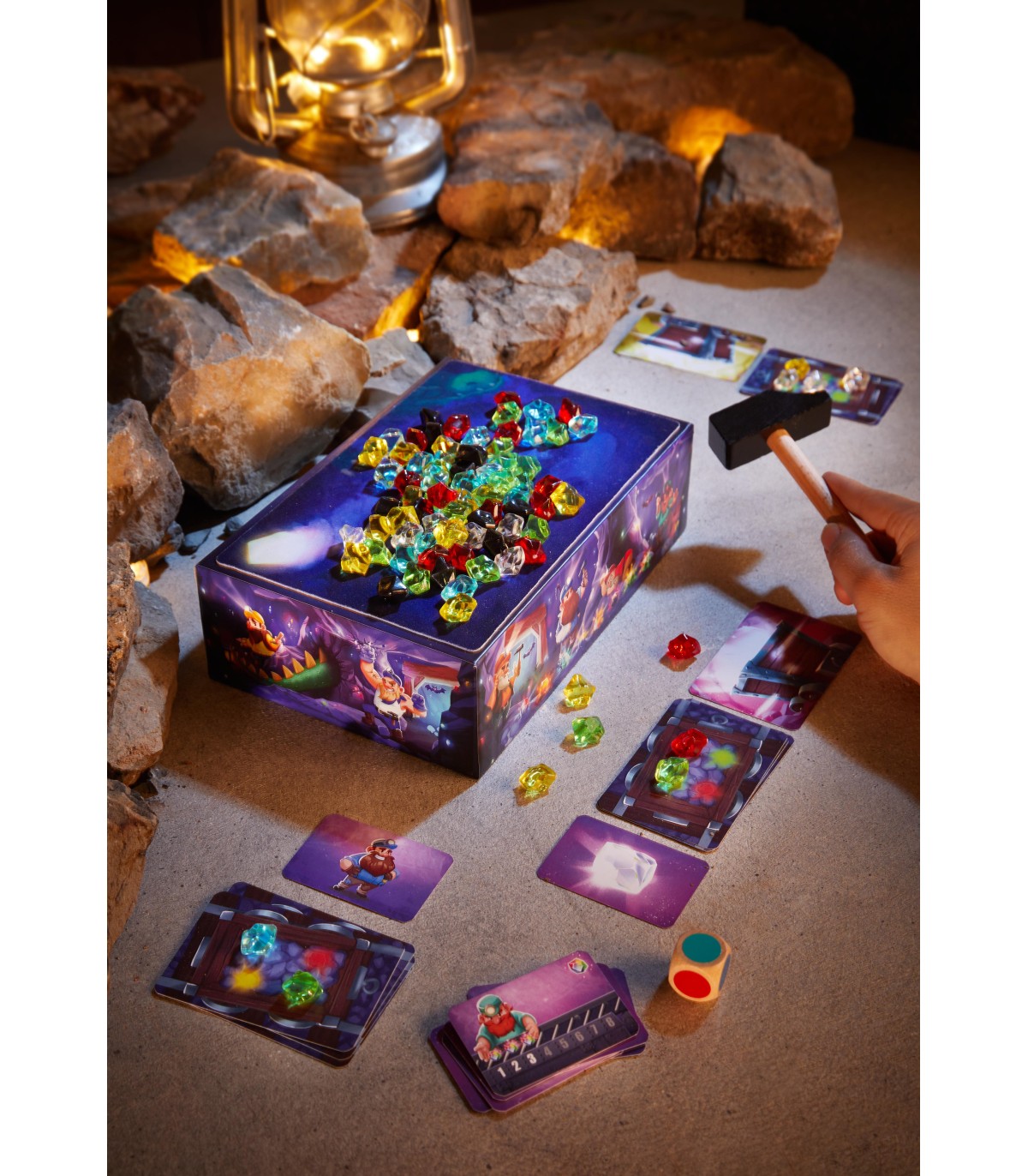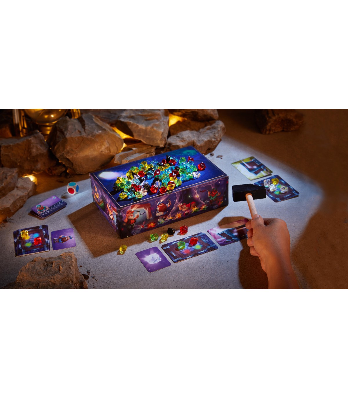 Los jugadores/as conseguirán valiosos tesoros golpeando la caja con el martillo. Para completar sus tareas, deberán recoger el número y el color de piedras preciosas correspondientes. Pero, ¡cuidado!, porque quien golpee con demasiada fuerza despertará al dragón Dragomir y perderá su botín. Gana quien consiga cargar primero sus 4 vagonetas.