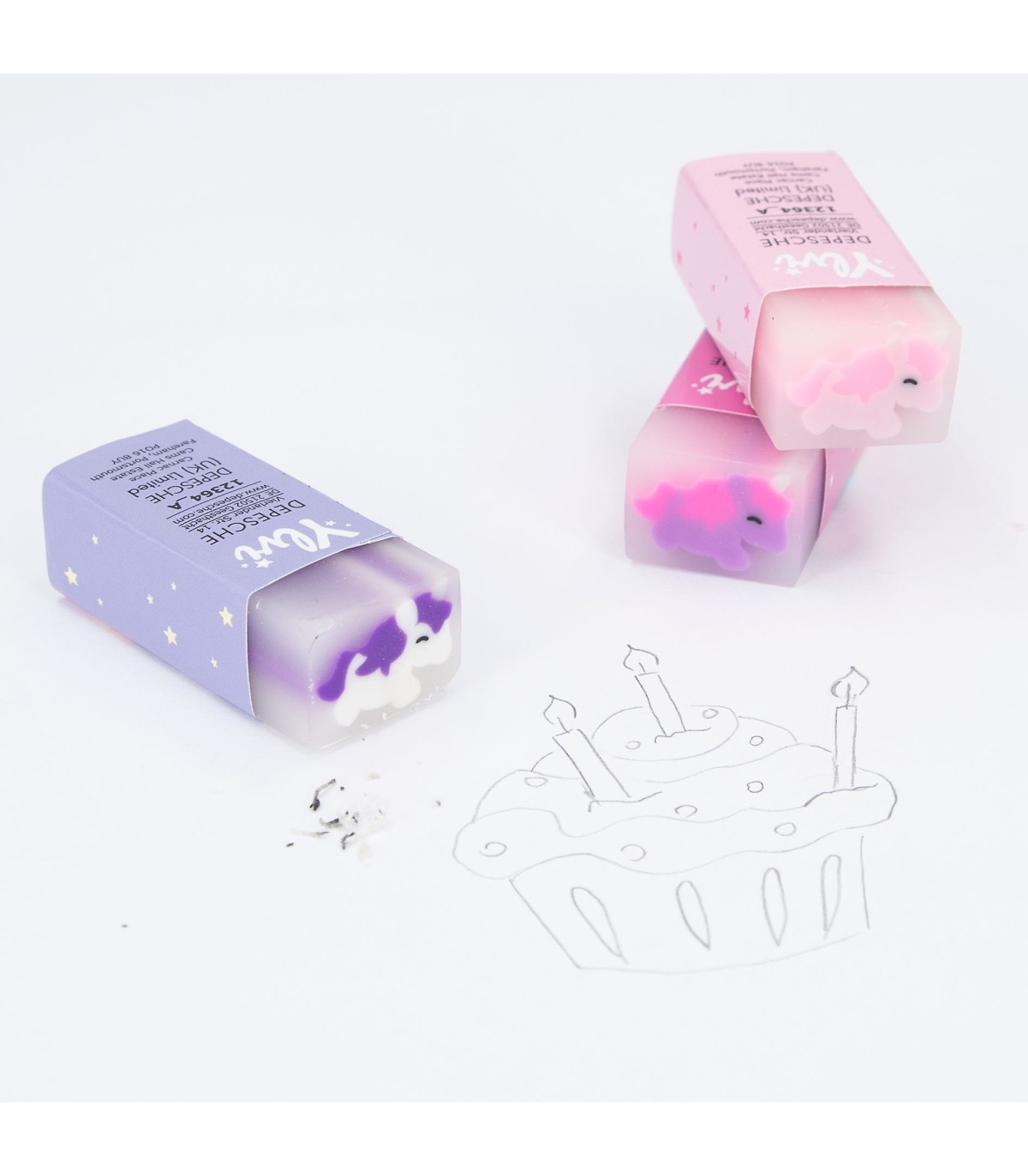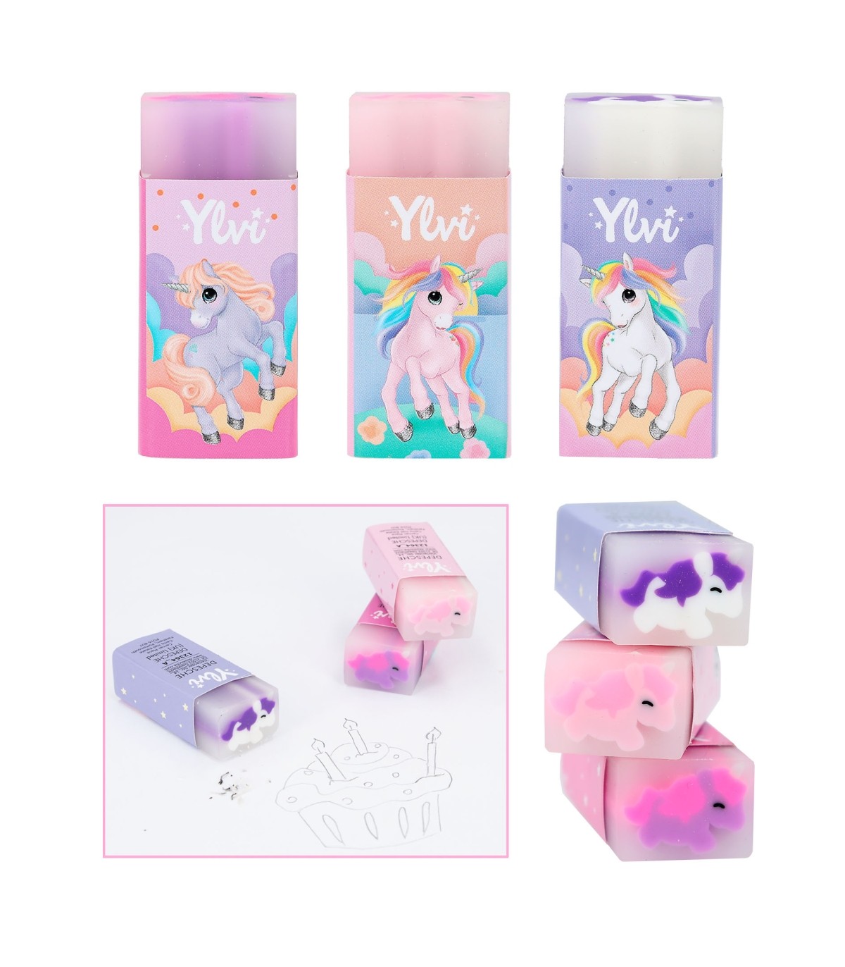 Así borrar resultará muy dulce y mono. Estas 3 gomas de borrar de Ylvi son de gelatina transparente y en su interior se puede ver un precioso unicornio (gama de colores: lila/fucsia, blanco/violeta, rosa/fucsia). Se venden envueltas en película de plástico y rematadas con banderola de diseño muy cuidado en los mismos colores.