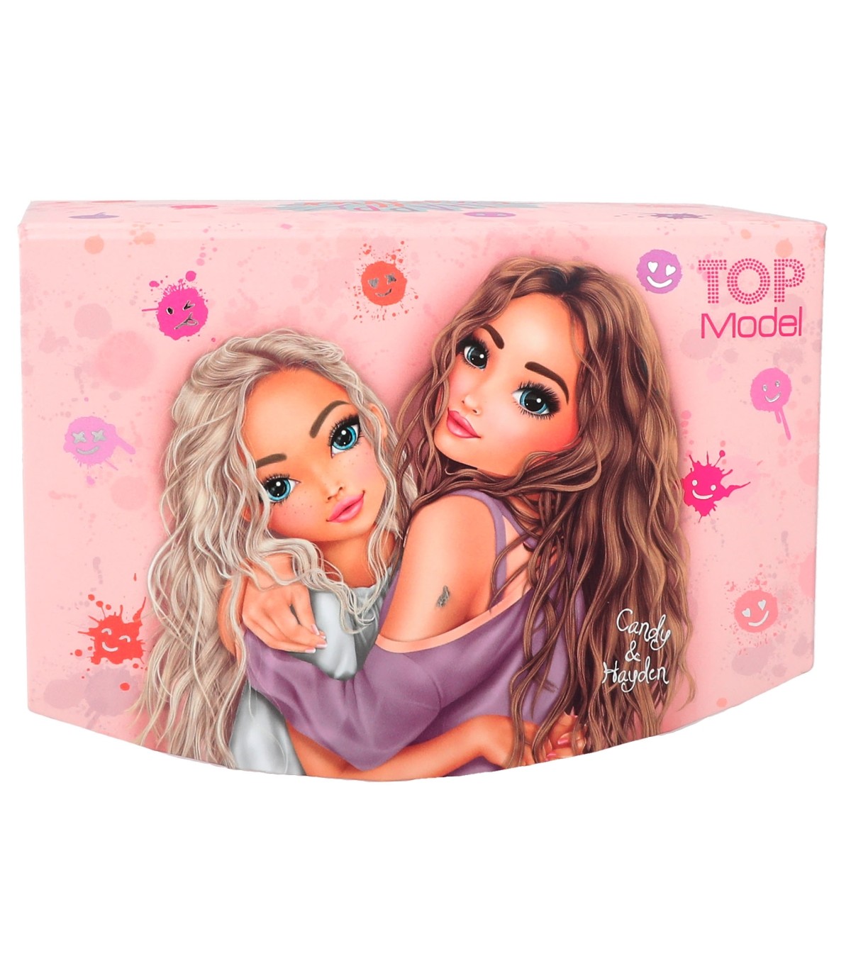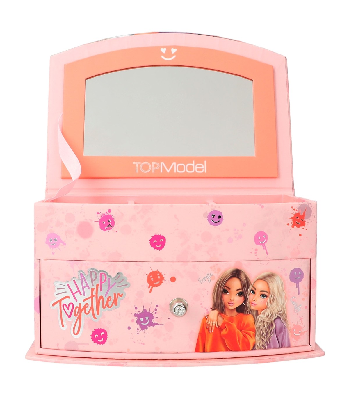 Este pequeño joyero de TOPModel hace feliz a cualquiera con sus colores alegres, smileys con forma de manchurrón y dos maravillosas modelos amigas. El joyero lleva espejo en la cara interior de la tapa abatible, tiene un compartimento principal subdividido y un cajón con un brillante en el tirador.