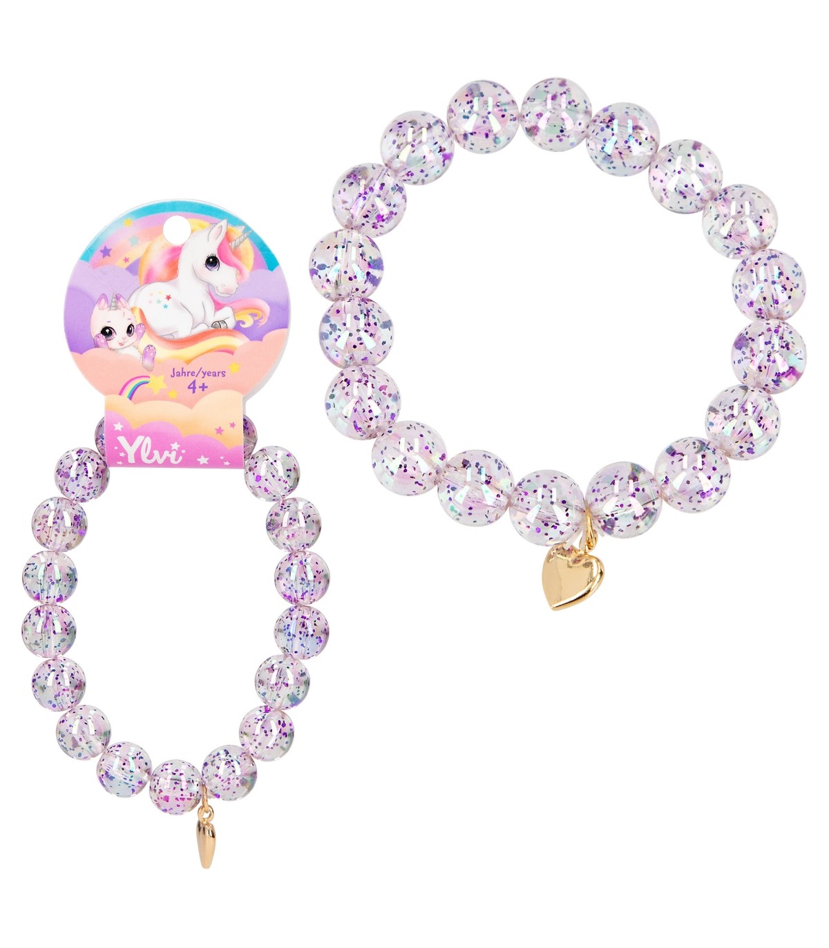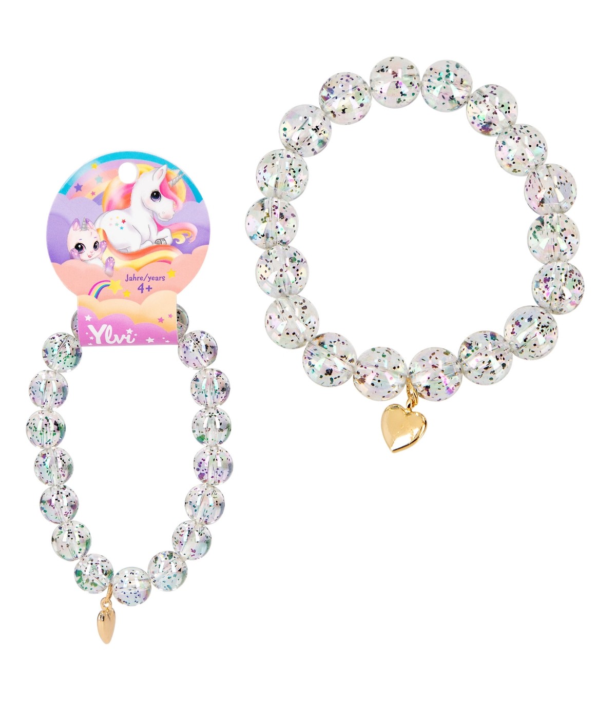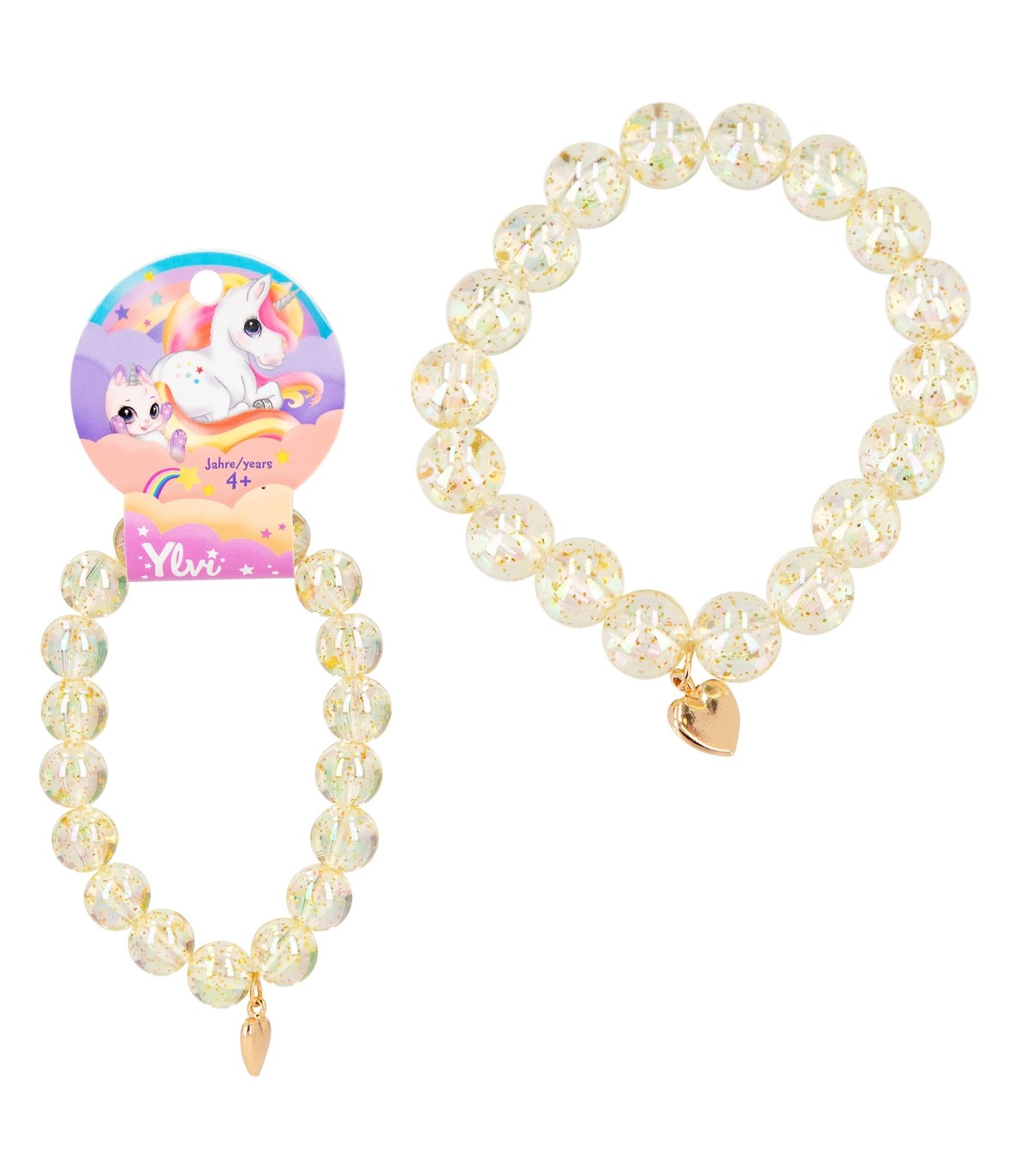 Bisutería de Ylvi con destellos maravillosos. Las pulseras elásticas de cuentas transparentes resplandecientes (disponibles en lila, rosa, amarillo y color neutro totalmente transparente) llevan como colgante un monísimo corazón dorado.