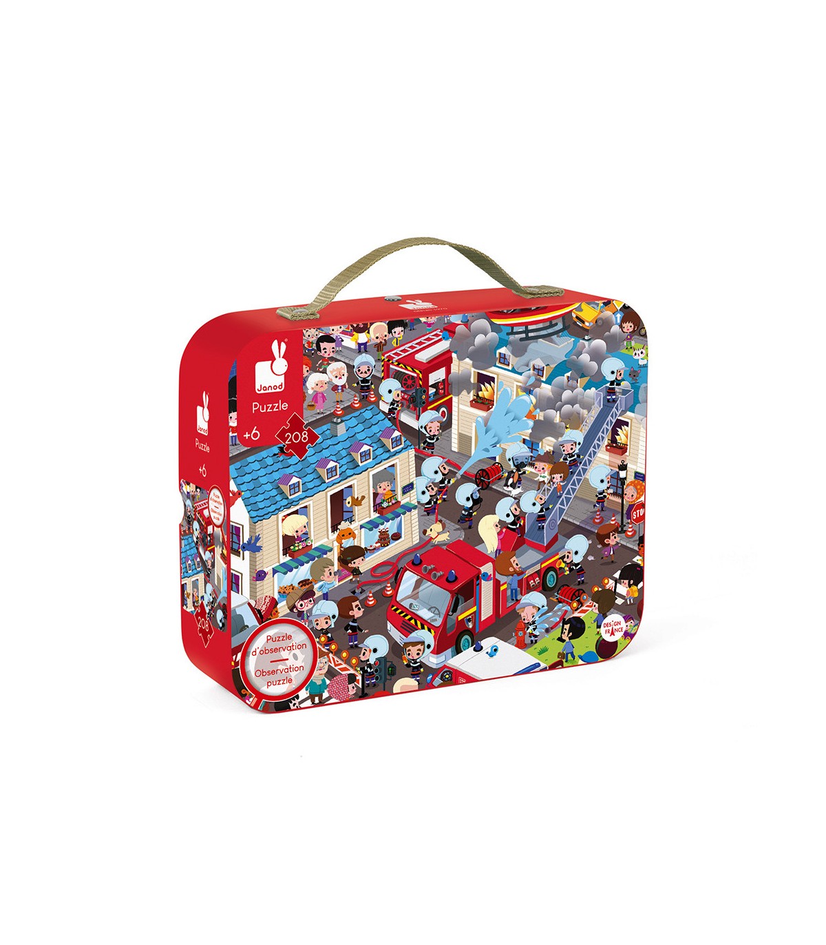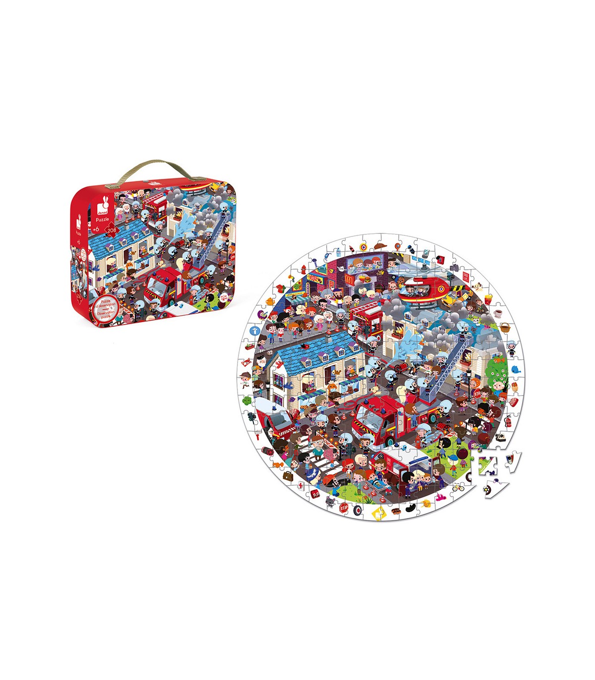 2 juegos en 1 : un puzle sobre el tópico de los bomberos y un juego de observación. Una vez completado el puzle, el niño deberá encontrar los 51 objetos o ilustraciones que se muestran alrededor el puzle. Puzle redondo de 50 cm de diámetro. Contiene un poster a utilizar como modelo. Número de piezas : 208. Este producto está hecho de material certificado FSC® y otro material controlado.