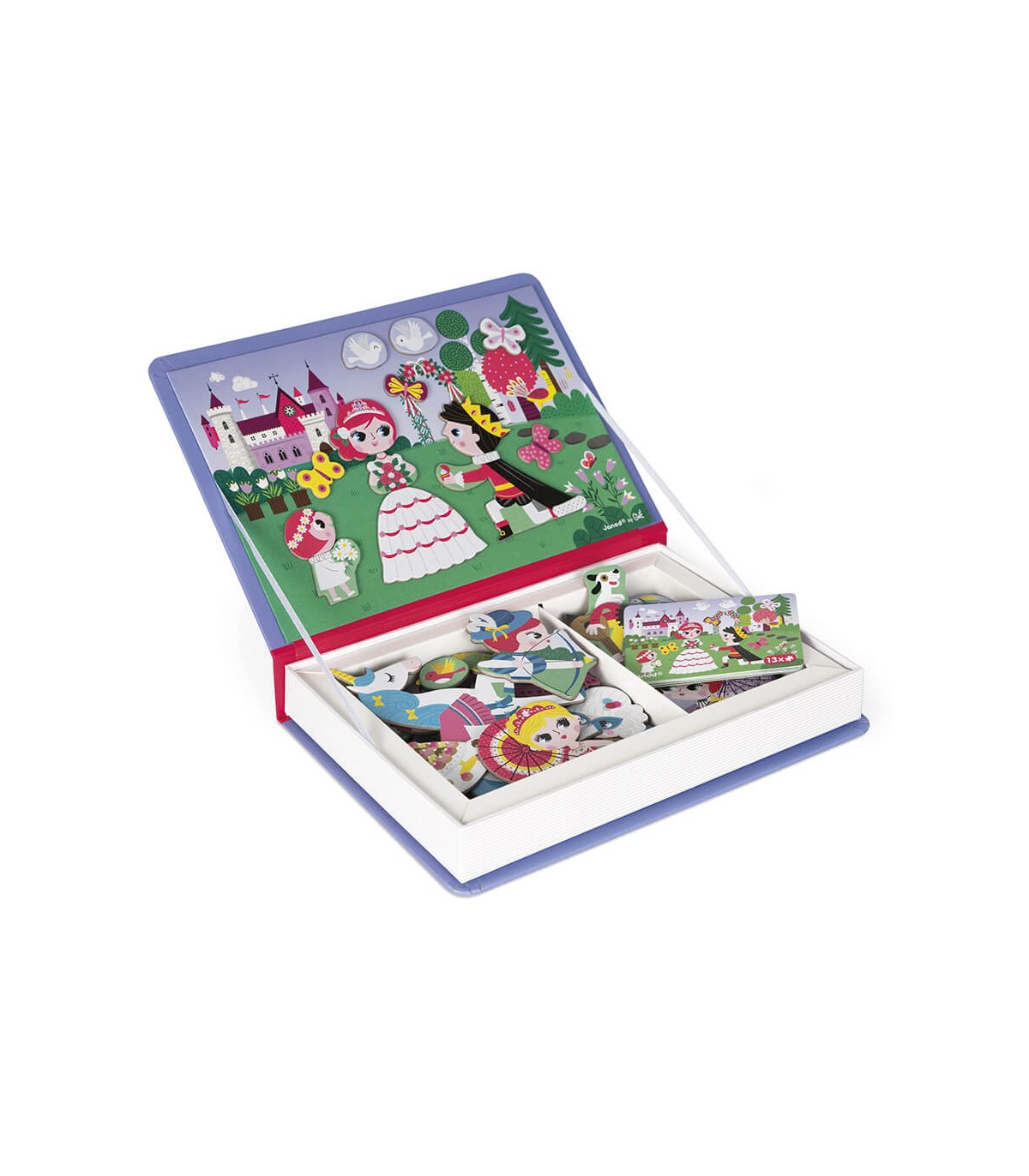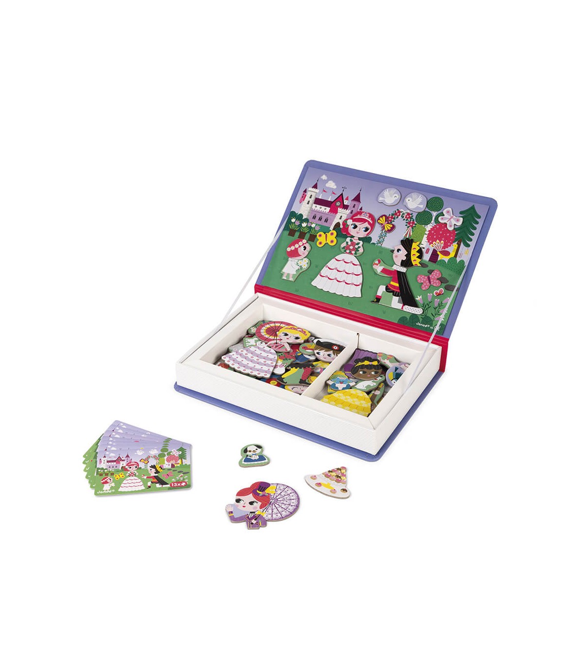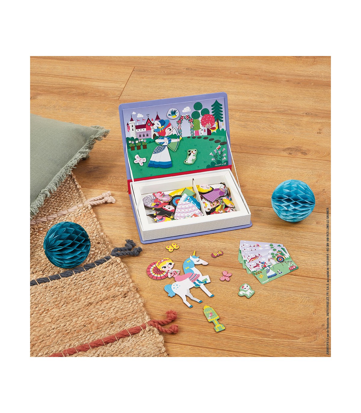 Juego educativo magnético de cartón con la temática de las princesas. Compuesto por 55 imanes y 7 tarjetas. Una vez se ha abierto el libro, el objetivo del juego es recomponer la escena que indica la tarjeta con ayuda de los imanes. Este producto está hecho de material certificado FSC® y otro material controlado.