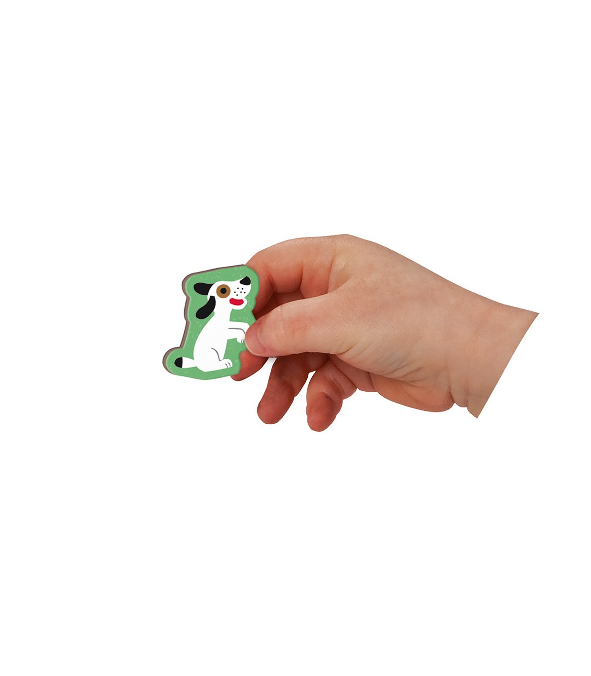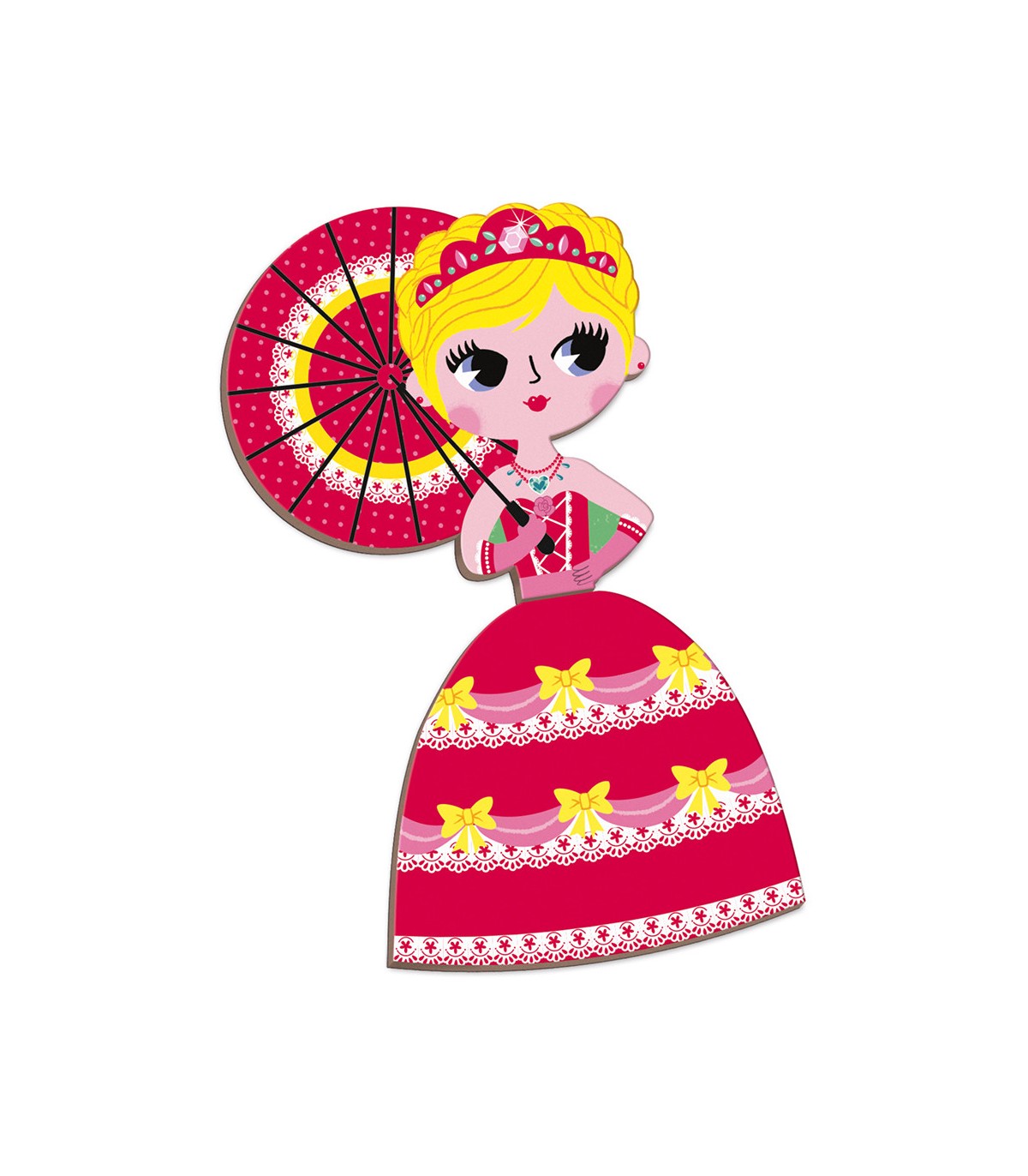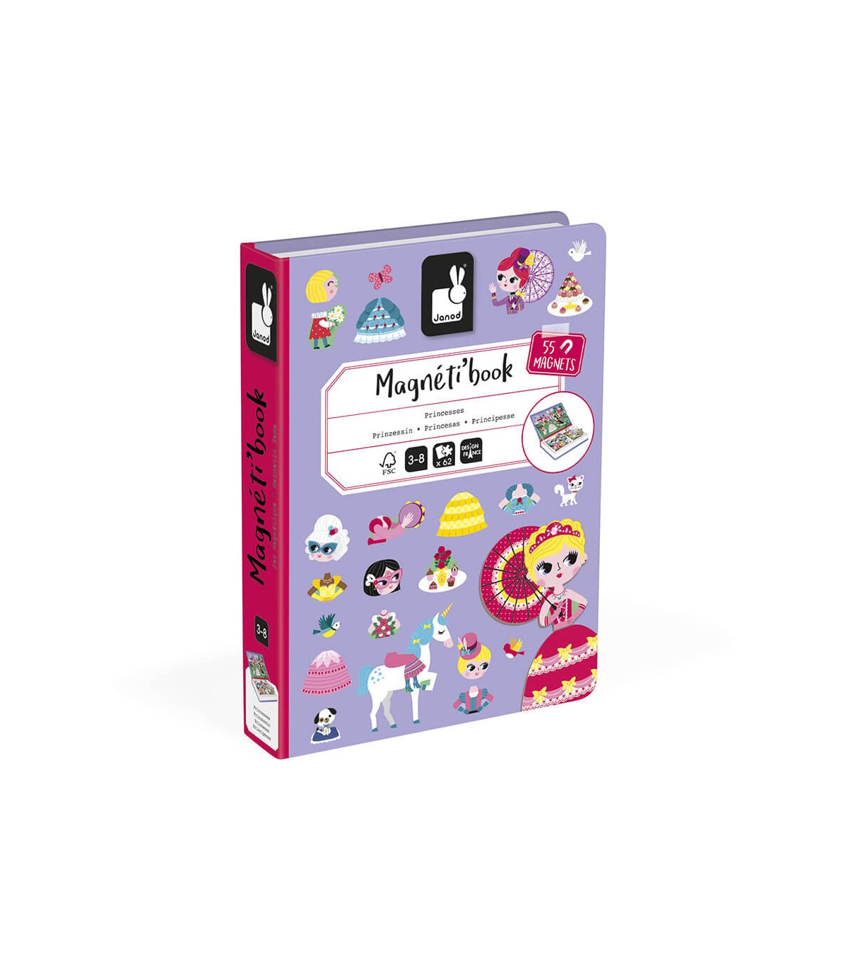 Juego educativo magnético de cartón con la temática de las princesas. Compuesto por 55 imanes y 7 tarjetas. Una vez se ha abierto el libro, el objetivo del juego es recomponer la escena que indica la tarjeta con ayuda de los imanes. Este producto está hecho de material certificado FSC® y otro material controlado.