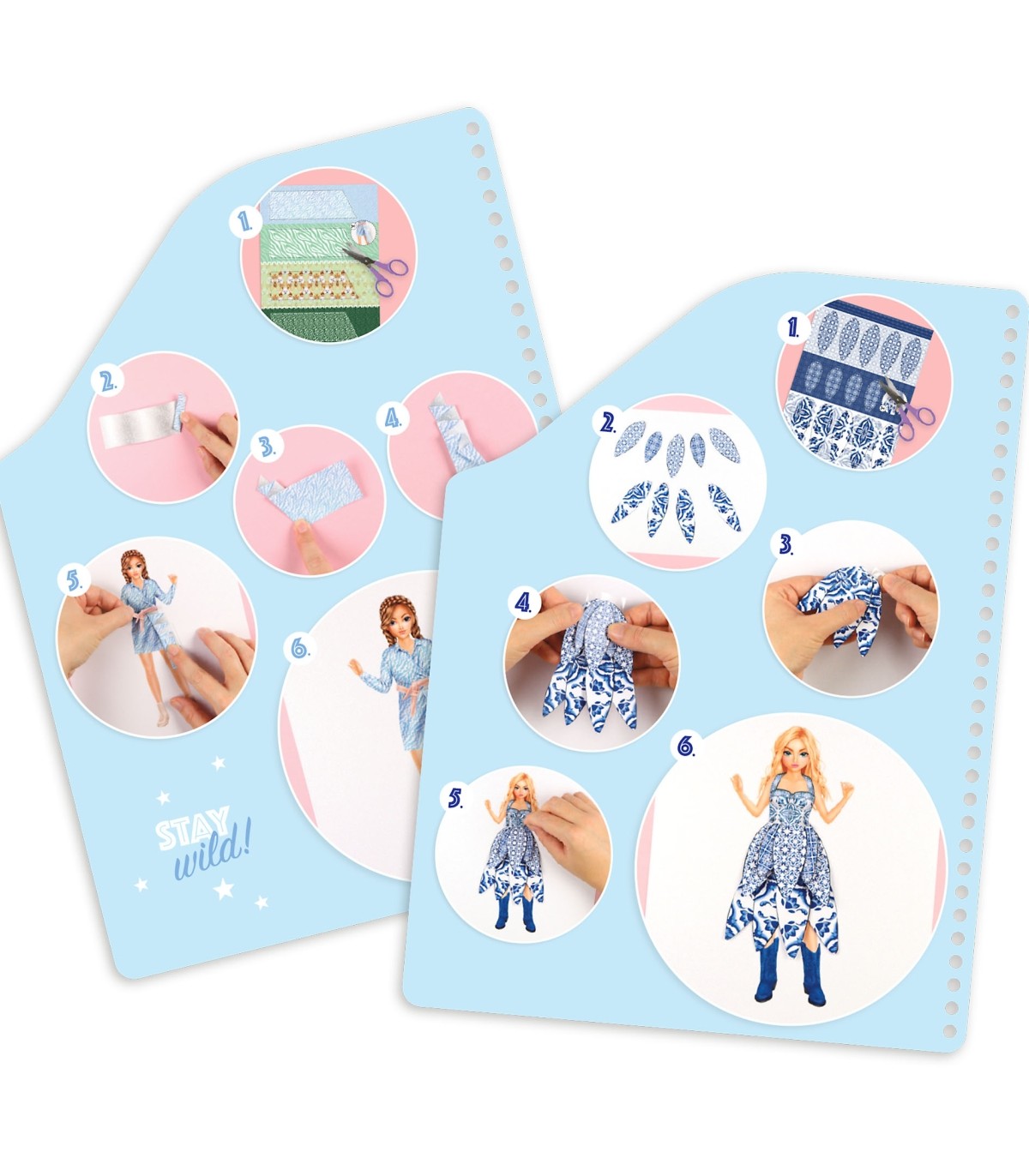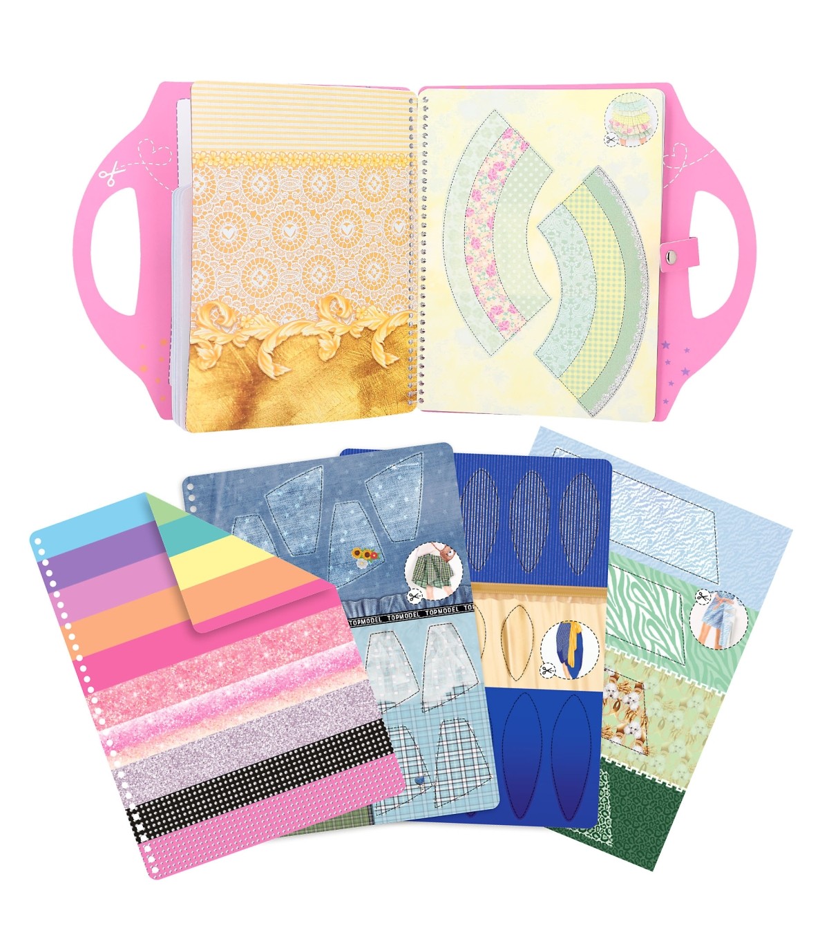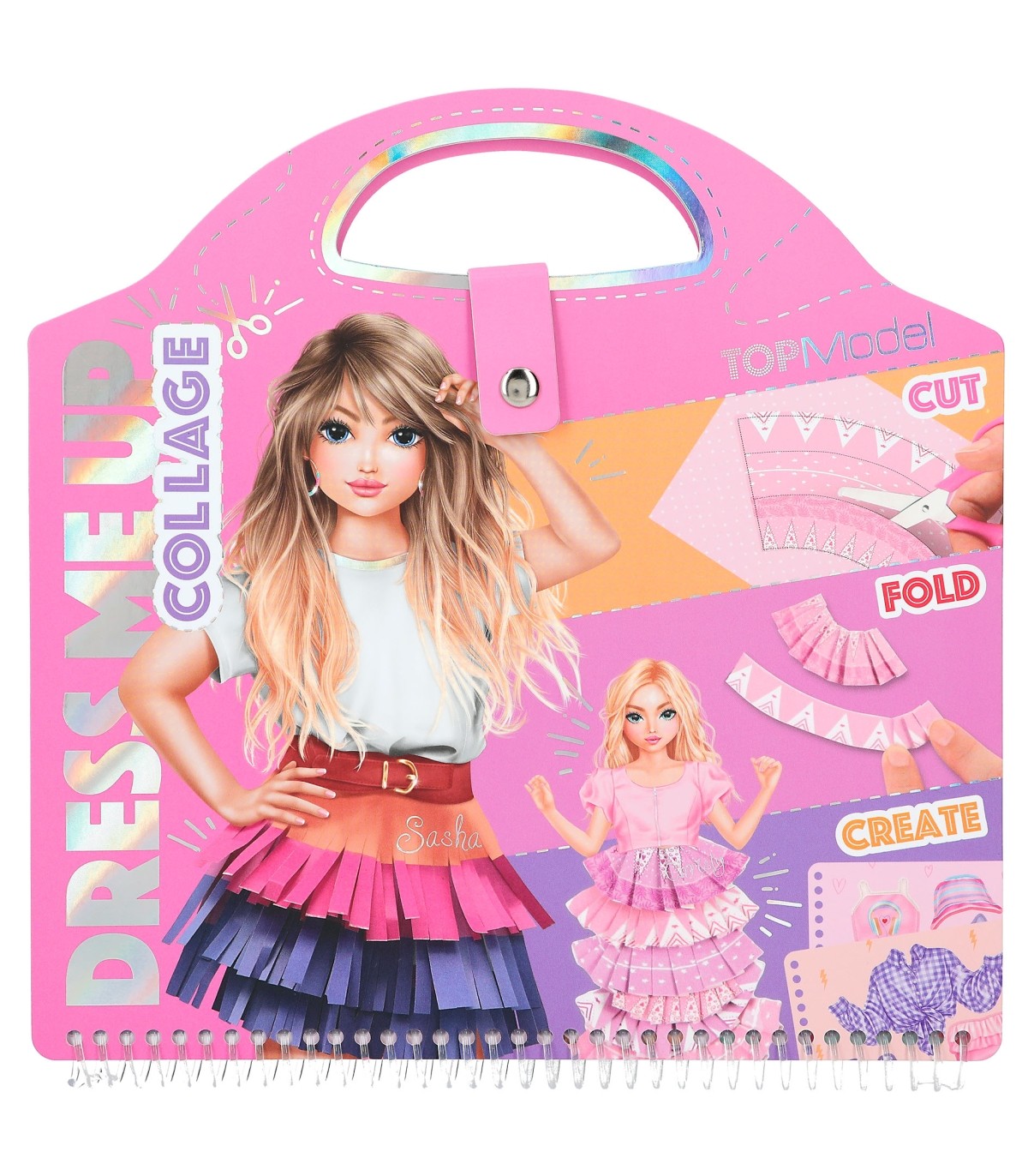 ¡Para llevar fácilmente a todas partes diseños chulísimos! El cuaderno de dibujo de TOPModel con forma de bolso con cierre de presión tiene 20 páginas con figurines de modelos, 20 hojas con estampados de telas maravillosos, 5 páginas de pegatinas, 1 página de pegatinas satinadas y 1 página de pegatinas de vinilo. ¡Las sencillas instrucciones para doblar y completar las manualidades, unidas a la creatividad de las niñas darán como resultado el diseño de estilos únicos!