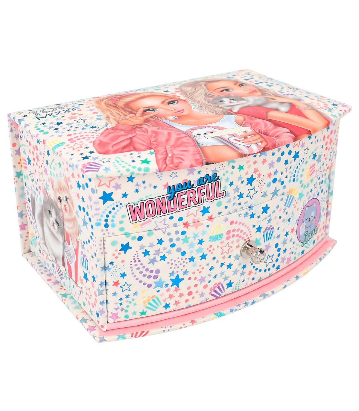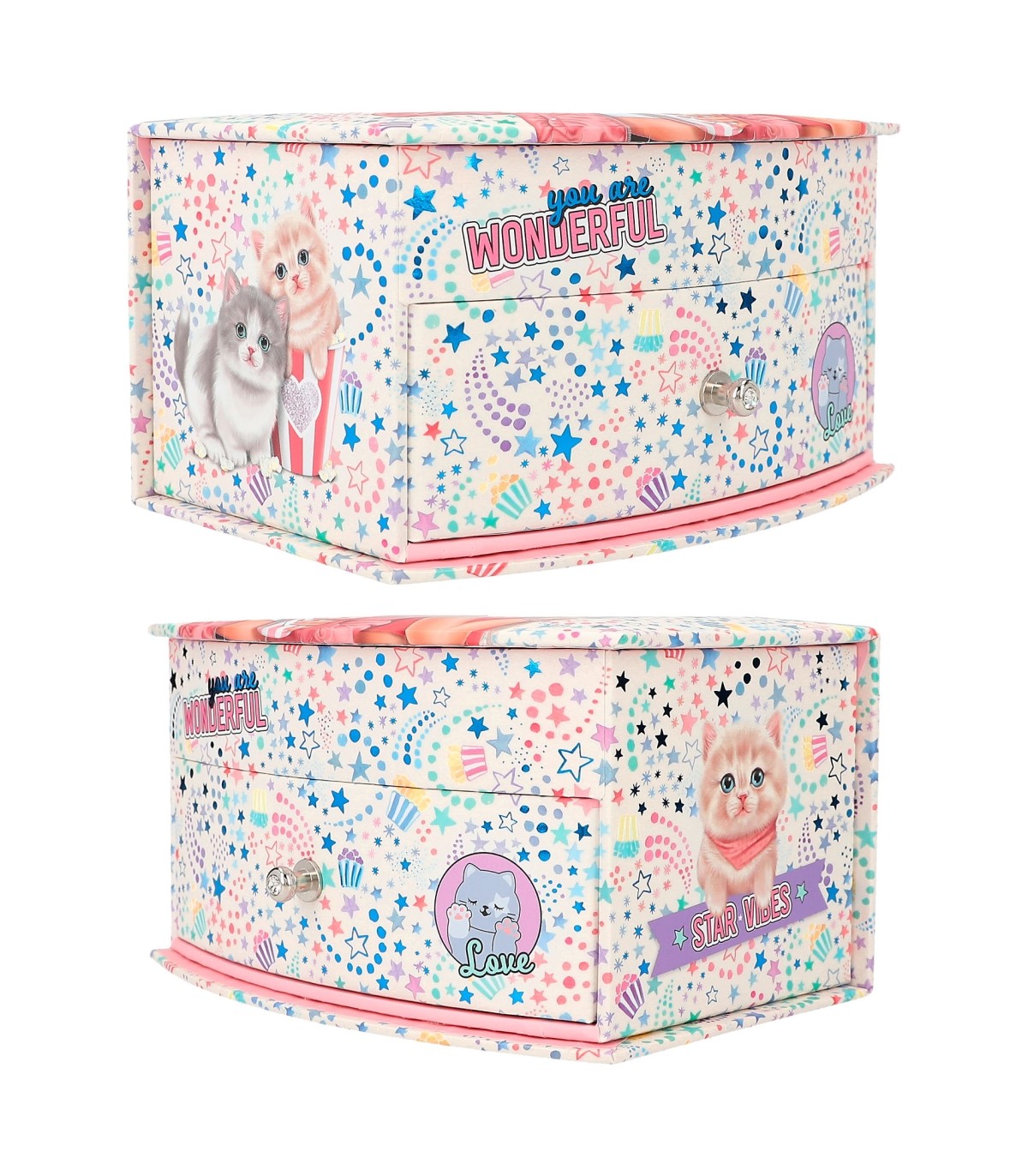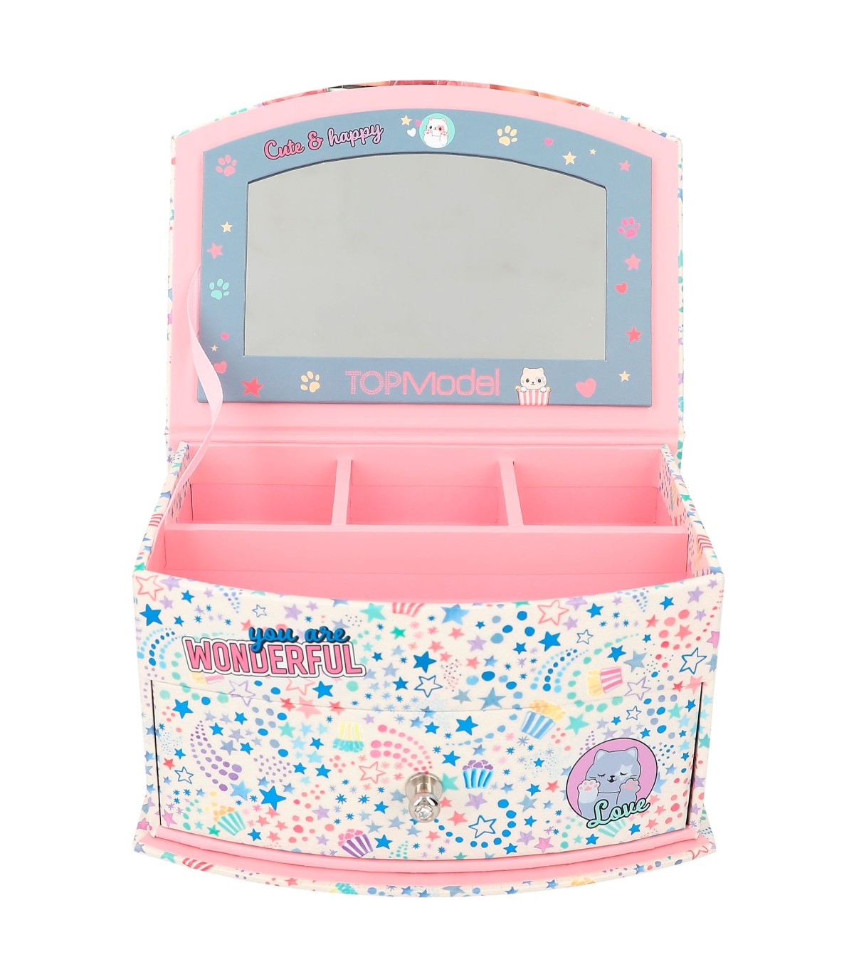 Para guardar las cosas de valor personales. El joyero pequeño Cutie Star de TOPModel está adornado íntegramente con estrellitas monísimas, sobre las que destacan iconos simpáticos como cajas de palomitas de maíz, gatitos monísimos y la imagen de dos modelos a la última. La tapa abatible lleva un espejo en la cara interior. El joyero tiene un compartimento principal subdividido y un cajón grande con un diamante de estrás como tirador.
