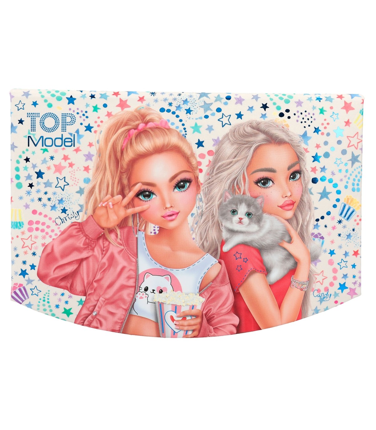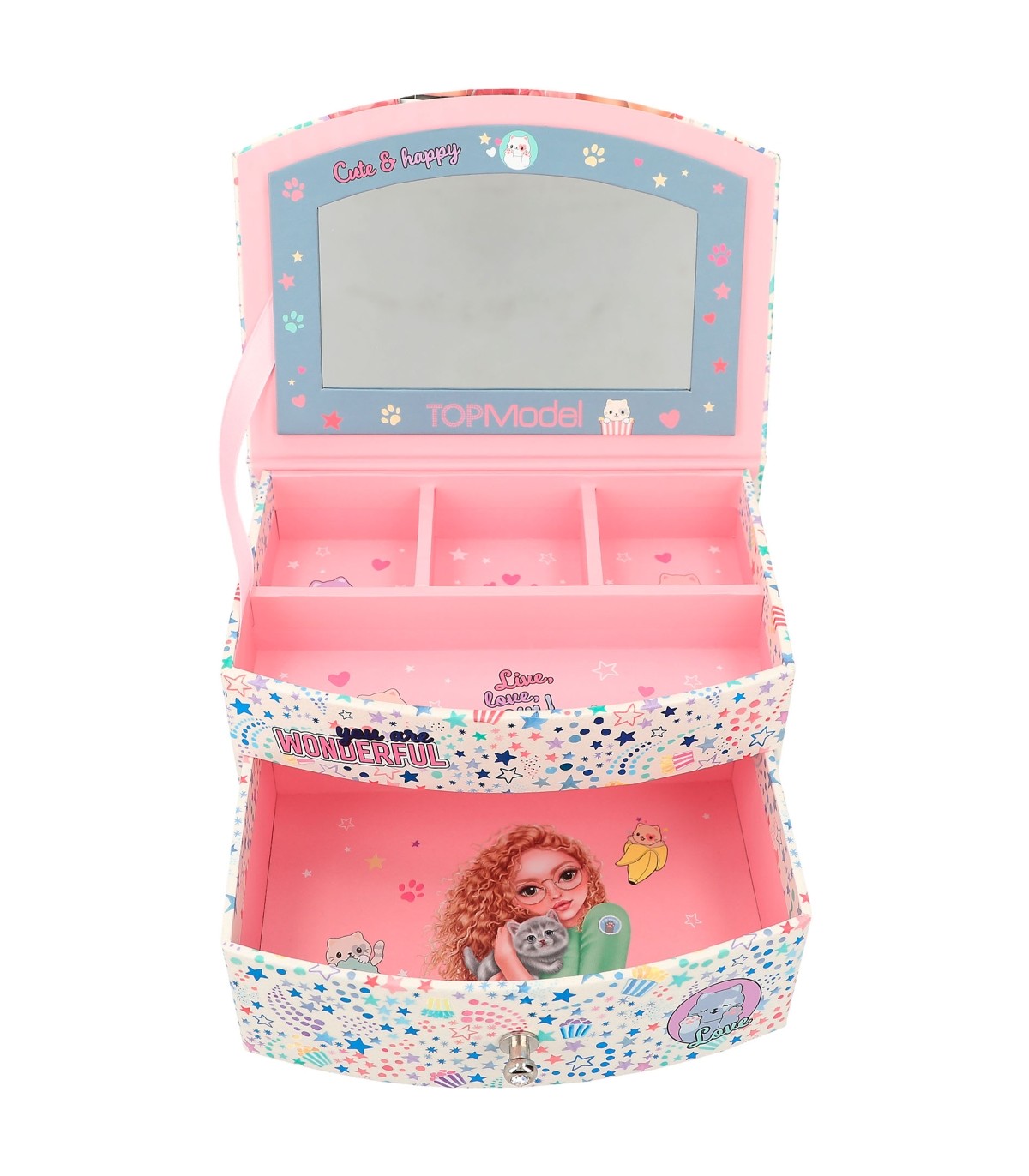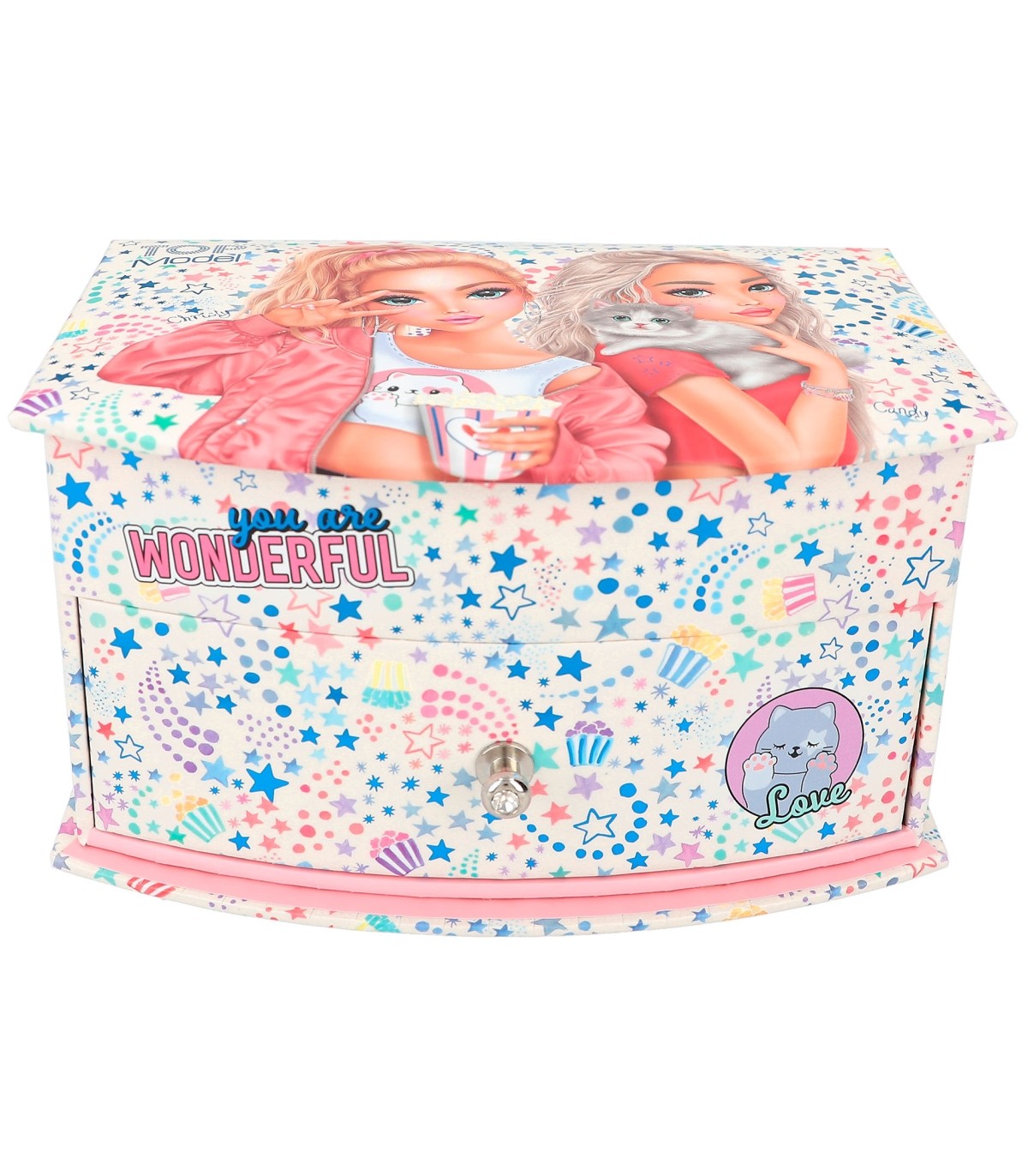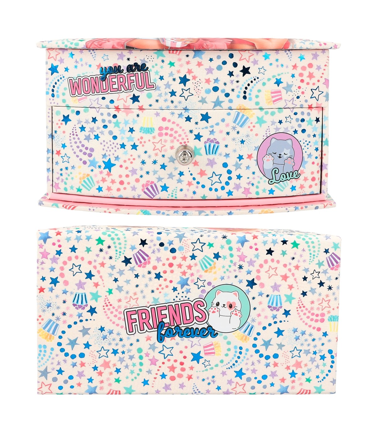 Para guardar las cosas de valor personales. El joyero pequeño Cutie Star de TOPModel está adornado íntegramente con estrellitas monísimas, sobre las que destacan iconos simpáticos como cajas de palomitas de maíz, gatitos monísimos y la imagen de dos modelos a la última. La tapa abatible lleva un espejo en la cara interior. El joyero tiene un compartimento principal subdividido y un cajón grande con un diamante de estrás como tirador.